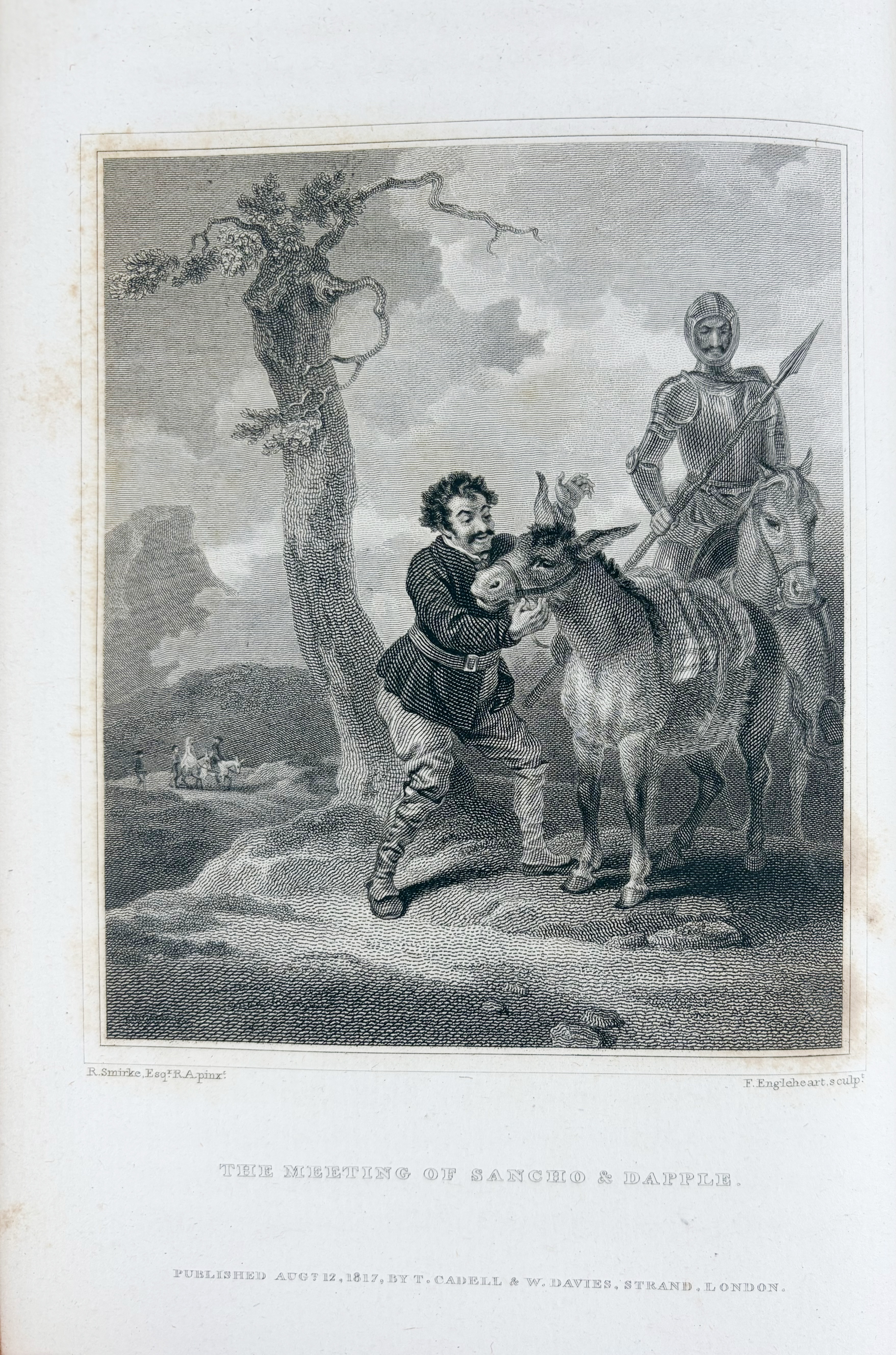 Esteemed edition of Don Quixote, illustrated and translated by a father and daughter team, engraved from paintings of Robert Smirke and translated by his daughter Mary Smirke. Smirke became a full member of the Royal Academy with his paintings on Don Quixote and Sancho in 1793.€ 400