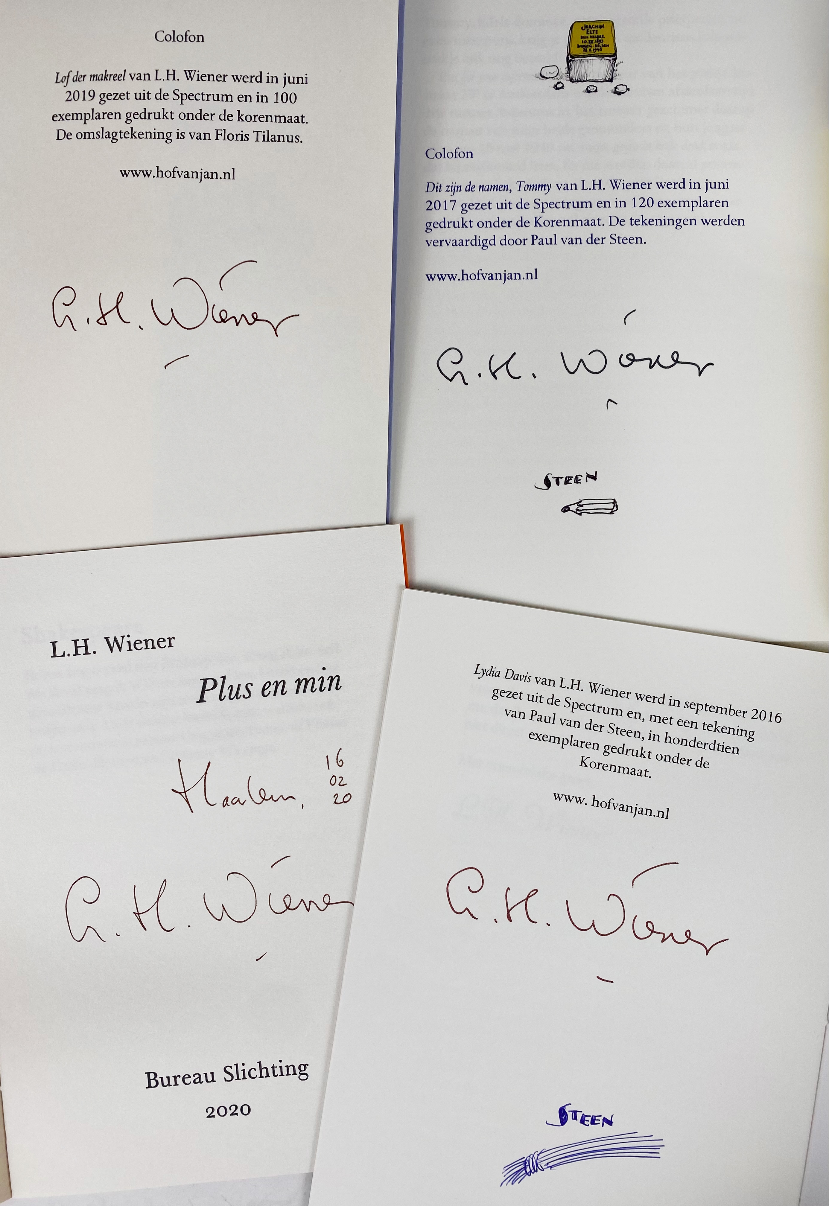 KORENMAAT -- WIENER, L.H. Lydia Davis. Ill. by P. v.d. Steen. - Dit zijn de namen, Tommy. Ill. by P. v.d. Steen. - Lof der makreel. - (Haarl.), Korenmaat, (2016-19). 3 vols. Owrps. Printed in 110/120/100 copies & signed by the author (& artist). -- Added: Id. Plus en min. Bureau Slichting, 2020. Owrps. Pirated ed., printed in a limited ed., signed by the author. -- And: Id. & A.L. SNIJDERS, A.L. L.H. en A.L. / A.L. en L.H. (Utr., Stichting De Roos, 2007). 2 vols. Obrds. In or. paper slipcase. Nr. 6/175. -- (6).