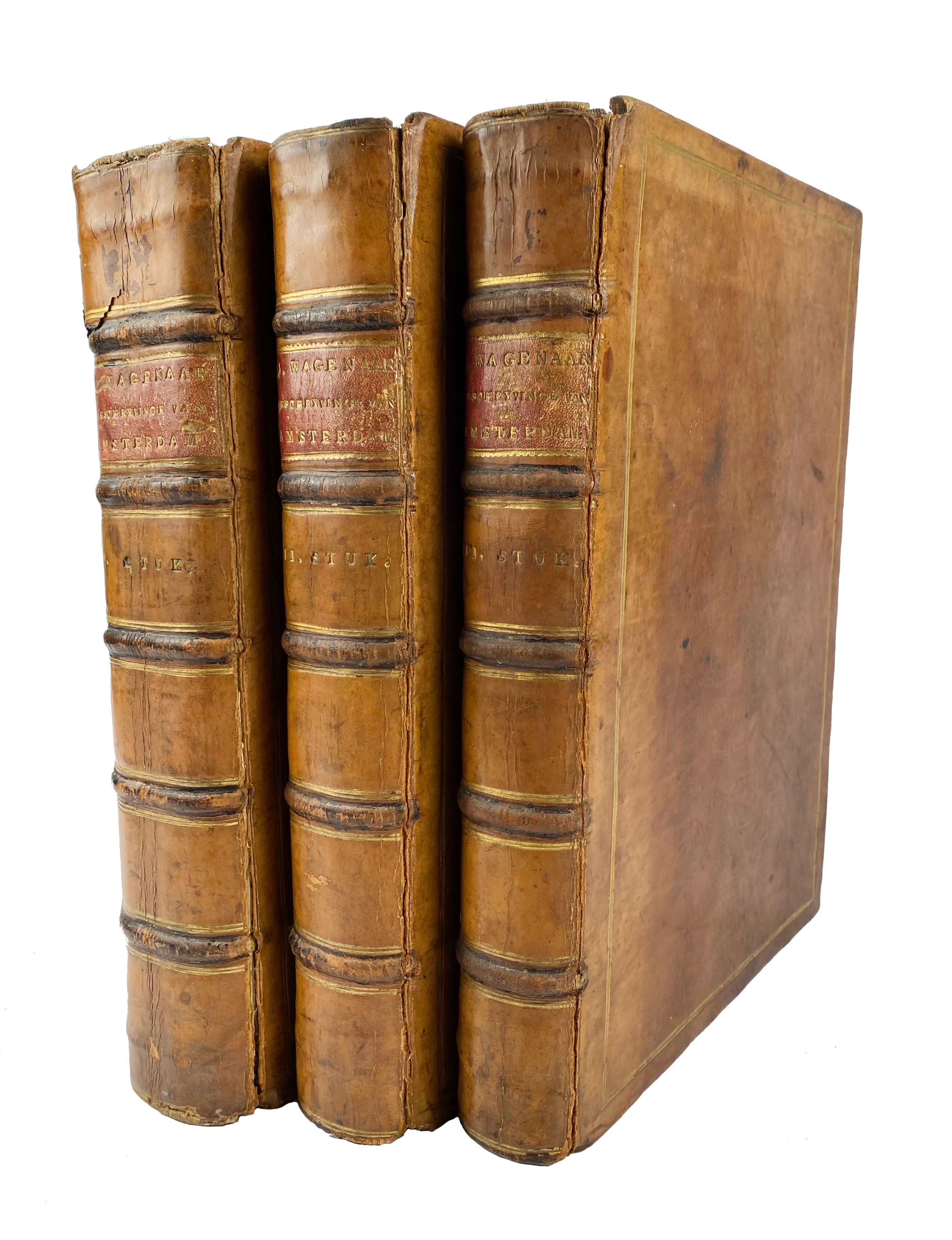 AMSTERDAM -- WAGENAAR, J. Amsterdam, in zyne opkomst, aanwas, geschiedenissen, voorregten, koophandel, gebouwen, kerkenstaat, schoolen, schutterye, gilden en regeeringe. Amst., I. Tirion/Yntema & Tieboel, 1760-67. 3 vols. (10), xxiv, 743; 552; (2), 566; (2), 18 pp. W. 3 identical engr. ti-vign. (coat of arms of Amsterdam), engr. allegorical ti. by R. Vinkeles after C. Ploos v. Amstel, 1 engr. portr. of the author by J. Houbraken and 79 (partly fold.) plates w. engr. maps/plans/views. Fol. Cont. cf. binds. (possibly English?) w. raised bands, sides & spines ruled in gilt. (Joints (partly) split, spine ends a bit dam., tear in upper compartment vol. 1, sl. browned/foxed in places).
