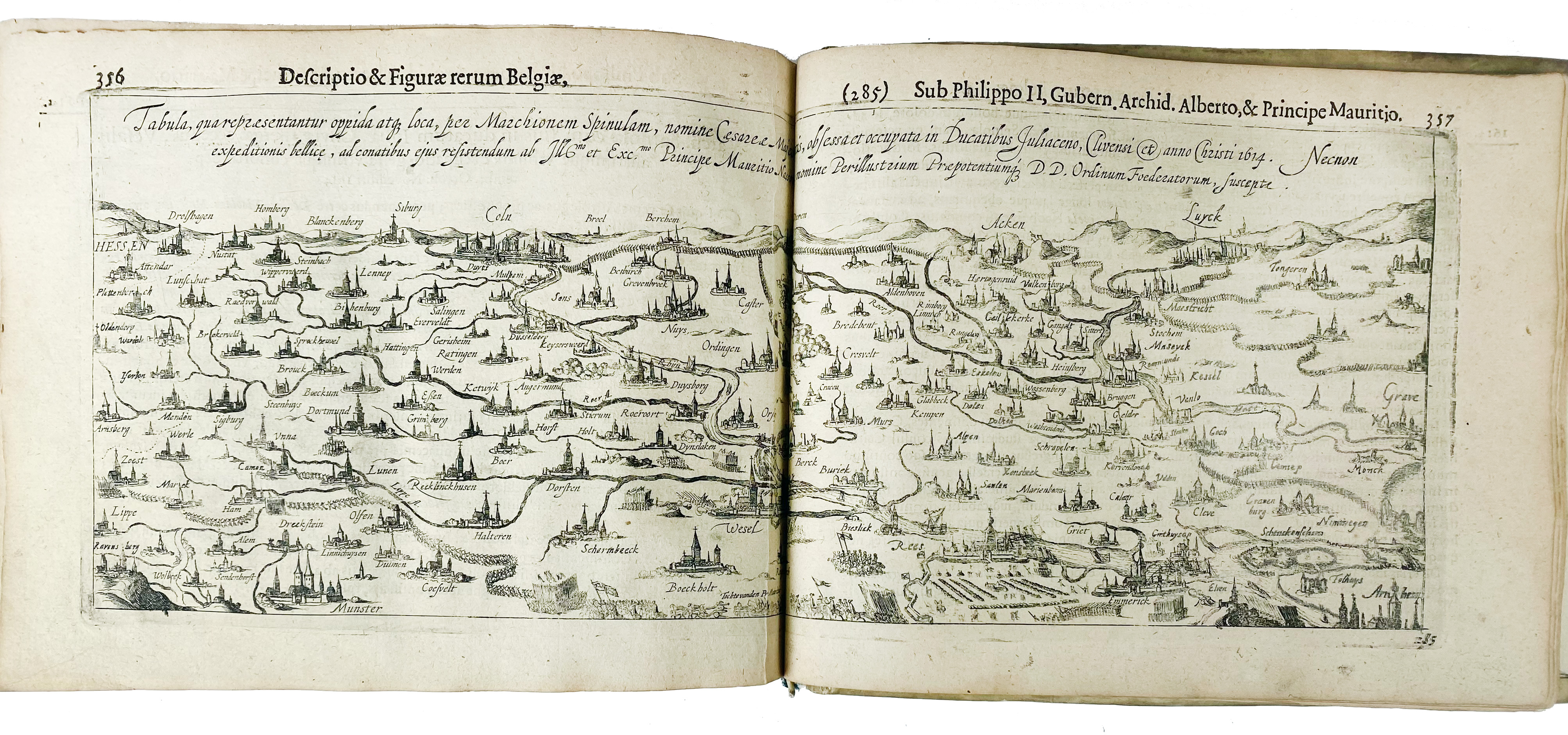 (BAUDARTIUS, W.). Polemographia auraico-belgica. Viva delineatio ac Descriptio omnium proeliorum, obsidionum aliorumque rerum memoratu dignarum, quae, durante bello adversus Hispaniarum Regem in Belgii provinciis (…) gestae sunt. Amst., M. Colinius, 1621-22. 2 in 1 vol. (8), 454; 382, (10) pp. W. engr. ti., 2 woodcut armorials & 285 engrs. (numb. 1-285). 4°-obl. Cont. vellum w. overl. sides. (Owner's stamp on upper paste down, pp. 145-148 misbound, sl. browned else a very good copy).