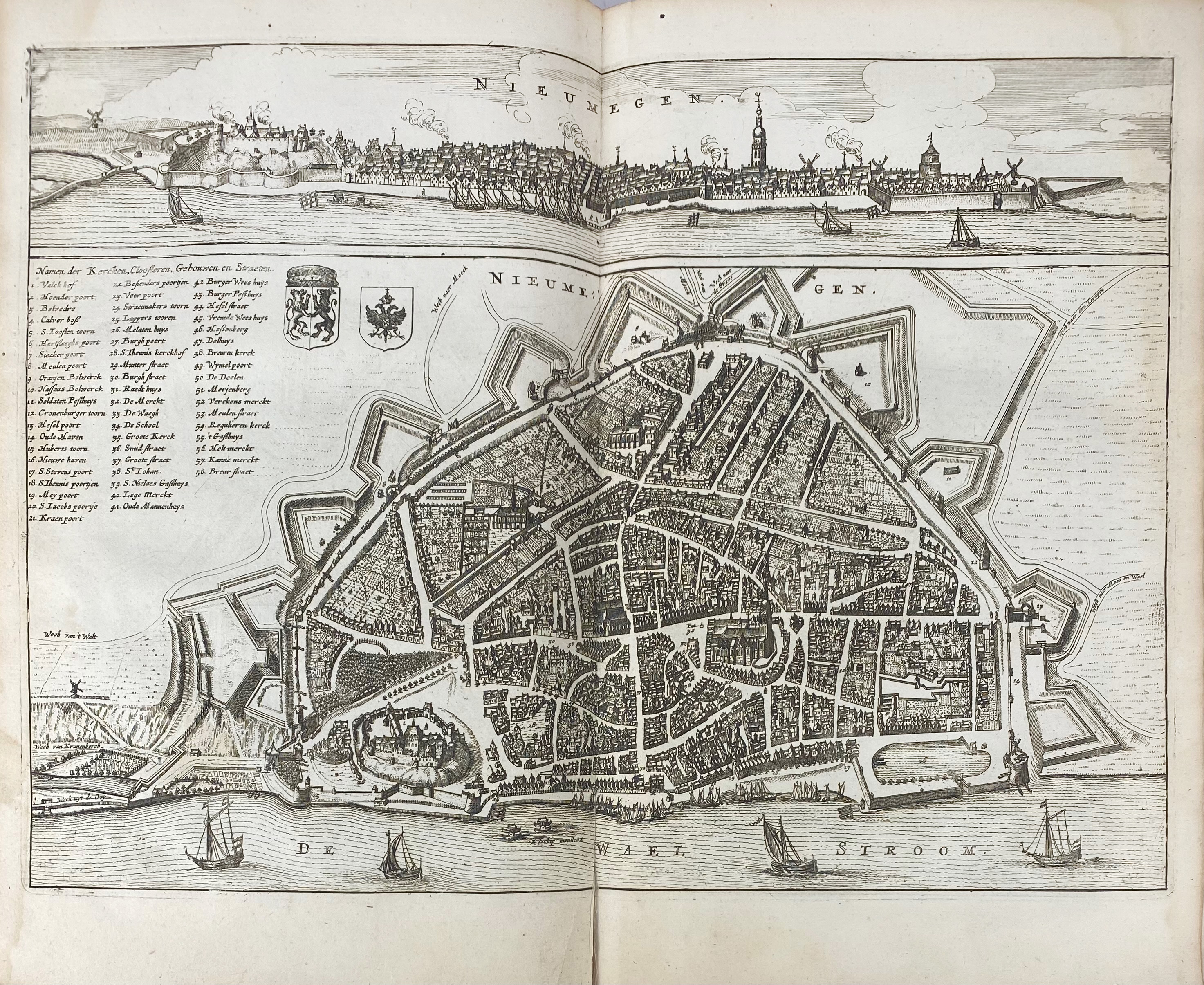 GELDERLAND -- SLICHTENHORST, A. v. XIV Boeken van de Geldersse Geschiedenissen. Arnh., J. v. Biesen, 1654. 2 parts in 1 vol. (16), 116, (4); 596, (24) pp. W. fine engr. ti., 1 lge-fold. map, 20 double-p. maps, plans & views & 24 lge woodcut coats of arms in the text. Fol. Cont. vellum. (Outer margin (faintly) stained throughout, a few plates w. sm. split on fold, else a good and complete copy).