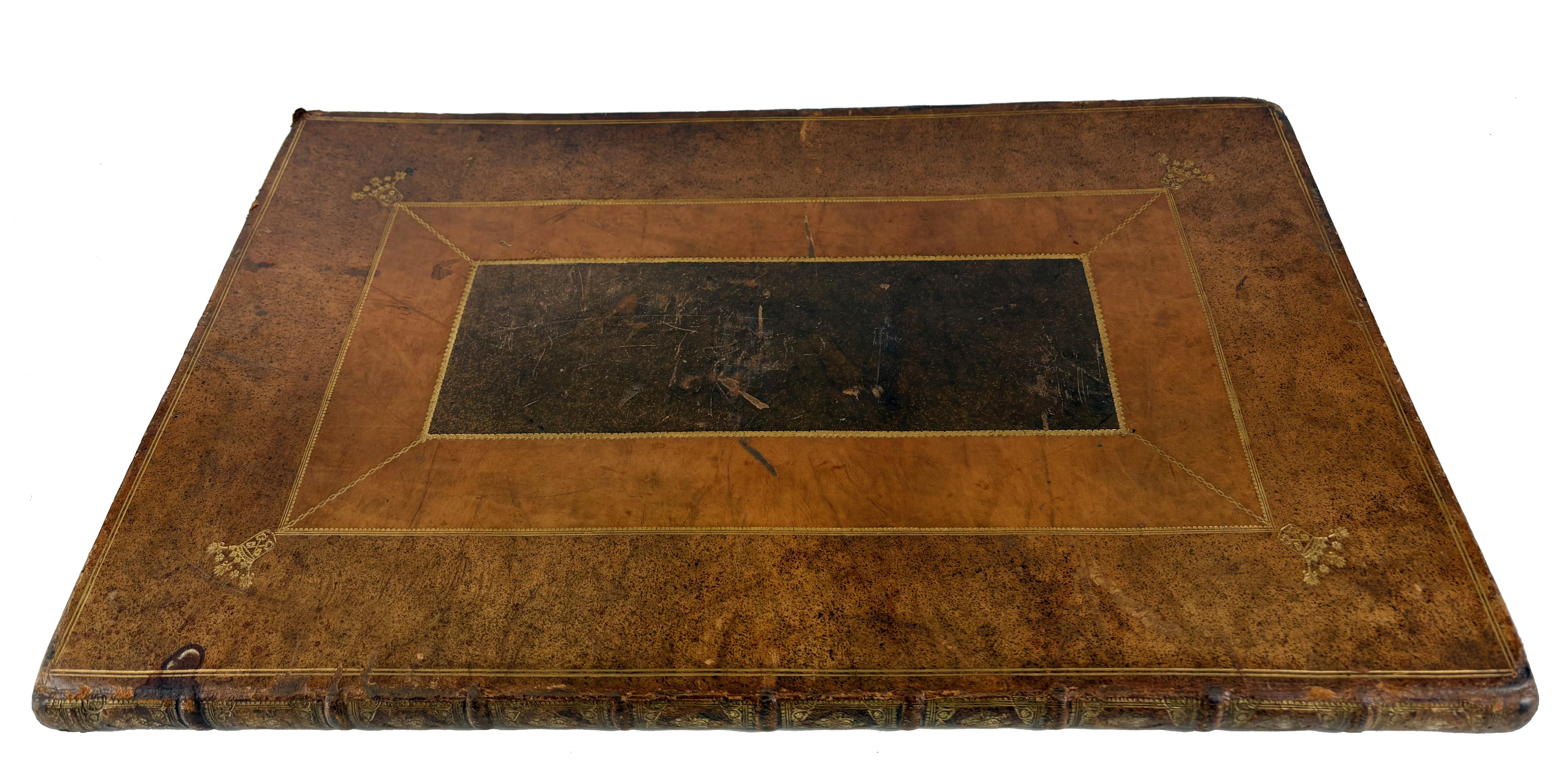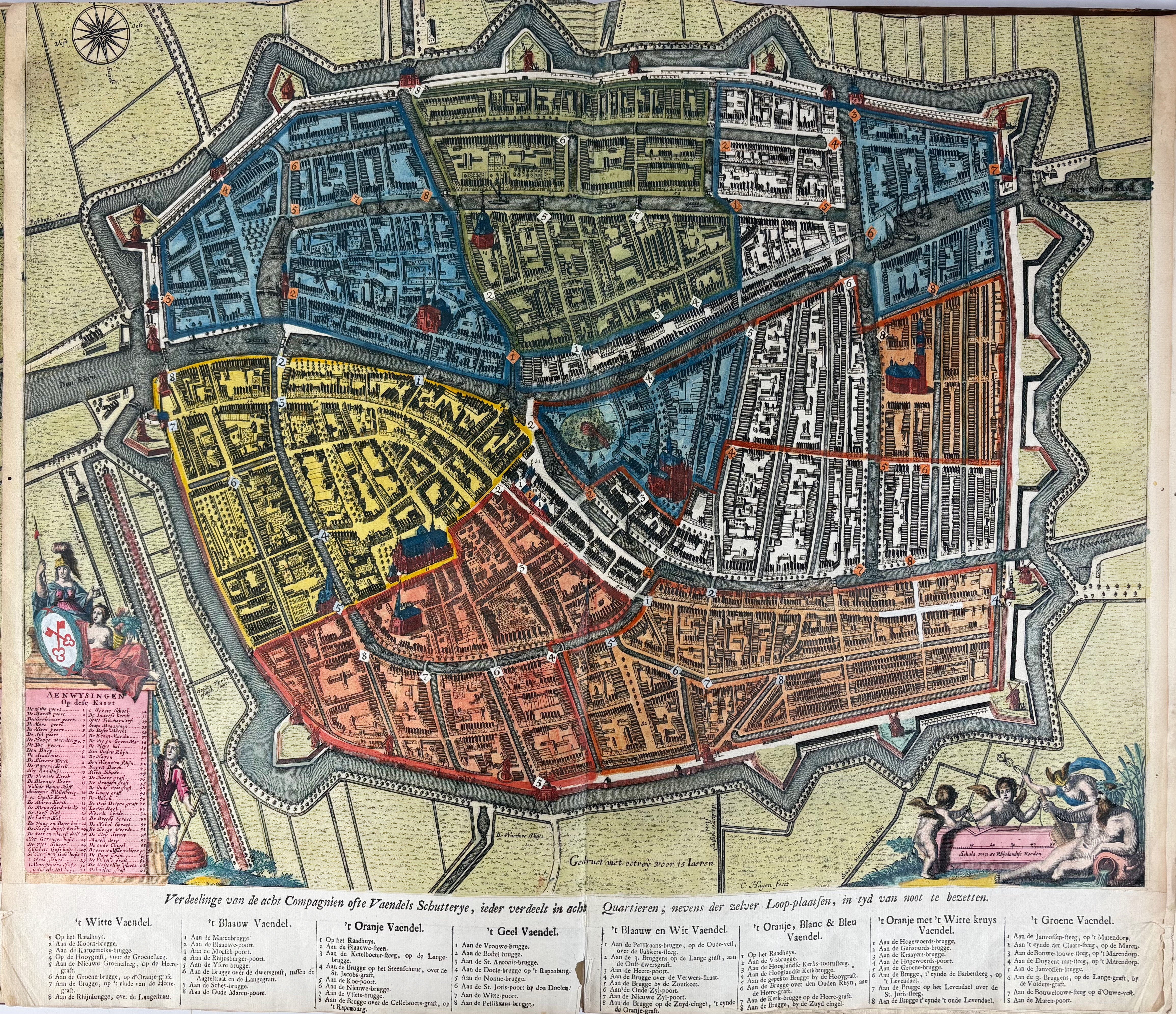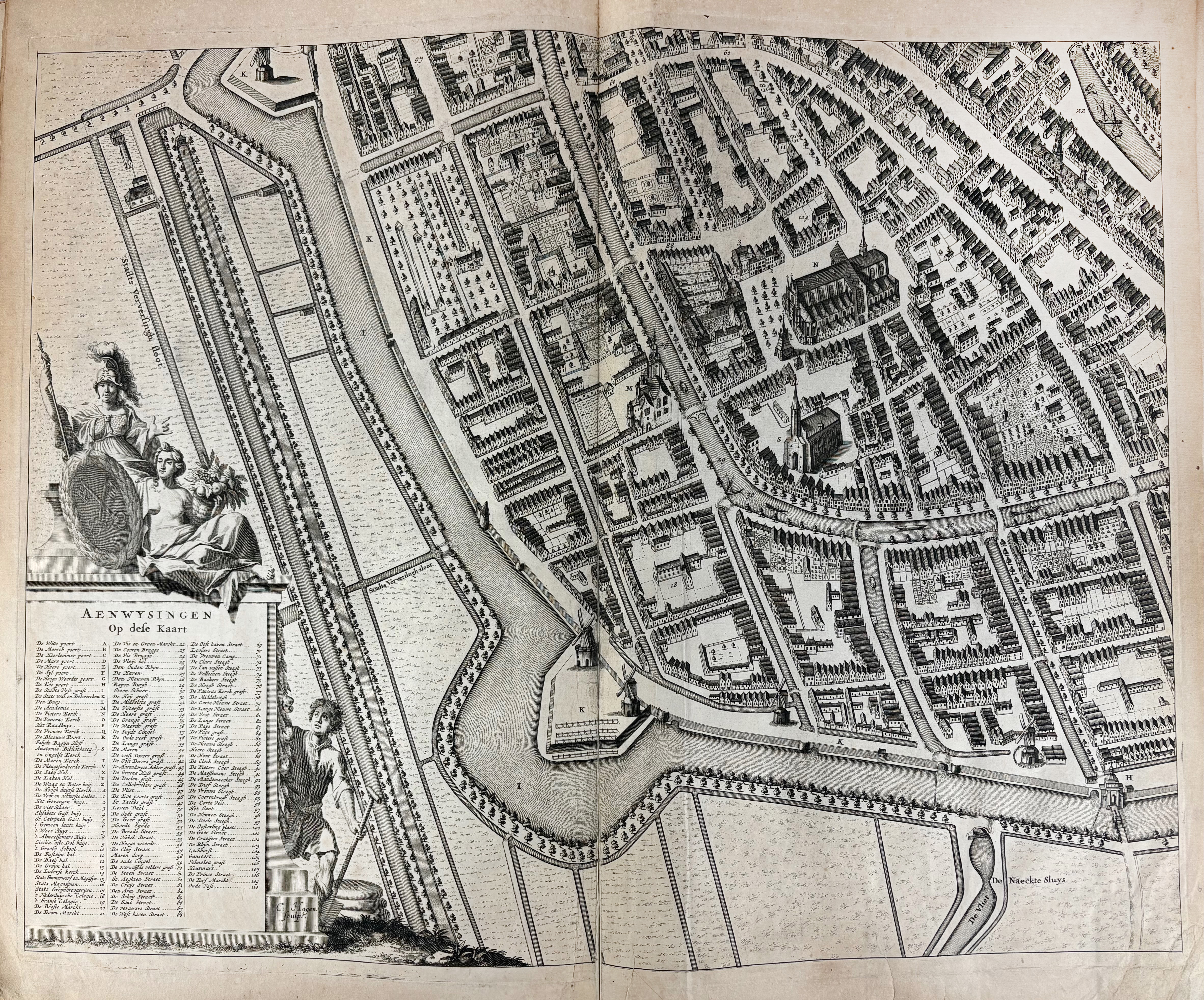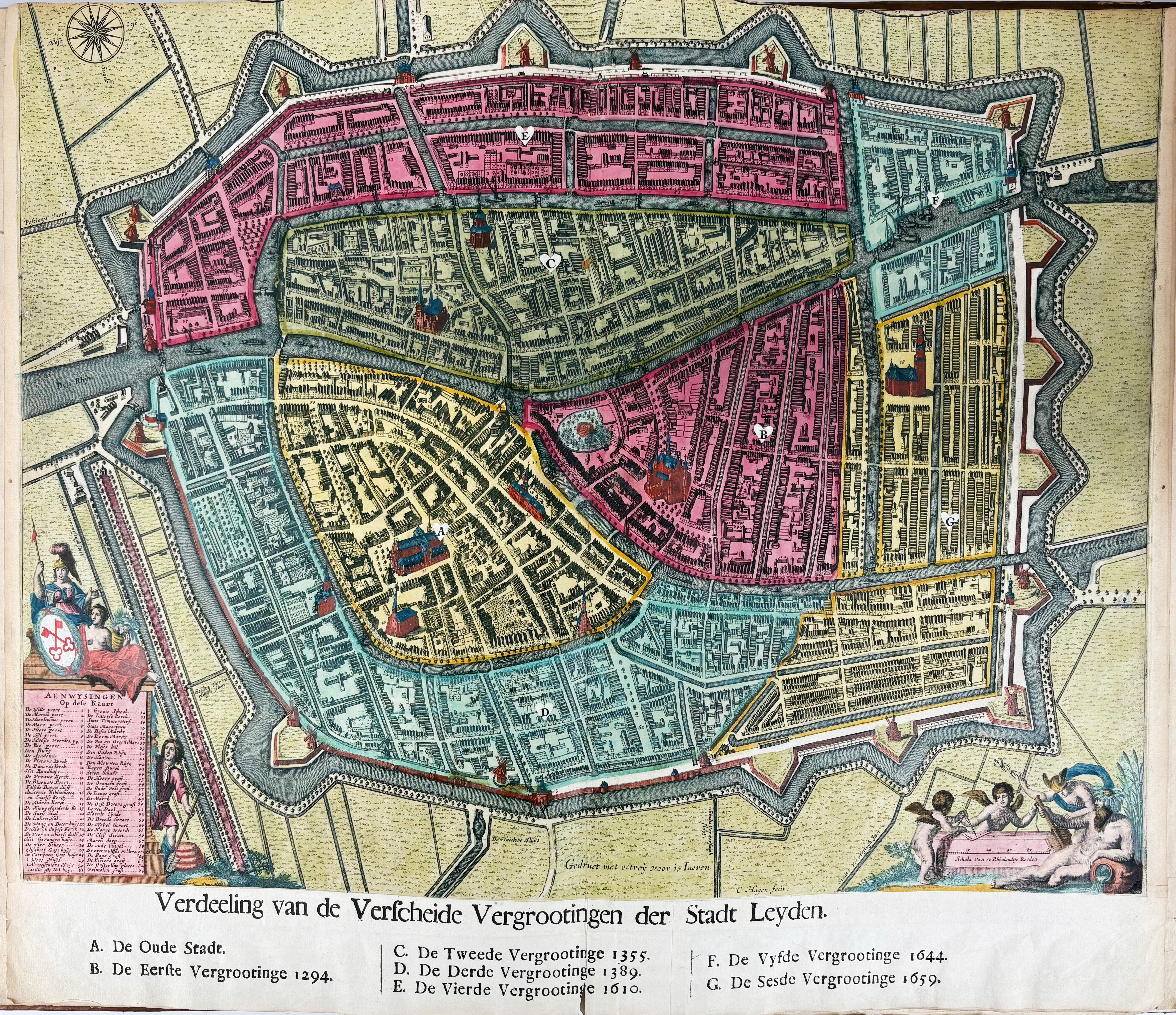 LEIDEN -- "LUGDUNUM BATAVORUM Anno 1670". (Amst., 1674). Large engr. wall plan of Leiden printed on 14 double-p. lvs., comprising a large plan of Leiden on 4 lvs., a panorama view of the city from the South on 3 lvs. (1 w. small split in lower blank margin), tog. 9 views of important buildings on 4 lvs., and 3 lvs. w. the title and 5 armorial engr., all engr. by C. Hagen. - Bound up with: "LUGDUNUM BATAVORUM". (Leiden), 1675. Plain engr. plan of the city by C. Hagen 'crowned' by 4 family crests (representing the mayors of Leiden) and the city arms, on top of a perspective view of the city seen from the South (NB without the 16 views on churches, gates, the academy building, etc.). - Also bound up with 4 copies of the central plan of the 'kleine Hagen' of 1675 in full cont. colouring w. letterpress captions attached to the lower margin: "Verdeeling van de Verscheide Vergrootingen der Stadt Leyden" - "Verdeelinge en Naamen van de XXVII Bonnen der Stadt Leyden" - "Verdeelinge van de acht Compagnien ofte Vaendels Schutterye, (…)" - "Verdeelinge en Namen van de Qartieren der Huyszitten-Meesters". - Tog. 16 double-p. and 4 full-p. plates in 1 binding. Lge-fol. 18th c. panelled and mottled cf., covers w. gilt ornamental rules, all corners w. gilt coats of arms of Leiden. (Plan of 'Grote Hagen' unfortunately w. rather clumsily closed tears and rumpled in places, no loss of image however).