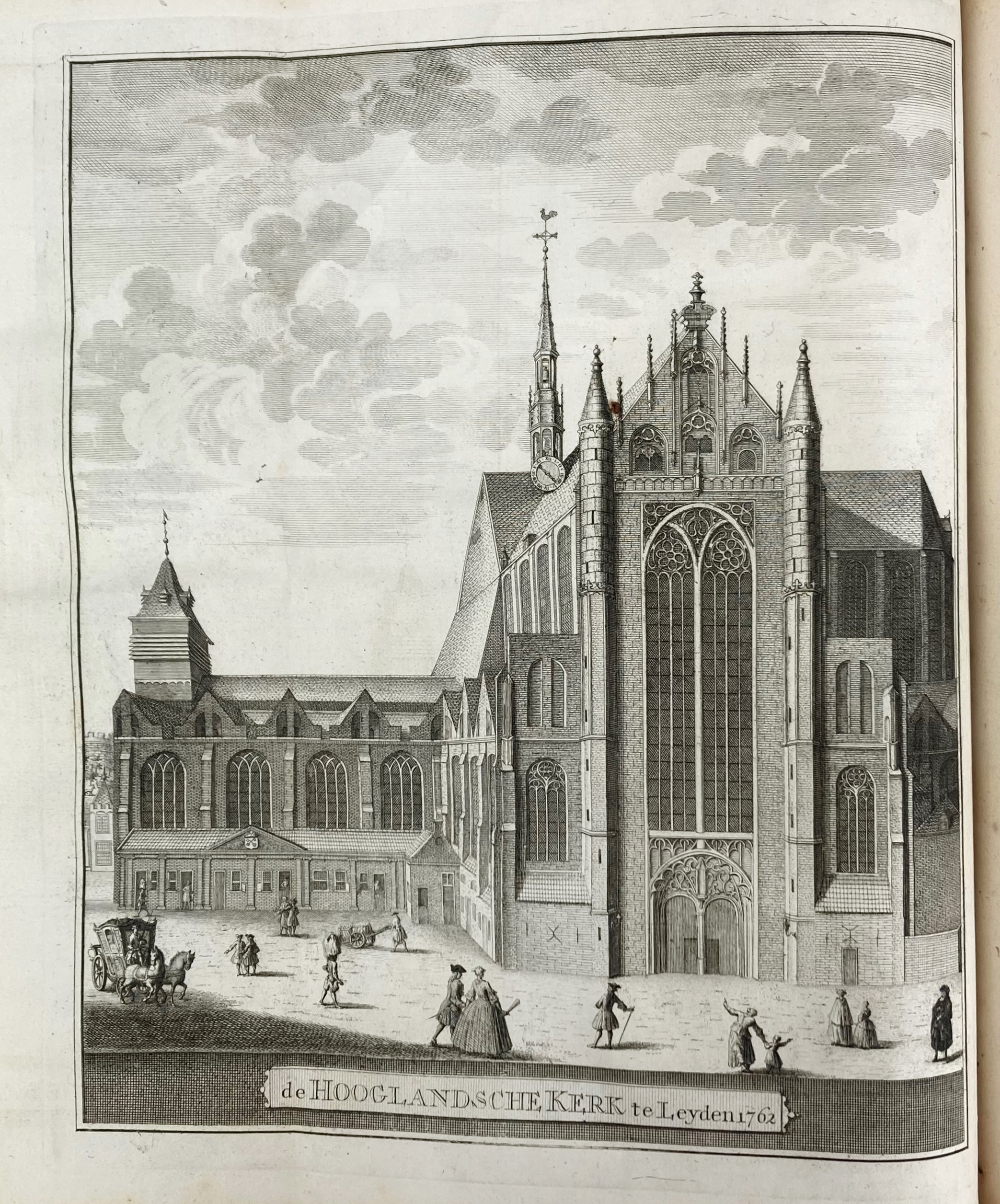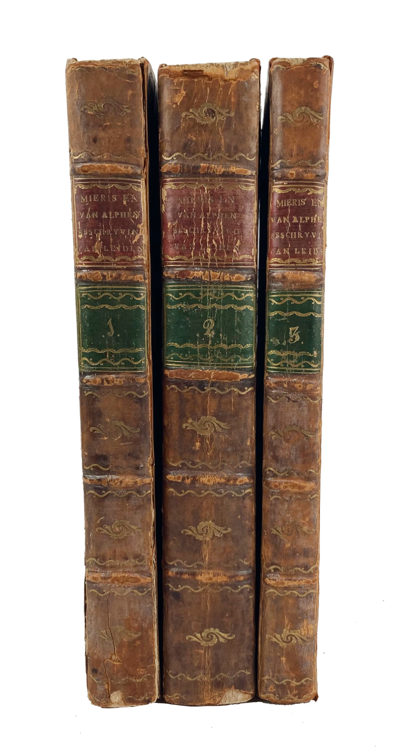 LEIDEN -- MIERIS, F. v. Beschryving der stad Leyden. Met een Byvoegzel verm. en uitgegeeven d. D. v. Alphen. Leyden, Honkoop & Van Hoogeveen, 1762-84. 3 vols. (20), 362, 90; (4), xxvi, (2), 24, -363-860, 68, 78; (4), viii, -865-1137, 106 pp. W. 3 engr. ti-vign., dedic. engr., 1 double-p. plan, 14 views on 7 plates, 16 engr. plates (some (lge-)fold.), partly by A. Delfos after J. de Beyer. Fol. Cont. hcf., spine w. raised bands, red & green letterpiece & gilt lettering. (Spine ends dam., joints partly split, sides chafed w. wear to extremities, insides w. some yellowing & foxing in places, copy on regular paper).