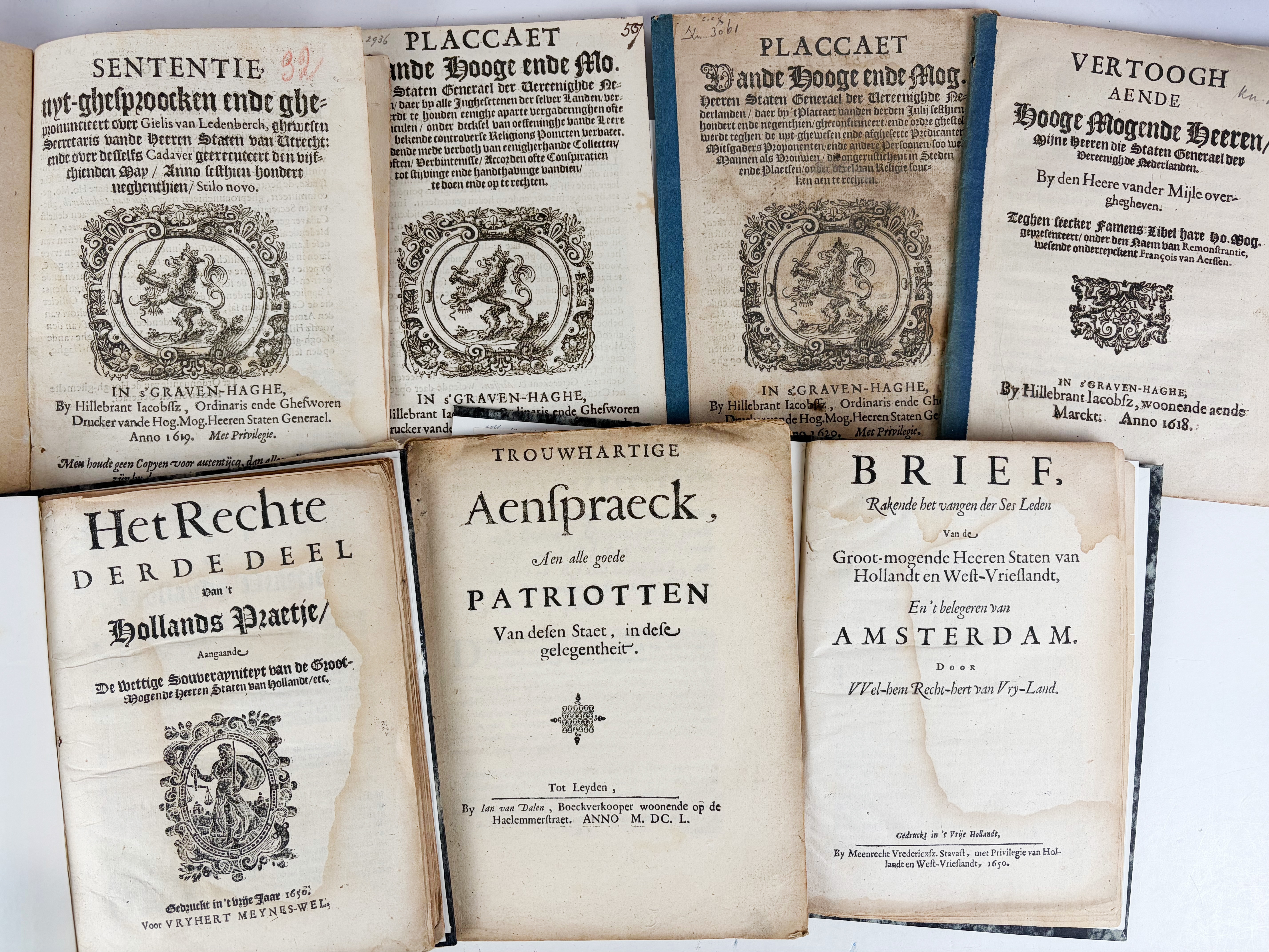 PAMPHLETS -- TASSIS, B. de. Translaet van sekeren Spaenschen Brief (...) inde Middelandtsche Zee geintercipieert (...) Daer uyt claerlijck blijct dat den Spangnaert ende Spaensche Raedt allnoch volherden in hare voornemen om met gewelt dobbelheyt ofte bedroch hare Generale heerschappie of tyrannie alomme (en namelijck voor al inde Nederlanden) te versekeren (...). (2nd ed.). The Hague, A. Heyndricksz., 1596. (3), 26 pp. W. woodcut ti-vign. Sm-4°. Brds. -- Added: 7 o. pamphlets on Dutch history. (8).
