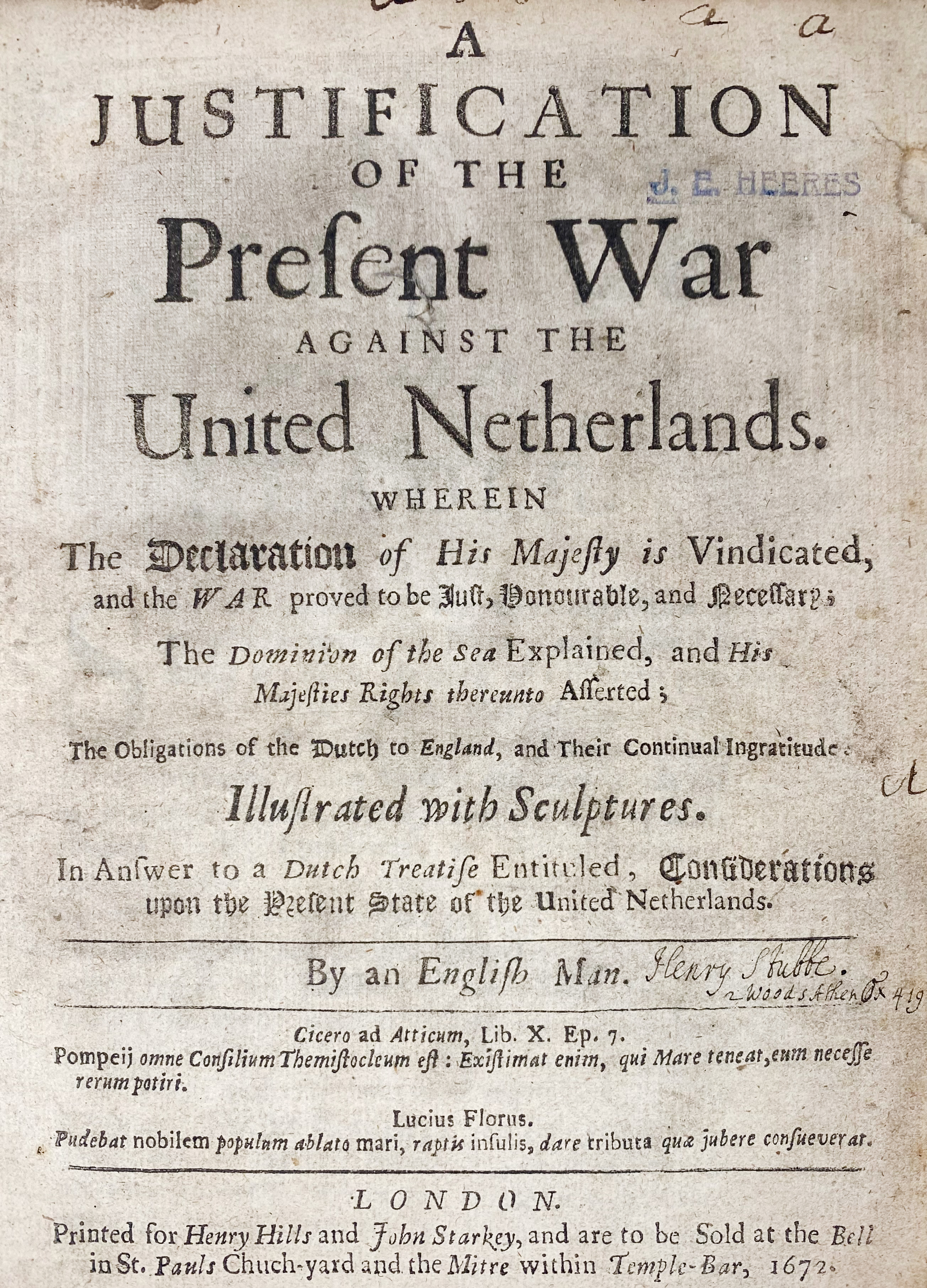 A rare work in defence of Charles II's war with the Dutch. It describes i.a. the torture of the English by the Dutch on Amboina, the unfair behaviour of the Dutch in defending their own interests abroad (i.a. in their colonies) etc. - Knuttel 10017; Sabin 93225 and 93225 note; Wing S6051 and S6046. - With bookplate of Bernard Edward, Duke of Norfolk. - Sold w.a.f., not subject to return.