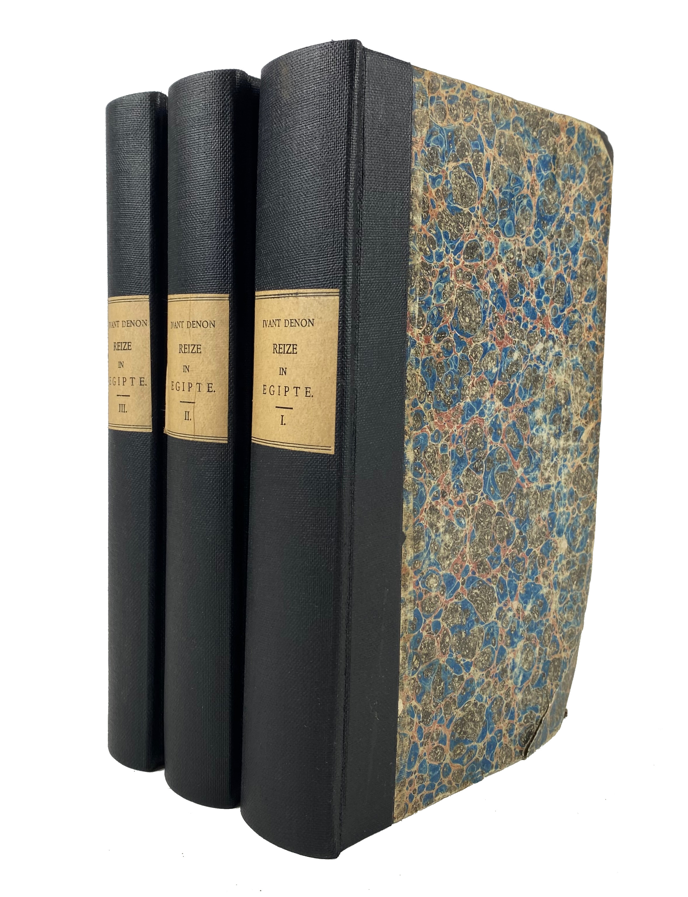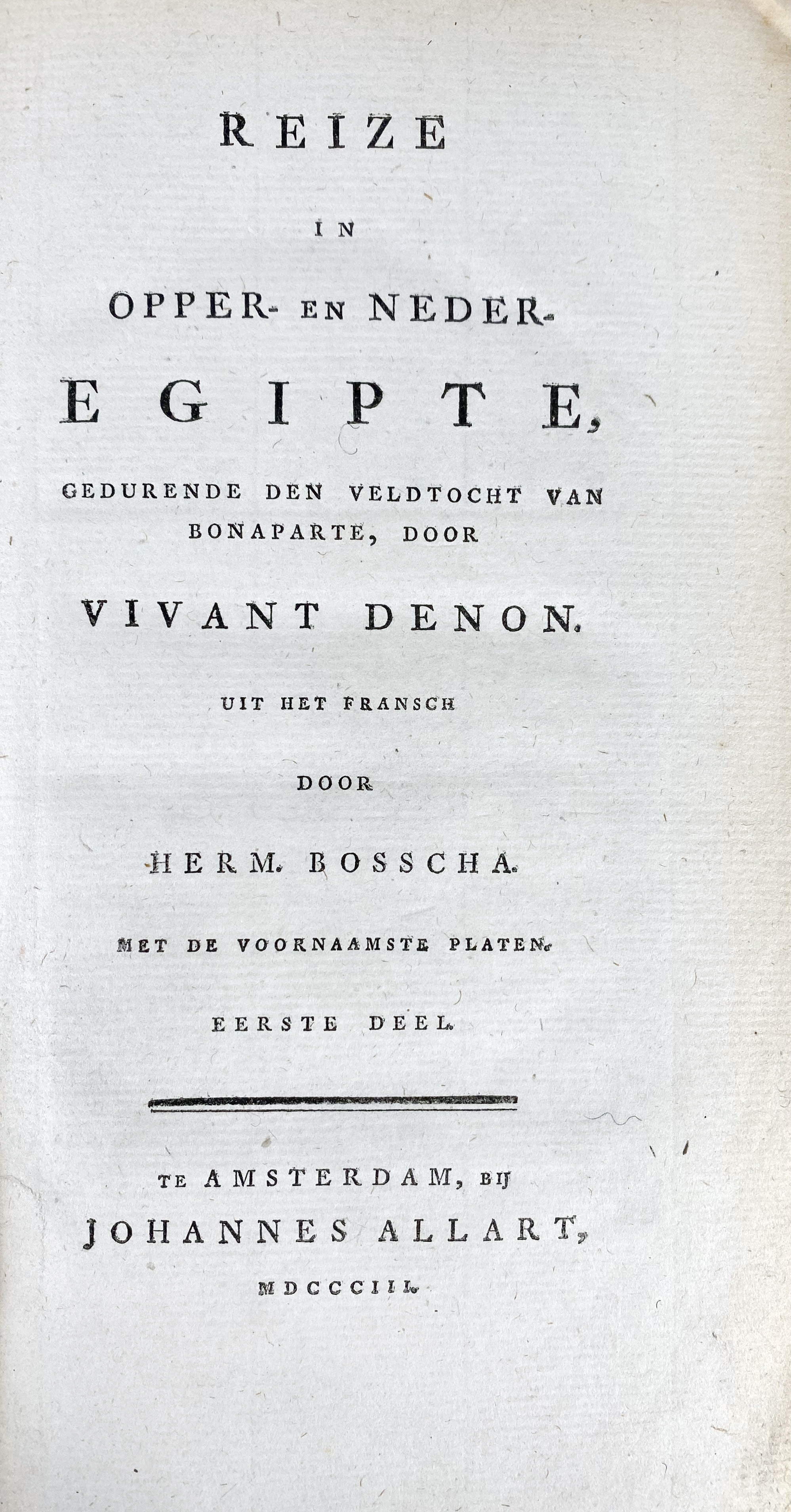 EGYPT -- DENON, V. Reize in Opper- en Neder-Egipte, gedurende den veldtocht v. Bonaparte. Uit het Fransch d. H. Bosscha. Amst., 1803-05. 3 vols. xxx, 323, (2); (2), 311; (6), 192, 63 pp. W. 2 fold. engr. maps of Lower and Upper Egypt and 40 (of 41) numb. plates (38 fold., 2 full-p. and incl. 5 'bis' plates), engraved by Vinkeles and Vrijdag and a fold. letterpress leaf with Greek writing and the Dutch translation. Mod. hcl. w. old paper letterpieces on spines.