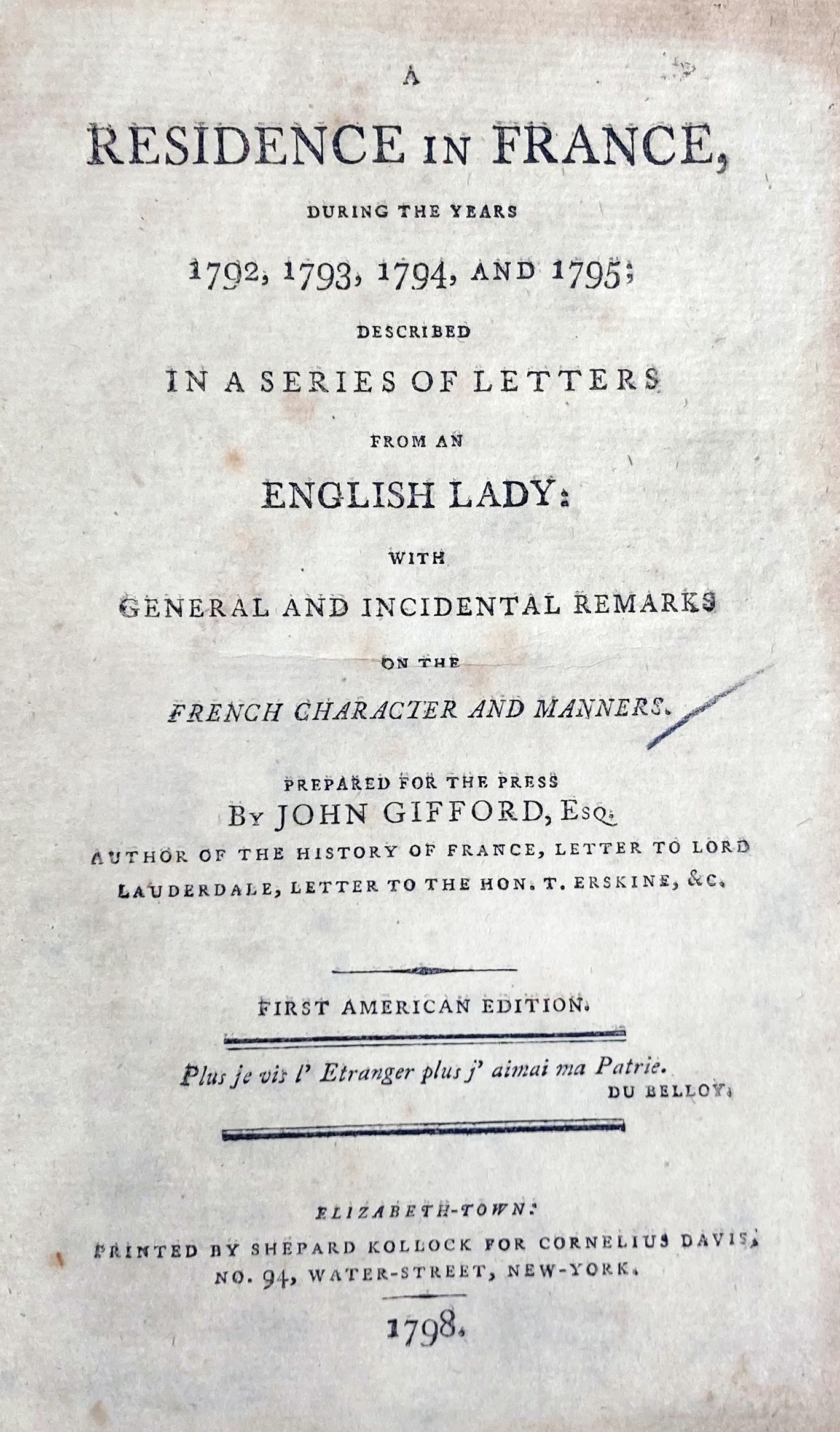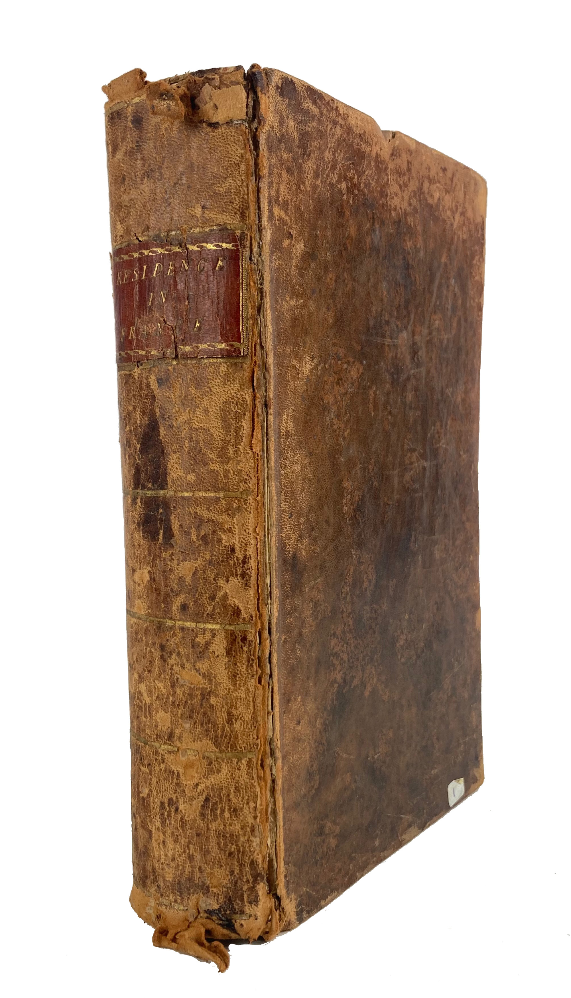 FRENCH REVOLUTION -- A RESIDENCE IN FRANCE during the years 1792, 1793, 1794, and 1795, described in a series of letters from an English Lady; with general and incidental remarks on the French character. 1st American ed. Elizabeth-town, C. Davis, 1798. Cont cf. w. gilt ruled spine & red letterpiece. (Age-toned in places).