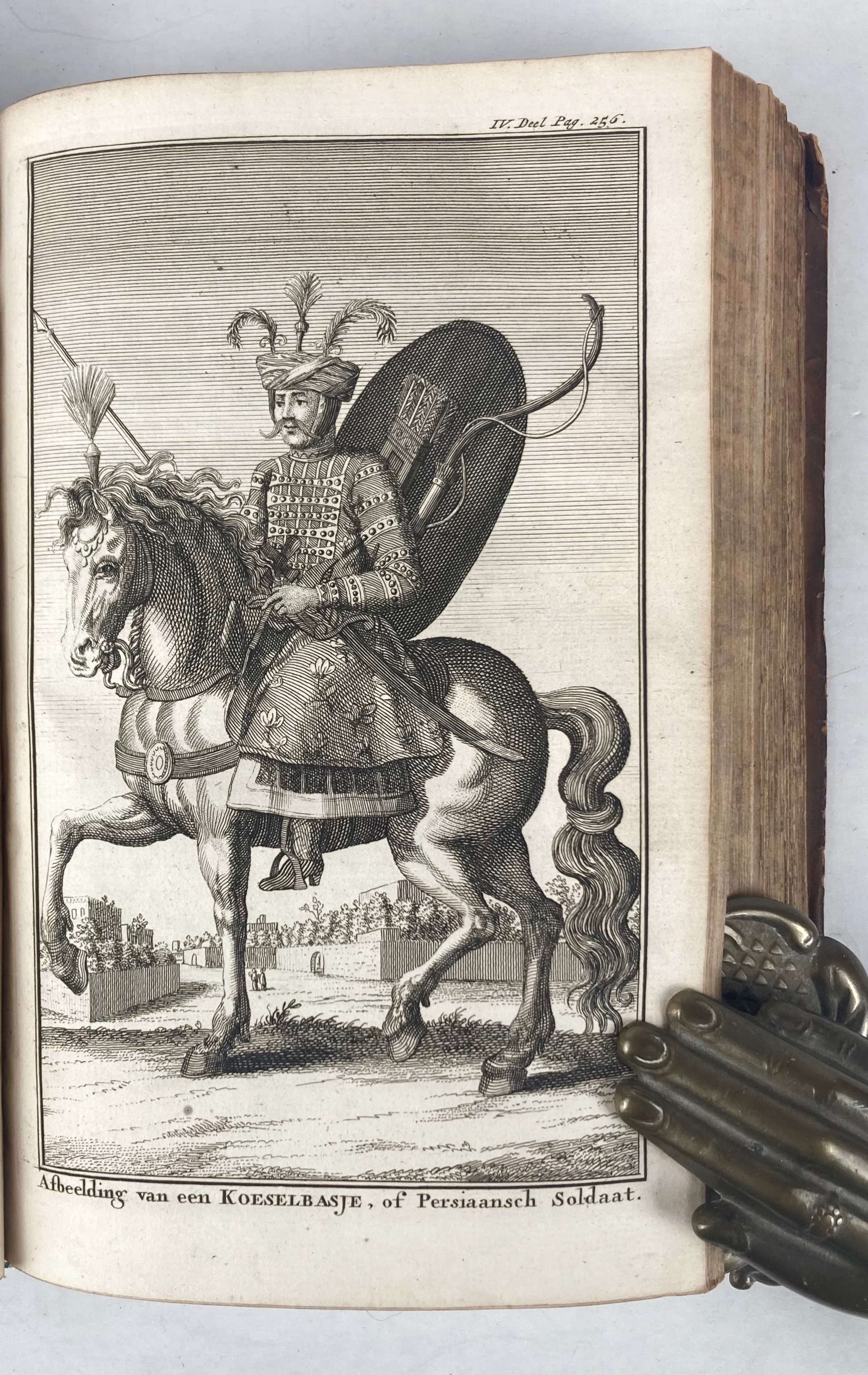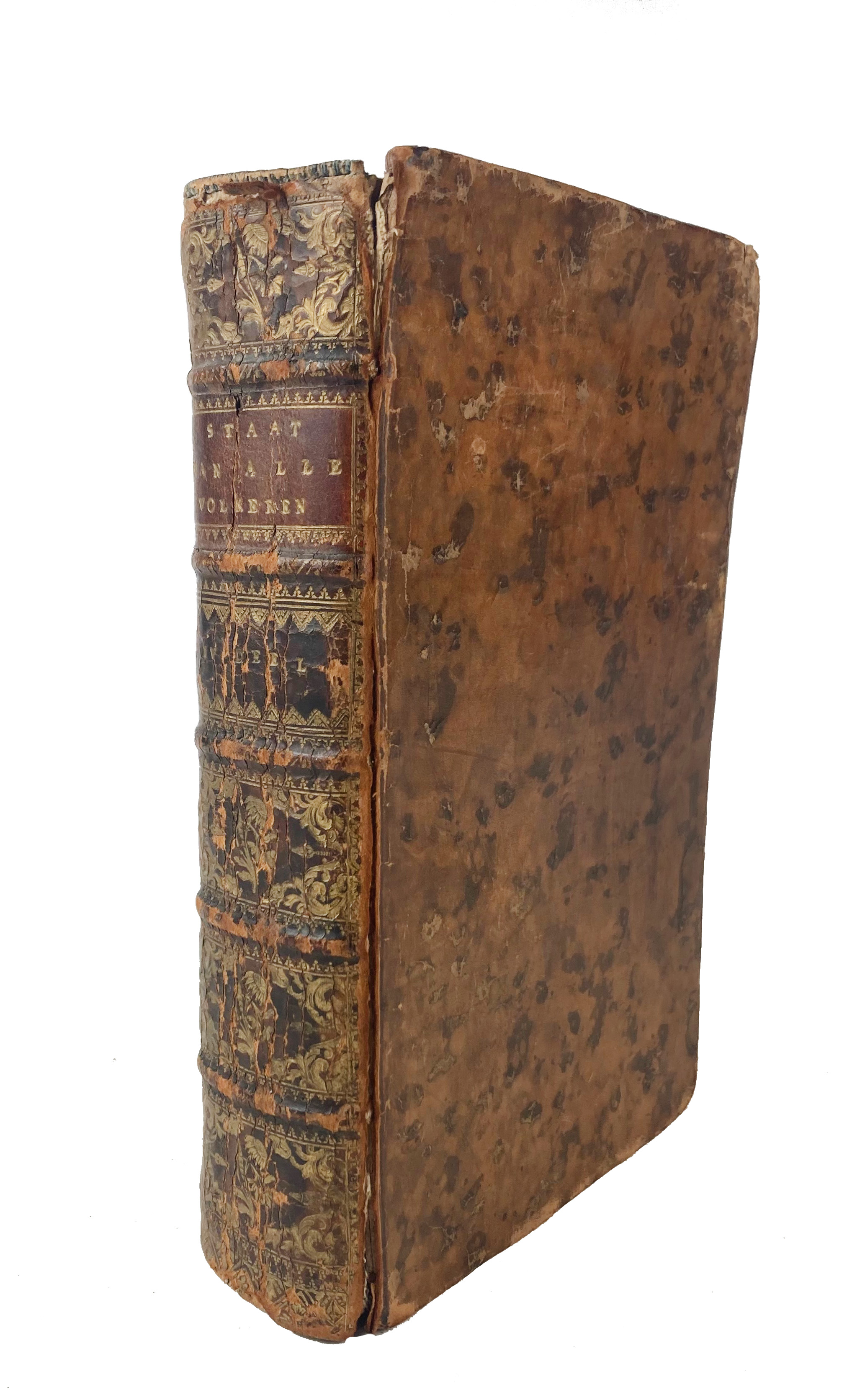 HEDENDAAGSCHE HISTORIE, of tegenwoordige staat van alle volkeren. Dl. 4: Persia, Arabia, en het Asiatisch Tartaryen. Amst., I. Tirion, 1732. 6 parts in 1 vol. (8), 638, (16) pp. W. engr. front., 3 fold. maps, 7 fold. views & 2 full-p. engr. Cont. cf. w. raised bands, gilt dec. & red label.