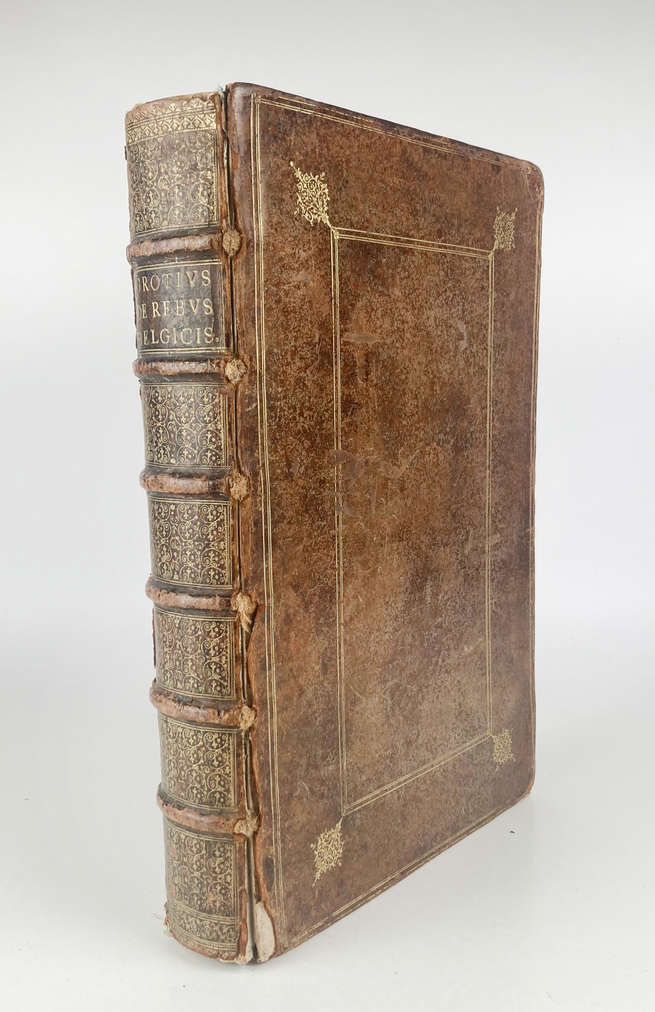 GROTIUS, H. Annales et historiæ de rebus Belgicis. Amst., J. Blaeu, 1657. (16), 569, (22) pp. W. woodcut printer's mark on ti. & engr. portr. of the author. Cont. cf, spine w. raised bands, gilt dec. & lettering, sides ruled & dec in gilt, speckled edges, large paper copy. (Spine bands chafed, spine ends dam., hinges broken but holding, some annot. in an old hand on flyleaf, neat circular hole on title-p (stamp or similar removed?) repaired w. paper).