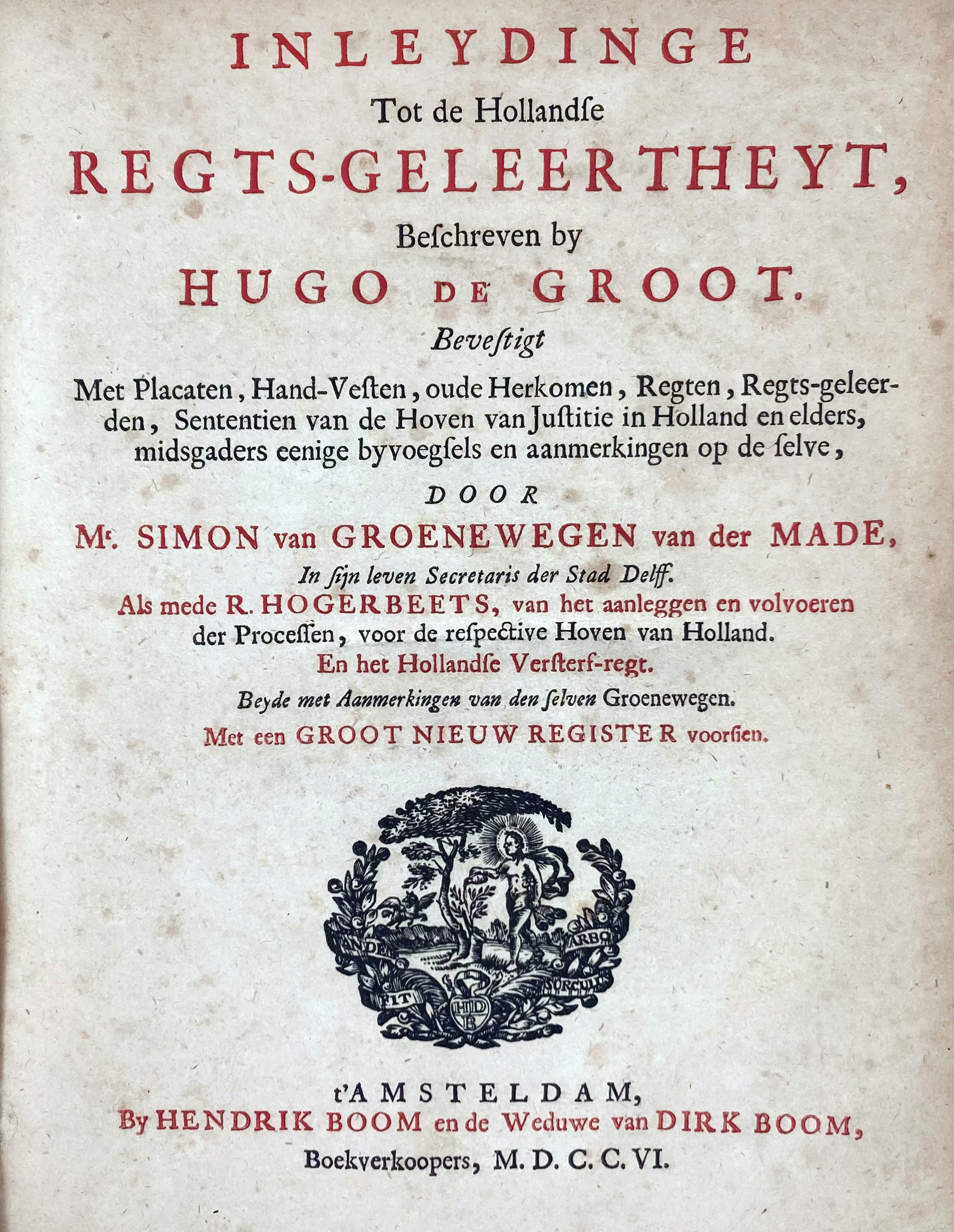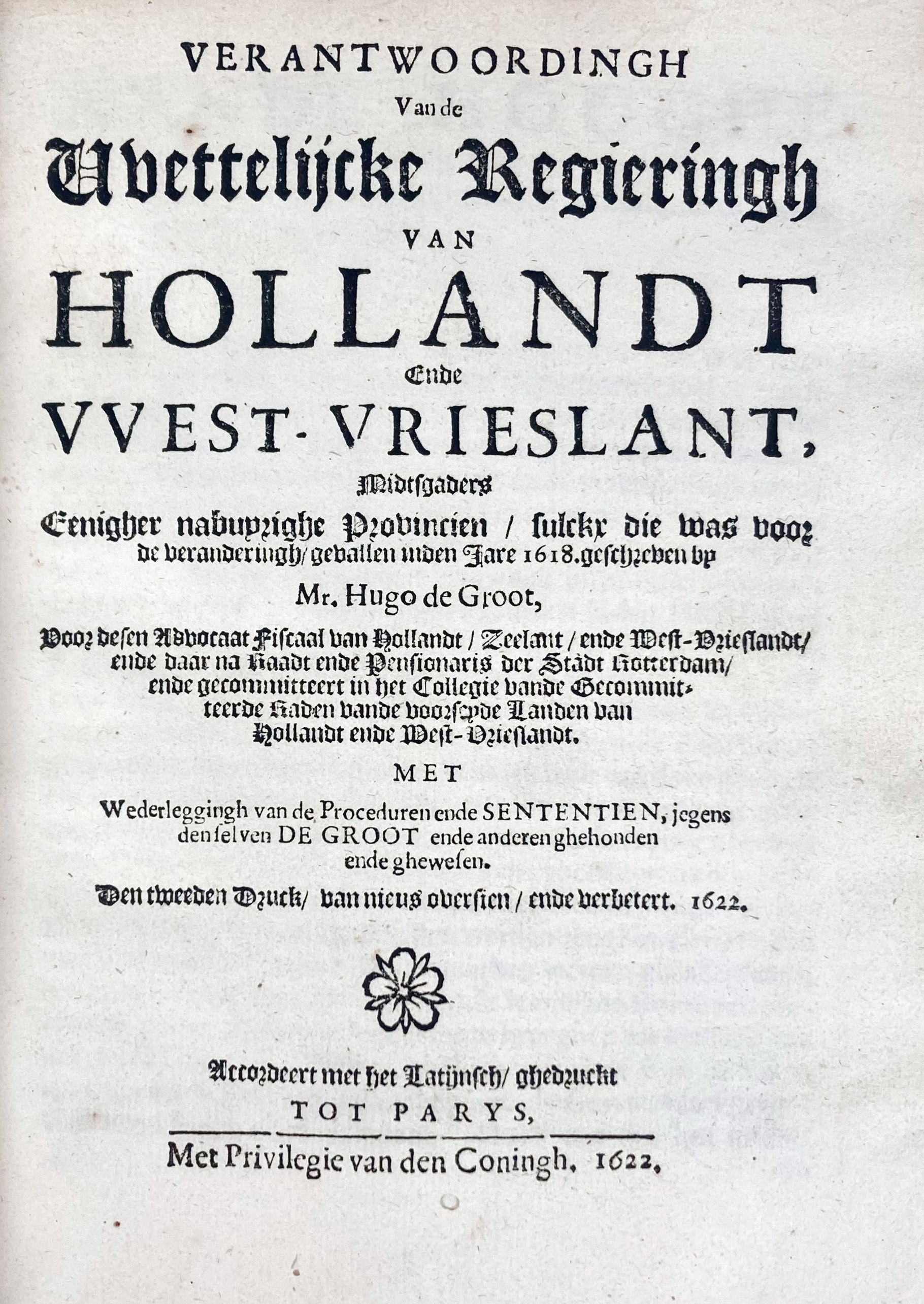 GROTIUS, H. Verantwoordingh v.d. wettelijcke regieringh van Hollandt ende West-Vrieslant. Midtsgaders eenigher nabuyrighe provincien / sulcx die was voor de veranderingh (…) met wederleggingh v.d. proceduren ende sententien, jegens den selven de Groot ende anderen ghehouden ende ghewesen. 2e dr. Par., 1622 (=1623). 15, 287 pp. - Bound with: VERHAEL VANDE HEEREN Joncker Adrian van Mathenes (…). (N.pl.), 1622. (2), 44 pp. -- 2 in 1 vol. 4°. Cont. vellum w. speckled edges. (Vellum torn from upper & lower side, some neat marginal annot. & scores in pencil & ink). -- Id. Inleydinge tot de Hollandsche regts-geleertheyt. Bevestight met placcaten, (etc.), d. S. v. Groenewegen v.d. Made. - Followed by: R. HOOGERBEETS. Van het aen-legghen ende volvoeren der processen voor de respective Hoven van Iustitie in Holland. En het Hollantsche versterf-regt, (...). Amst., H. Boom & Wed. D. Boom, 1706. (8), 322, (1), 325-356, (36). 4°. Cont. vellum. (Handwritten title on spine & front side, yellowing). -- (2).