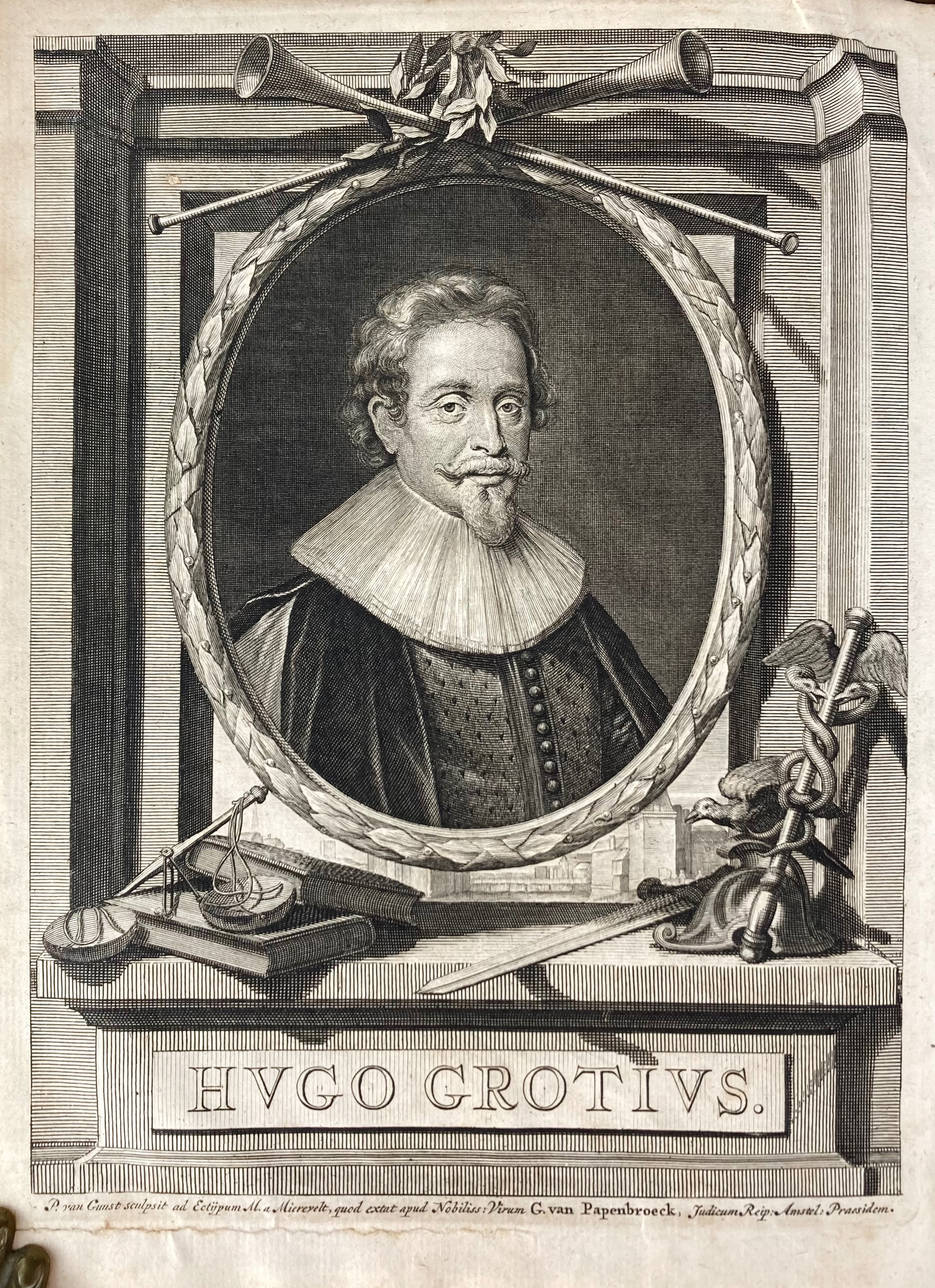 GROTIUS, H. Verantwoordingh v.d. wettelijcke regieringh van Hollandt ende West-Vrieslant. Midtsgaders eenigher nabuyrighe provincien / sulcx die was voor de veranderingh (…) met wederleggingh v.d. proceduren ende sententien, jegens den selven de Groot ende anderen ghehouden ende ghewesen. Par., 1622 (= Hoorn, I.W. v.d. Beeck, 1623). 15, 299 pp. 4°. - Bound with: TEN SENTENCES, LETTERS & ANNOUNCEMENTS concerning H. Grotius, J.v. Oldenbarneveldt, R. Hogerbeets e.a. The Hague, 1619-22. C. 50 pp. - Later cf., spine w. raised bands & red letterpiece, gold lettering. -- Id. Le droit de la guerre, et de la paix. Nouv. trad. p. J. Barbeyrac. Amst., P. de Coup, 1724. 2 in 1 vols. (8), xliii, (3), 518; 519-1001, (39) pp. W. 2 identical ti-vign., dedicatory engr. & frontispiece-portr. of H. G. by P. v. Gunst. Lge-4°. Cont. cf, spine w. raised bands, gilt dec. & brown letterpiece. (Discreet ticket on spine, portr. discreetly repaired w. tape). -- (2).
