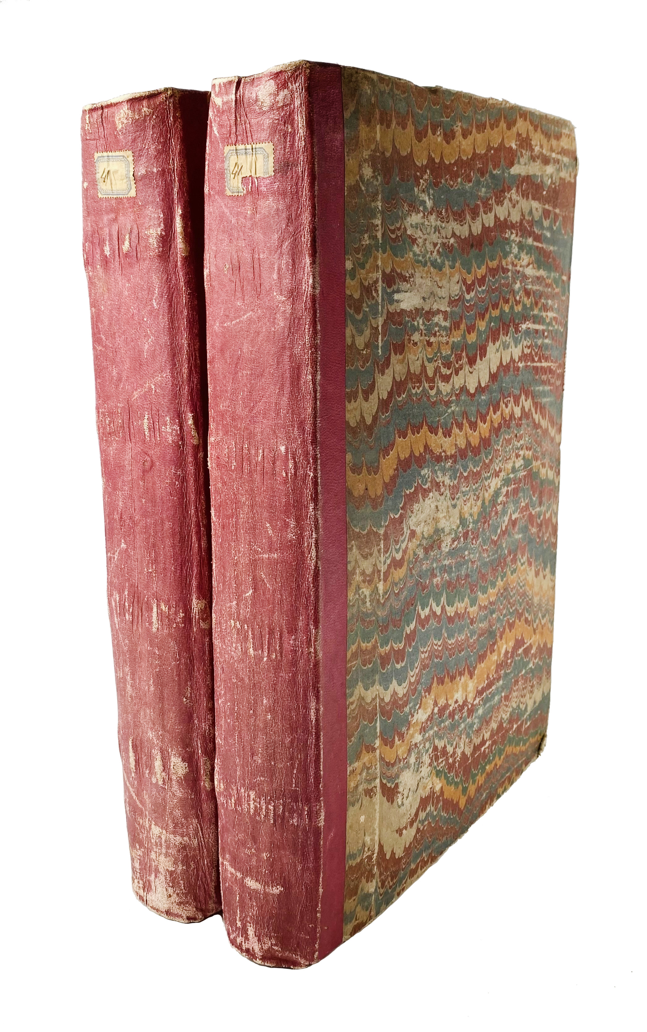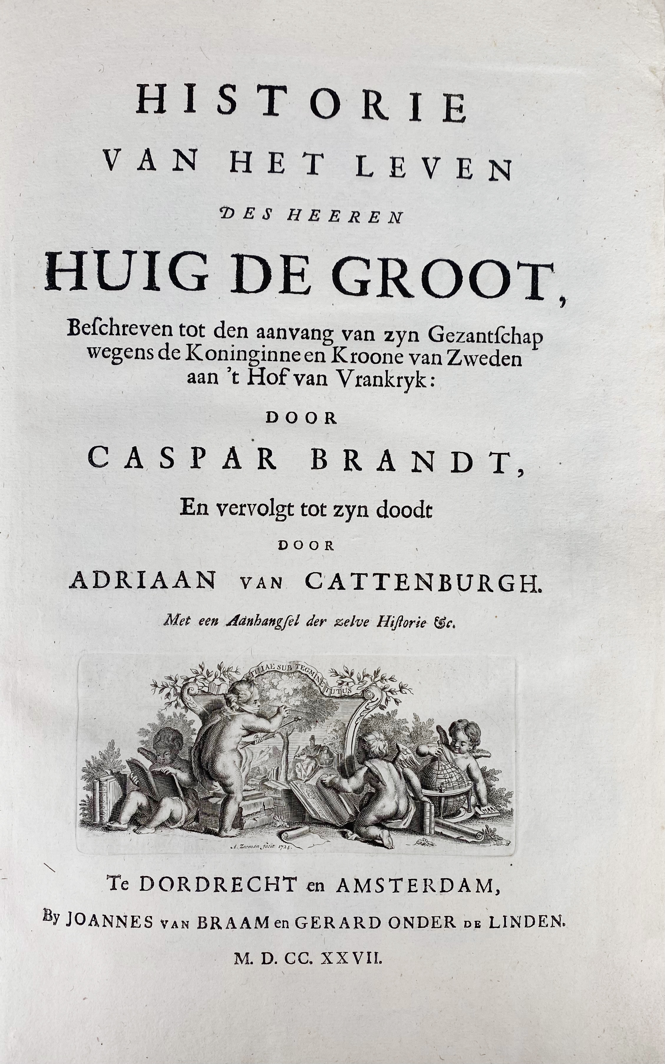 GROTIUS -- BRANDT, C. & A. v. CATTENBURGH. Historie van het leven des heeren Huig de Groot. Met een aanhangsel der zelve historie etc. Dordr., (etc.), J. Braam & G. Onder de Linden, 1727. 2 vols. (22), 456; (6), 454, 74, (24) pp. W. engr. ti., engr. ti-vign., full-p. dedicatory engr. by J.C. Philips, 2 fine engr. portr. by Houbraken (depicting De Groot & his wife Maria v. Reigersbergen) & 1 full-p. engr. & 1 very fine text-engr. (depicting de Groot in his youth by J. de Gheyn on p. 15). Fol. Cont. h. goatskin, uncut. (Inner blank margin vol. 2 a bit wormholed at the end, else a good and clean set with ample margins).