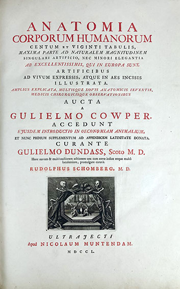 ANATOMY -- COWPER, G. Anatomia corporum humanorum. Acced. eiusdem introd. in oeconomiam animalium, et nunc primum supplementum ad appendicem latinitate donata. Cur. G. Dundass. Hanc novam & multo auct. ed. (…) cur. R. Schomberg. Utrecht, N. Muntendam, 1750. W. tog. (70) text lvs., engr. front., engr. ti.-vign. and 123 engr. on 118 sheets - some folding - for the greater part after drawings by G. de Lairesse. Lge-fol. Cont. h. vellum, uncut. (Sides a bit worn/dam. and in need of some care, some minor staining in places, espec. in upper (blank) margin, but a v.g. copy).