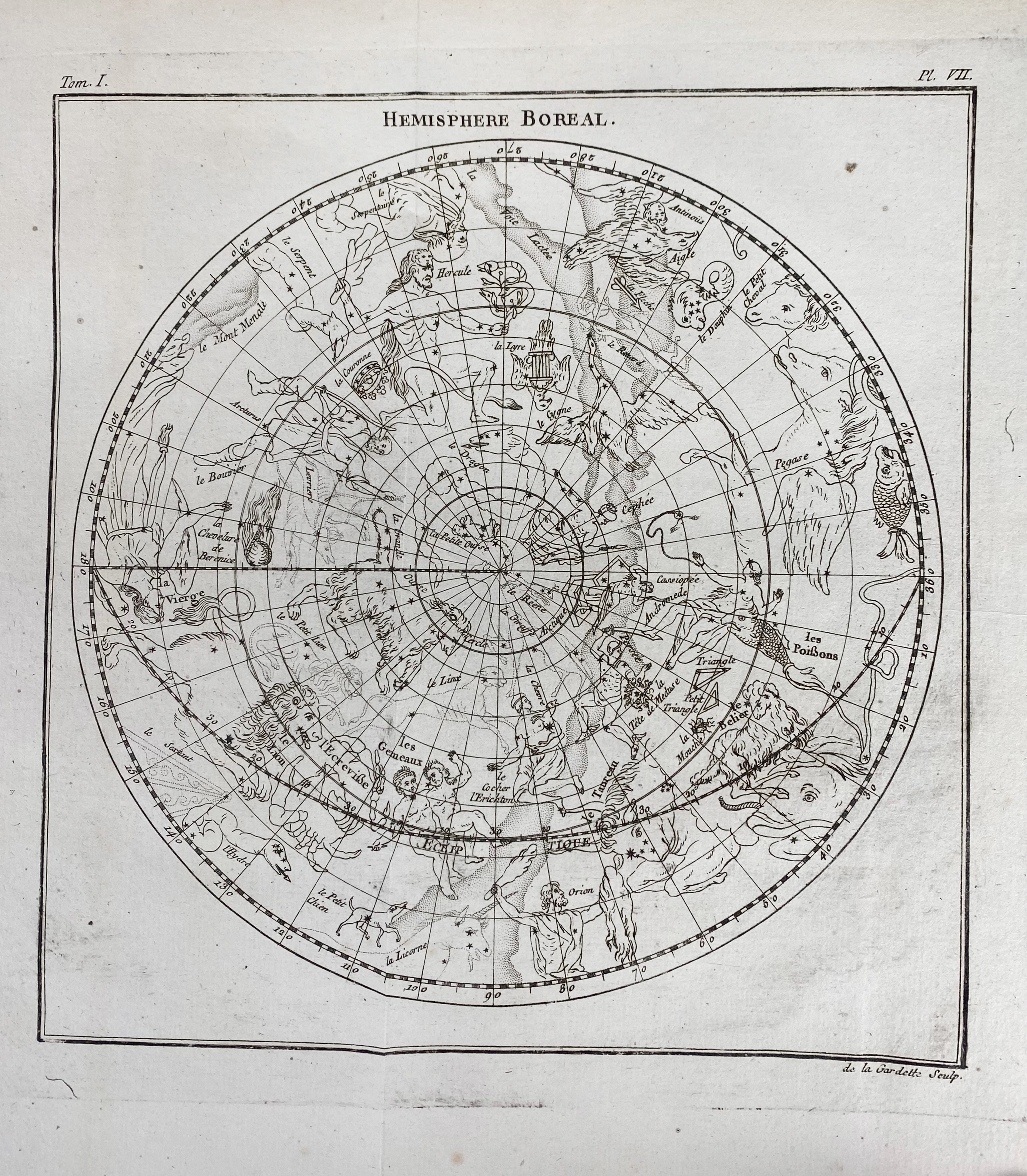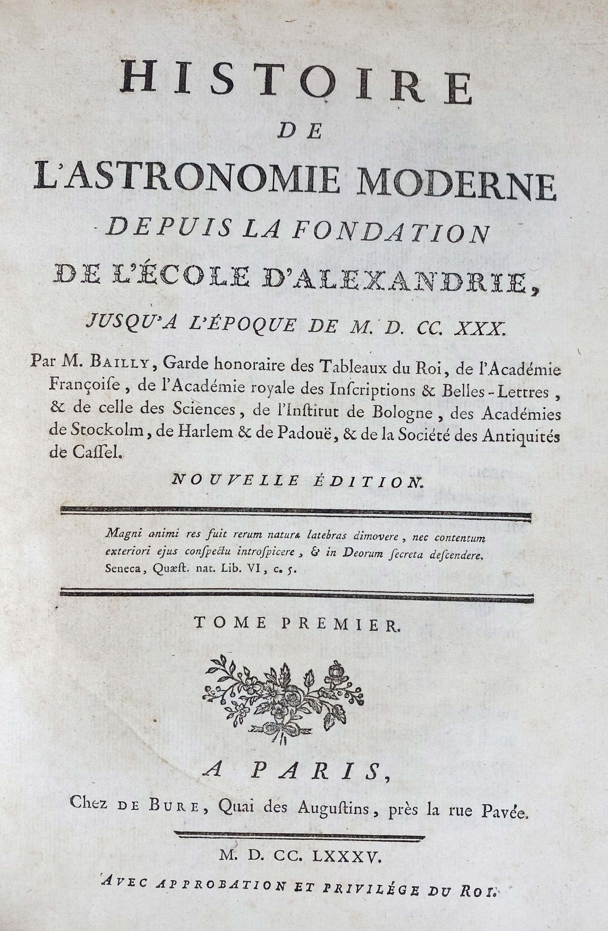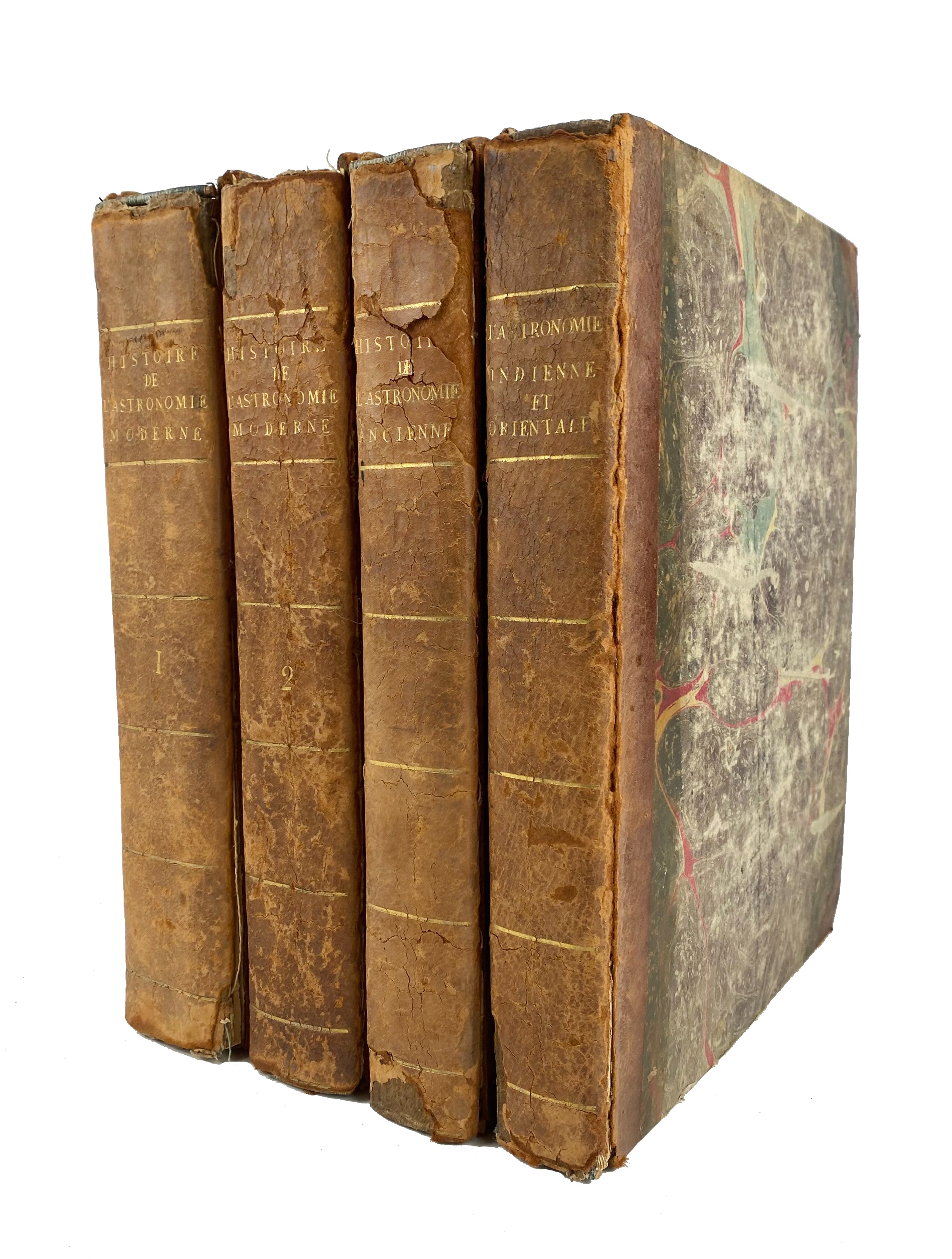 ASTRONOMY -- BAILLY, J.S. Histoire de l'astronomie moderne depuis la fondation de l'école d'Alexandrie, jusqu'à l'époque de M.D.CC.XXX. Vols. 1-2. Nouv. éd. Par., De Bure, 1785. 2 (of 3) vols. xvi, 728; (2), 751 pp. W. 18 (fold.) engr. plates. - Id. Histoire de l'astronomie ancienne, depuis son origine jusqu'à l'établissement de l'école d'Alexandrie. 2nd éd. Par., De Bure, 1781. xxiv, 527 pp. W. 3 engr. plates. - Id. Traité de l'astronomie indienne et orientale. Par., De Bure, 1787. (2), clxxx, 427 pp. - 4 vols. 4°. Cont. hcf. (Spines dam./chafed, corners dam., sides rubbed, half-ti. lacks).