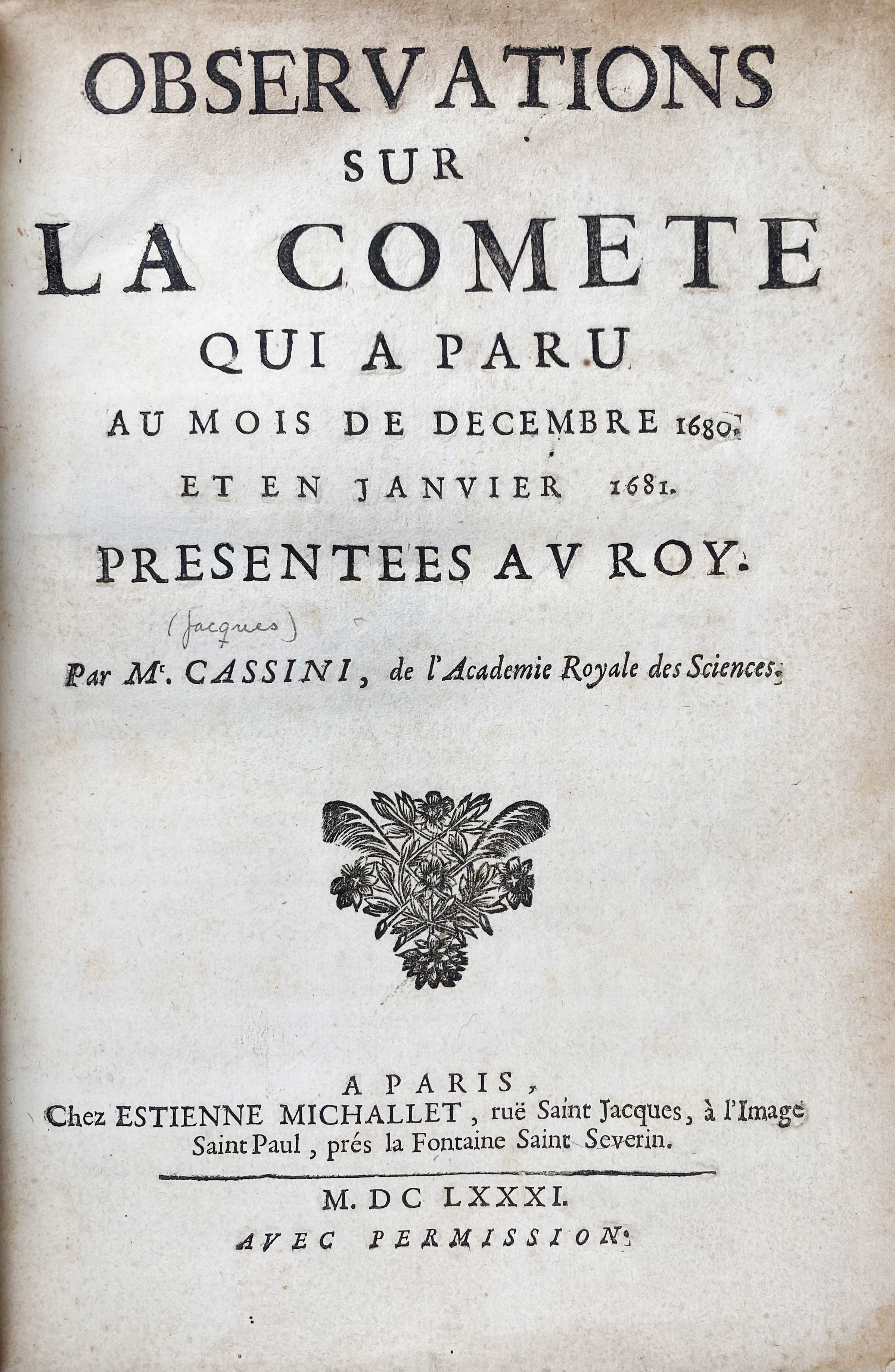 ASTRONOMY -- CASSINI, J.D. Observations sur la comete qui a paru au mois de decembre 1680 et en janvier 1681. (&) Abregé des observations & des reflexions sur la comete. Par., E. Michallet, 1681. 2 parts in 1 vol. 90, (2); xxxix pp. 4°. Mod. cf. w. old wrps. bound up. (Without plates, a bit age-toned).