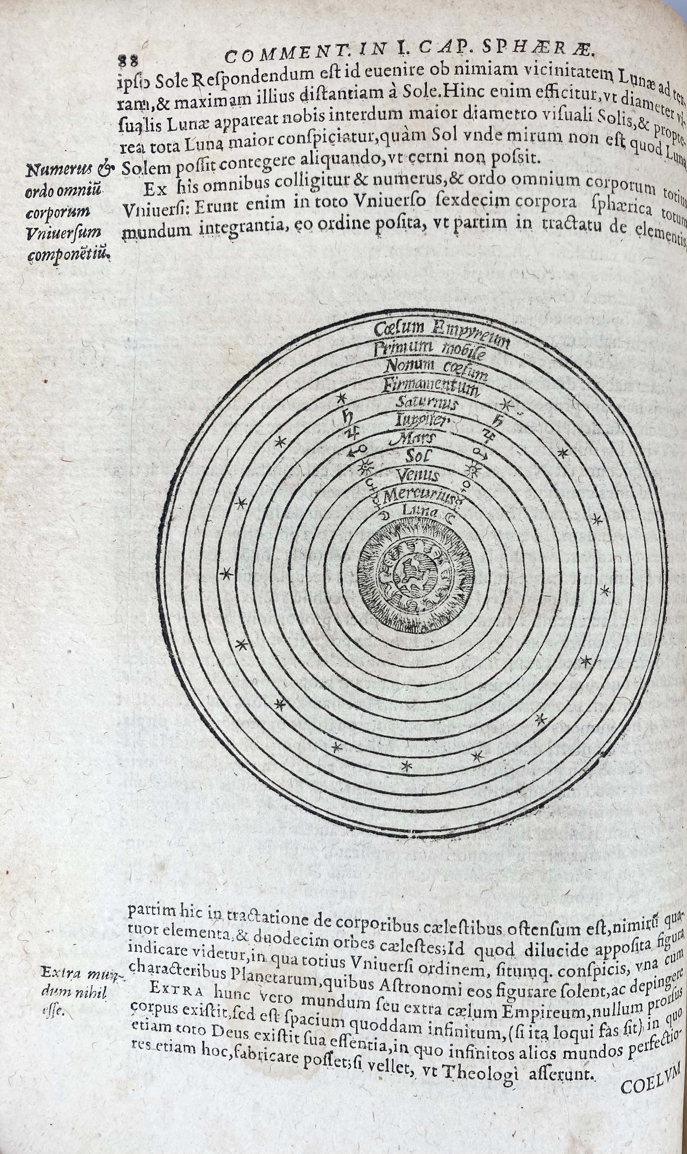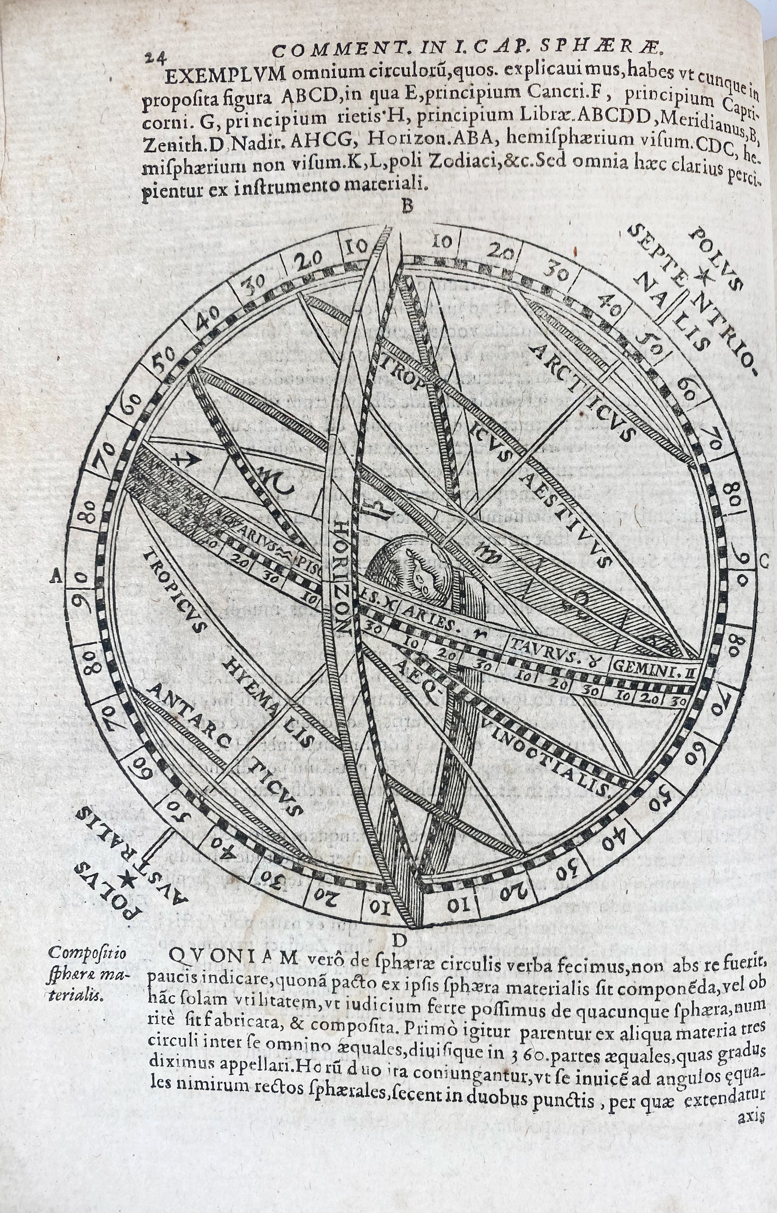 Christophorus Clavius (1538–1612) was a German Jesuit mathematician and astronomer, best known as the main architect of the Gregorian calendar (1582). Clavius’ commentary, first published in 1570, became a standard astronomy textbook in Europe, with at least 16 editions by 1618. It expanded on Sacrobosco’s geocentric model, integrated mathematical rigor, and addressed contemporary astronomical debates—though it notably avoided endorsing Copernicus’ heliocentric system. - Houzeau-Lancaster I, 2678.€ 300