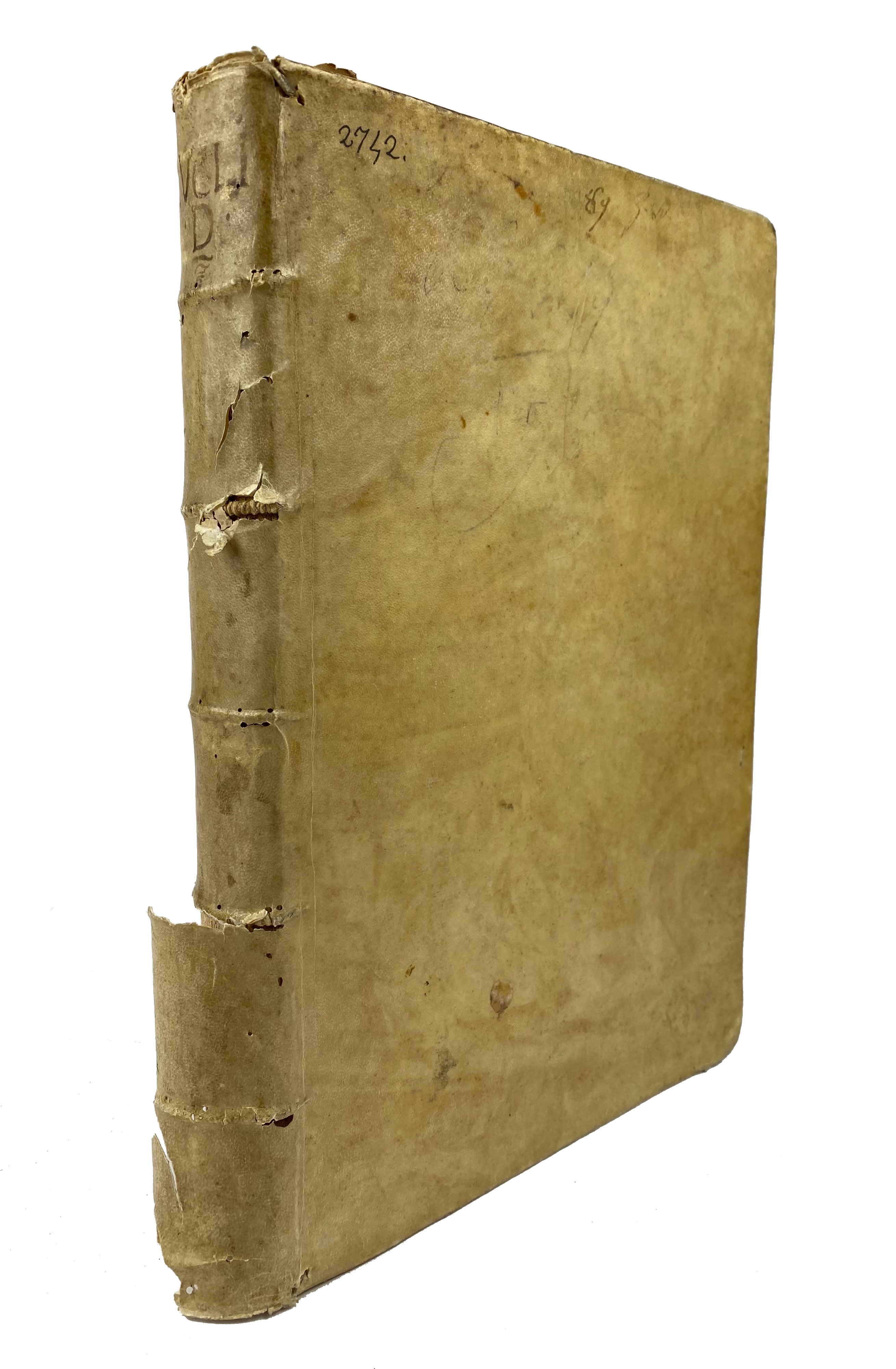 MATHEMATICS -- EUCLIDES. Elementorum libri XV. una cum scholiis antiquis a F. Commandino. Pesaro, Typ. Flaminii Concordiæ, 1619. (10), 255 lvs. W. woodcut device of the dedicatee, Cardinal Carlo de Medici, printed in red & black on ti-p., sev. diagrams in the text. Fol. Cont. vellum. (Spine dam./wormholed, lower compartment loosening, upper inner margin stained throughout (espec. at the beginning), some minor foxing in places).