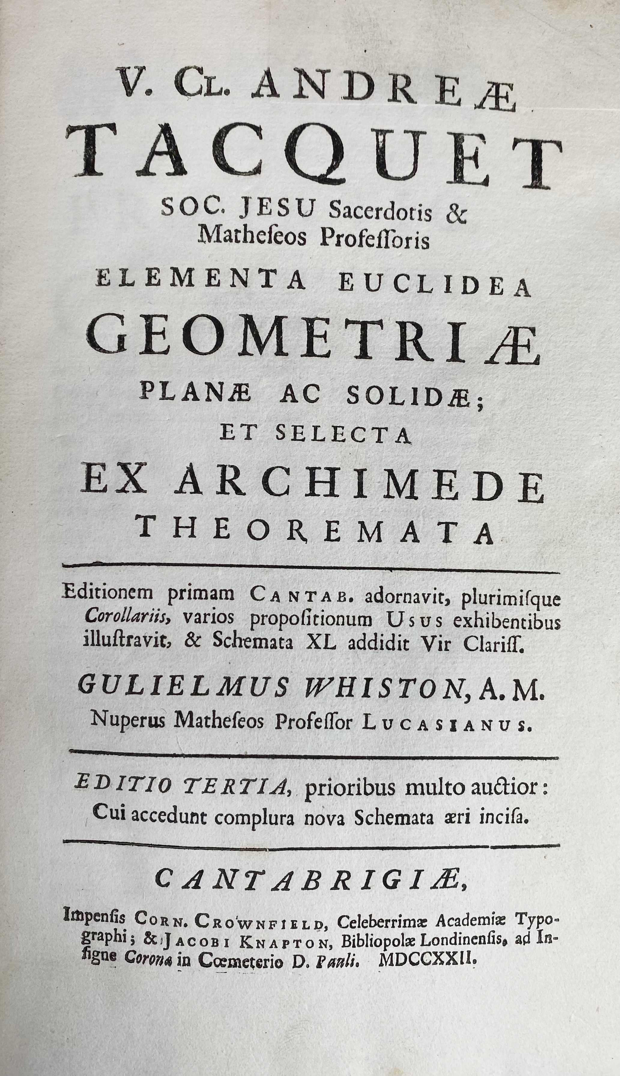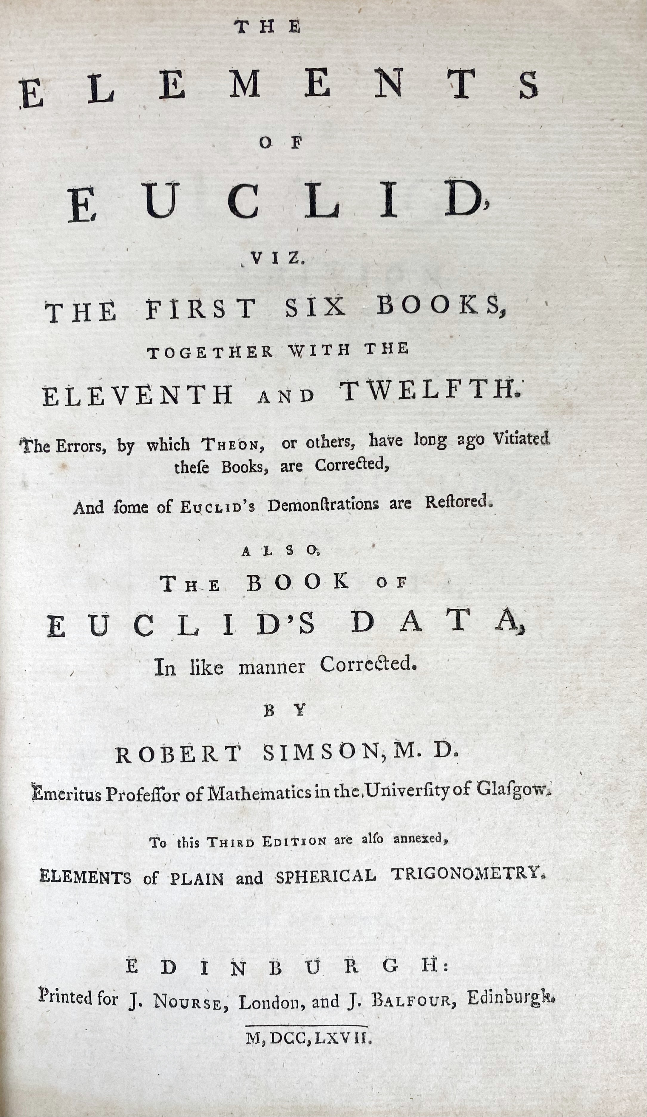 MATHEMATICS -- EUCLIDES. The elements, viz. the first six books, tog. w. the eleventh and twelfth. (…) Also the book of Euclid's Data, in like manner corr. by R. Simson. 3rd ed. Edinburgh, 1767. (8), 512, (3) pp. W. 3 fold. plates. Cont. mottled cf. w. raised bands & red label. (Upper joint split, stamp on endpaper). Steck V.25a. -- Id. Elementorum libri priores XII. Ex Commandini et Gregorii versionibus Latinis. Ed. Samuel, Episc. Roffensis. Oxf., 1802. Cont. cf. (Front side loose). -- A. TACQUET. Elementa Euclidea geometriæ planæ ac solidæ; et selecta ex Archimede Theoremata. Ed. 3a. Cambr., 1722. W. 6 fold. plates. Old marbled brds. (Stained at the beginning). -- (3).