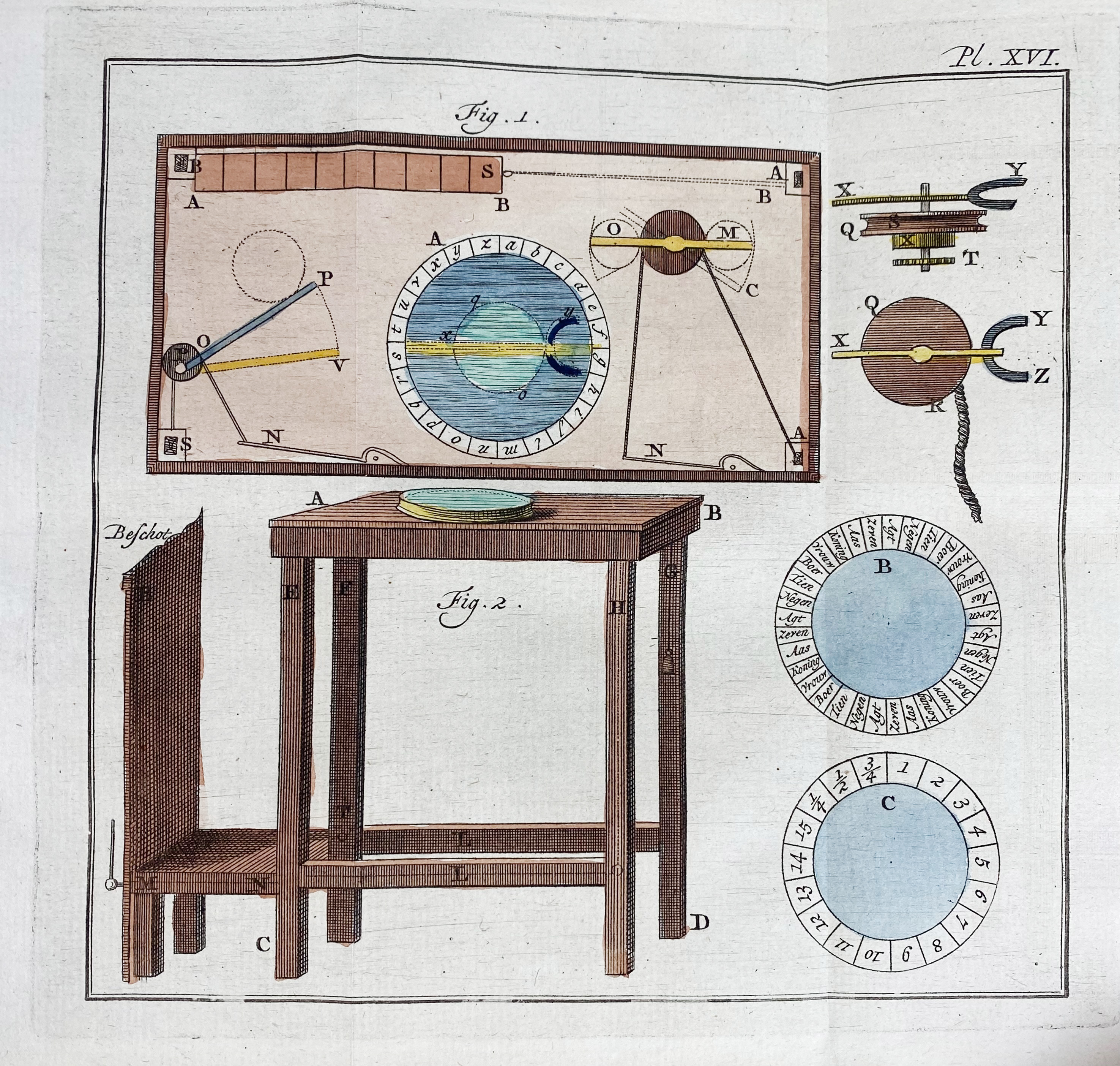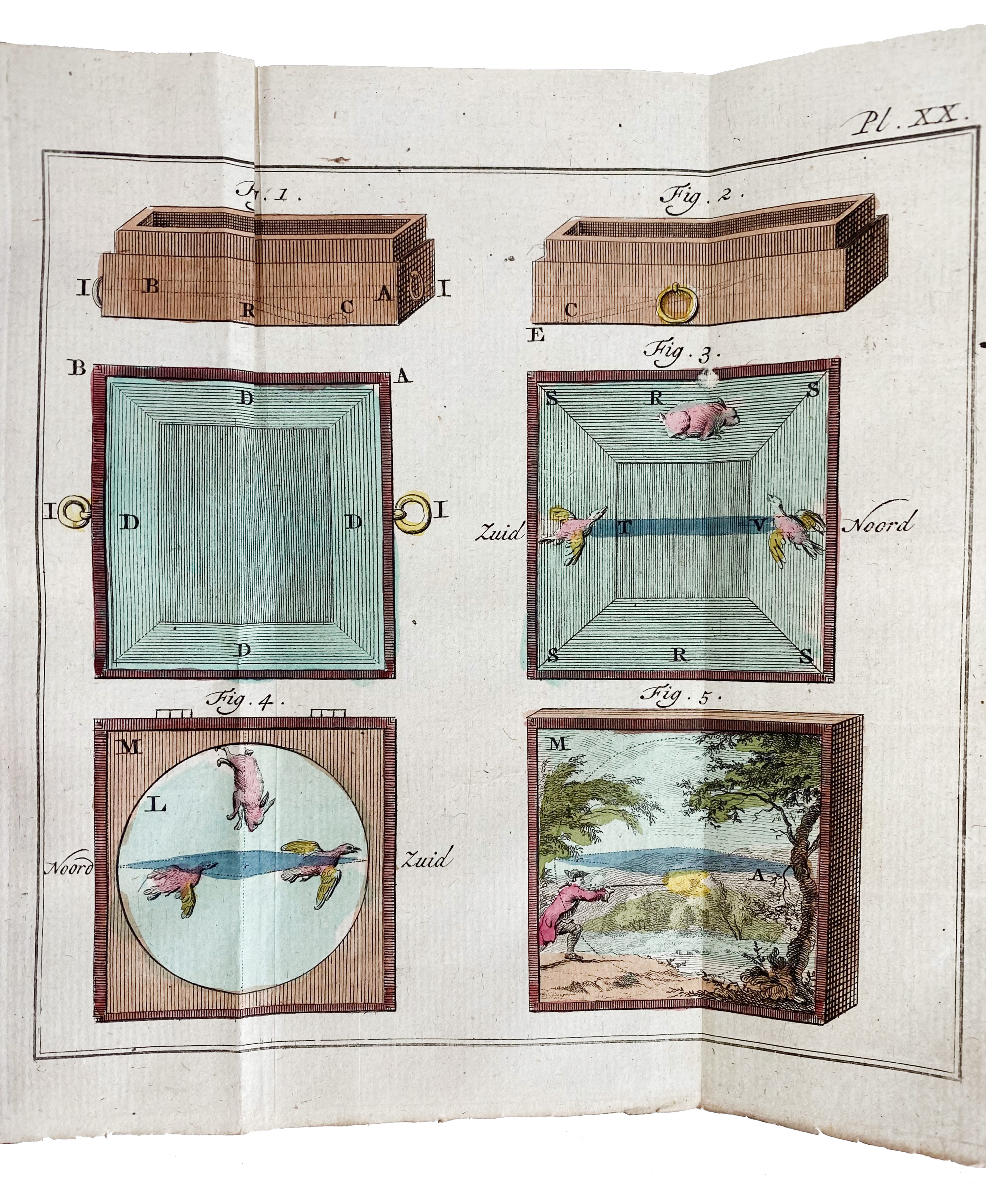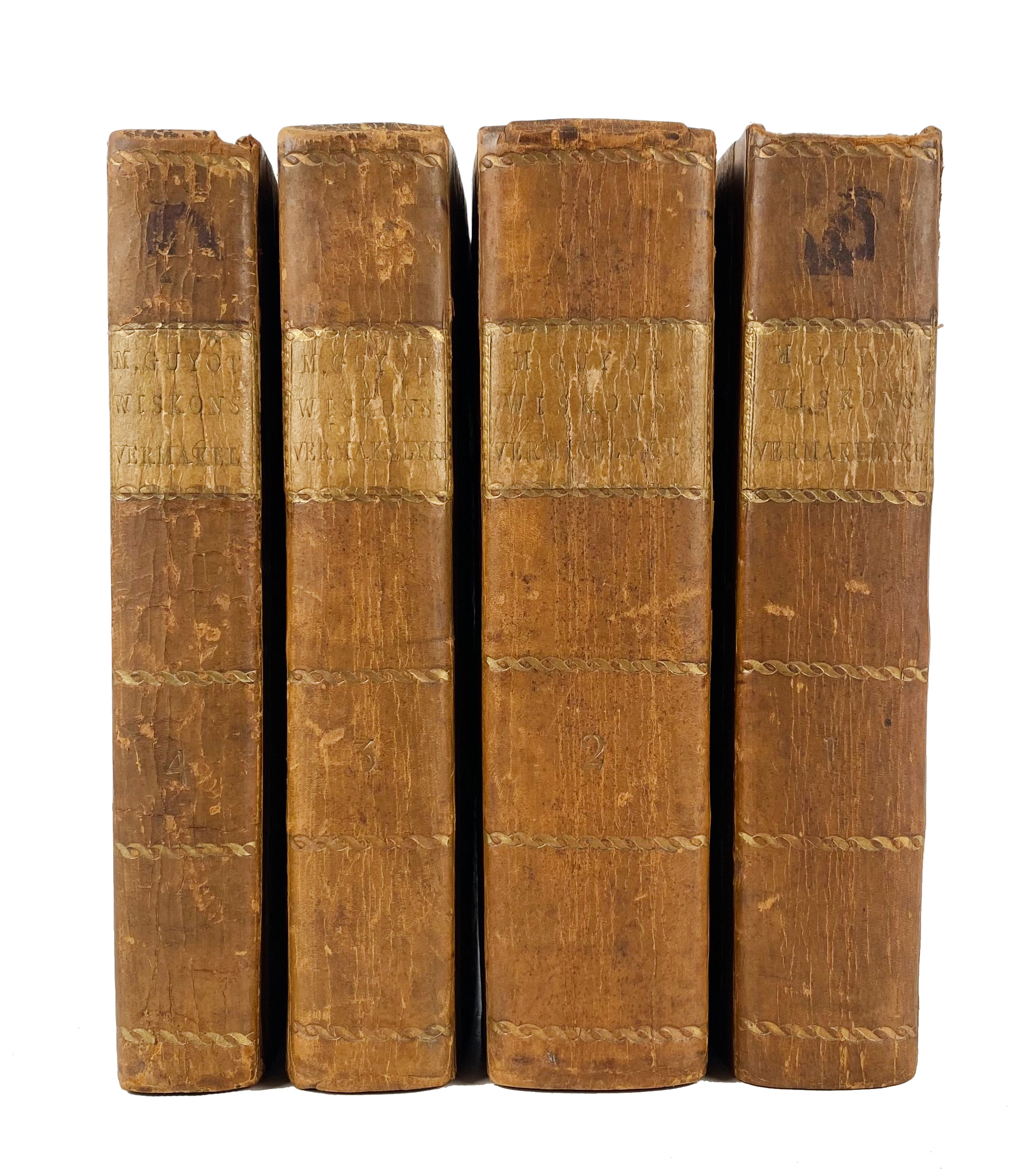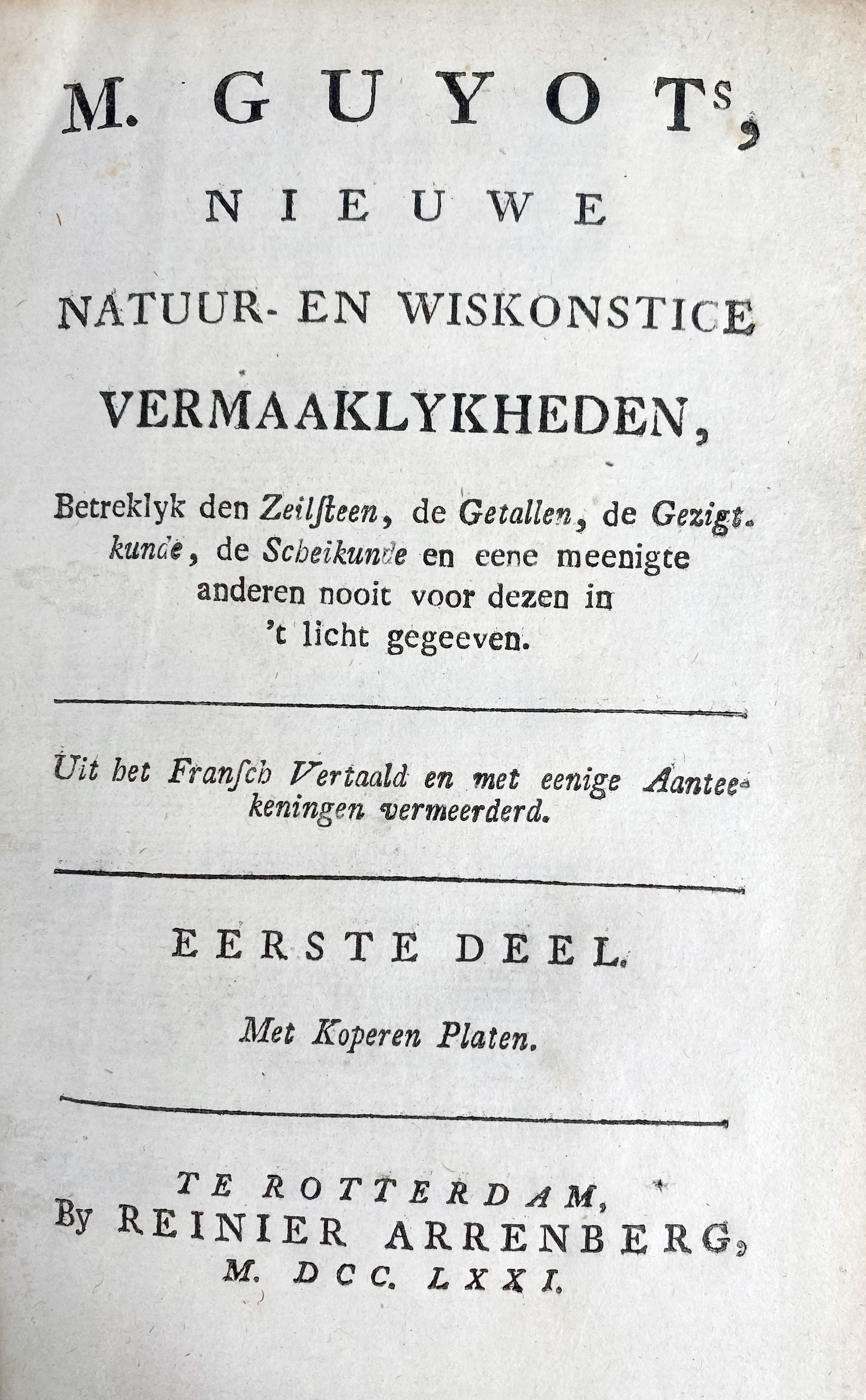 MATHEMATICS -- GUYOT, E.G. Nieuwe natuur- en wiskonstige vermaaklykheden, betreklyk den zeilsteen, de getallen, de gezigtkunde, de scheikunde en eene meenigte anderen nooit voor dezen in 't licht gegeeven. Rott., R. Arrenberg, 1771-75. 4 vols. 414, (4); 622, (2); 396, (4); 338, (2) pp. W. 74 (fold.) engr. plates, for the greater part handcold., & sev. fold. tables. Cont. hcf. w. dec. gilt backs & brown labels.