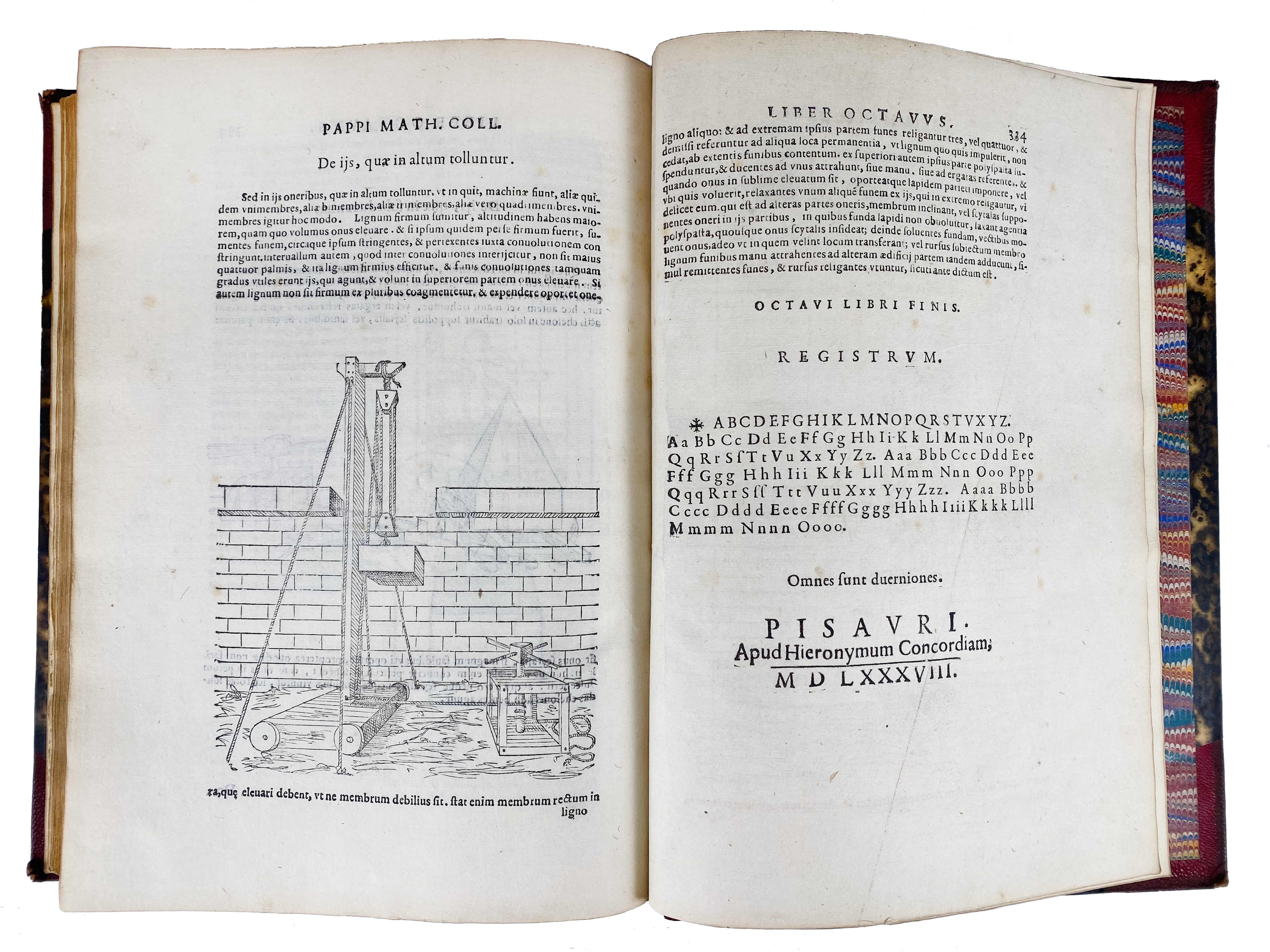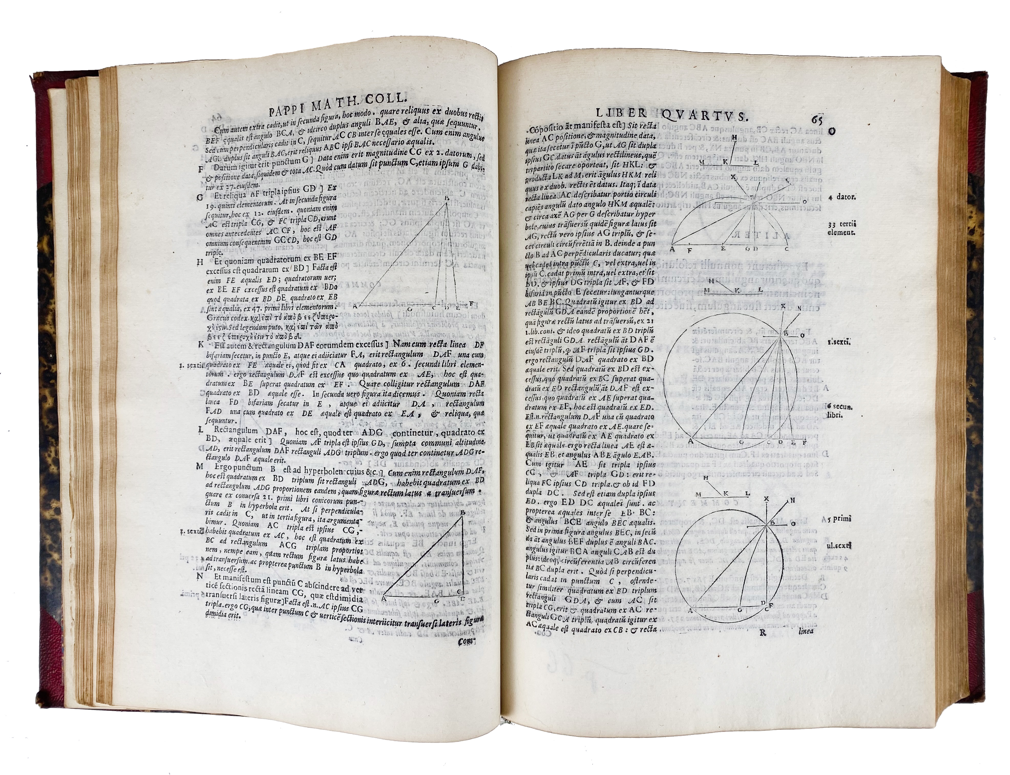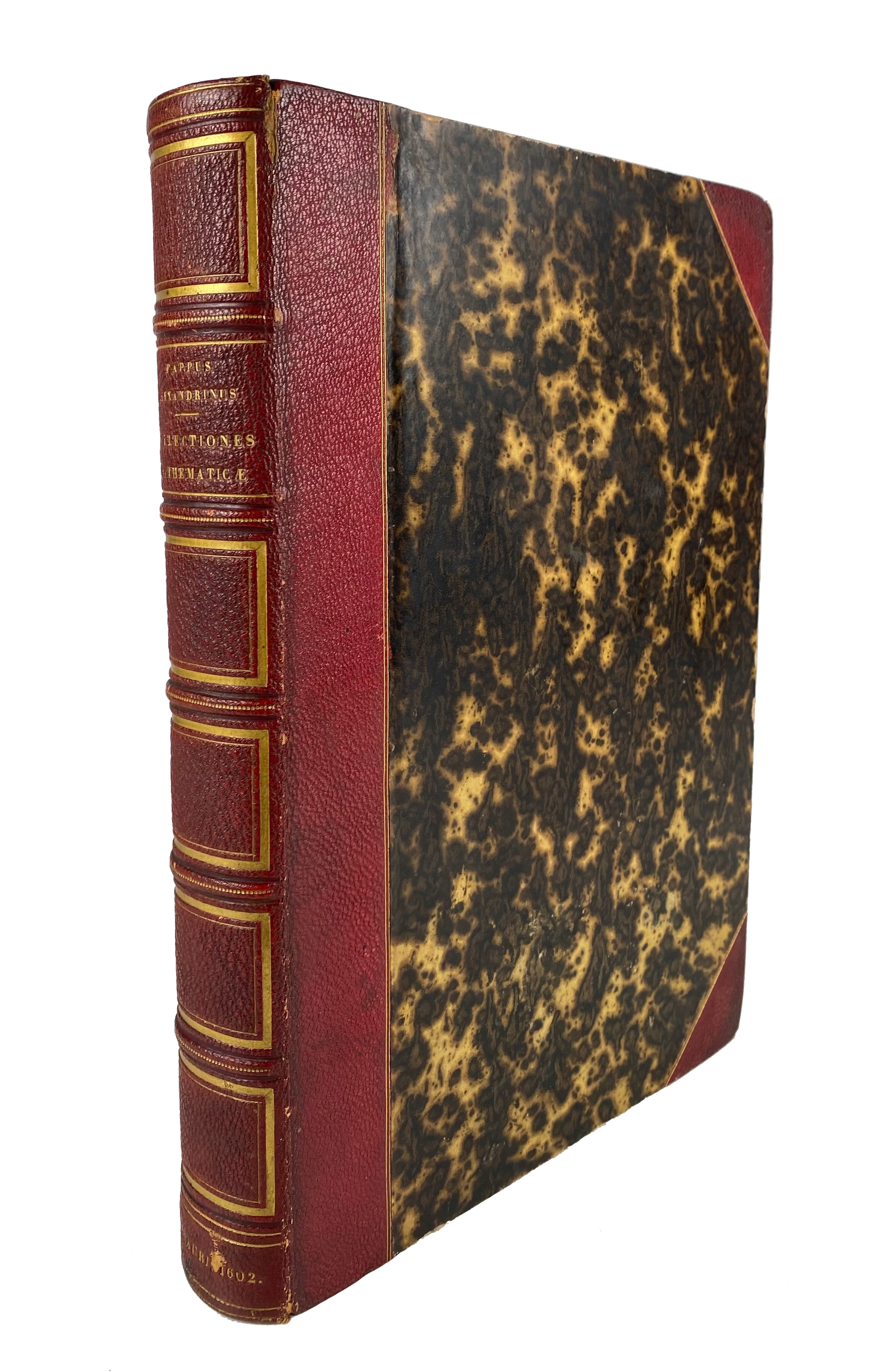 MATHEMATICS -- PAPPUS ALEXANDRINUS -- COMMANDINO, F. commentaria in libros octo mathematicarum collectionum Pappi Alexandrini (…). Pesaro, H. Concordia, 1602. (4), 334 lvs. W. woodcut illustr. 4°. 19th c. h. red mor. extra, spine w. compartments & gilt. lettering & dec., all edges gilt. (Wear to extremities, title p. & last leaf discreetly reinforced w. paper, a few very discreet annot. in pencil & light ink).