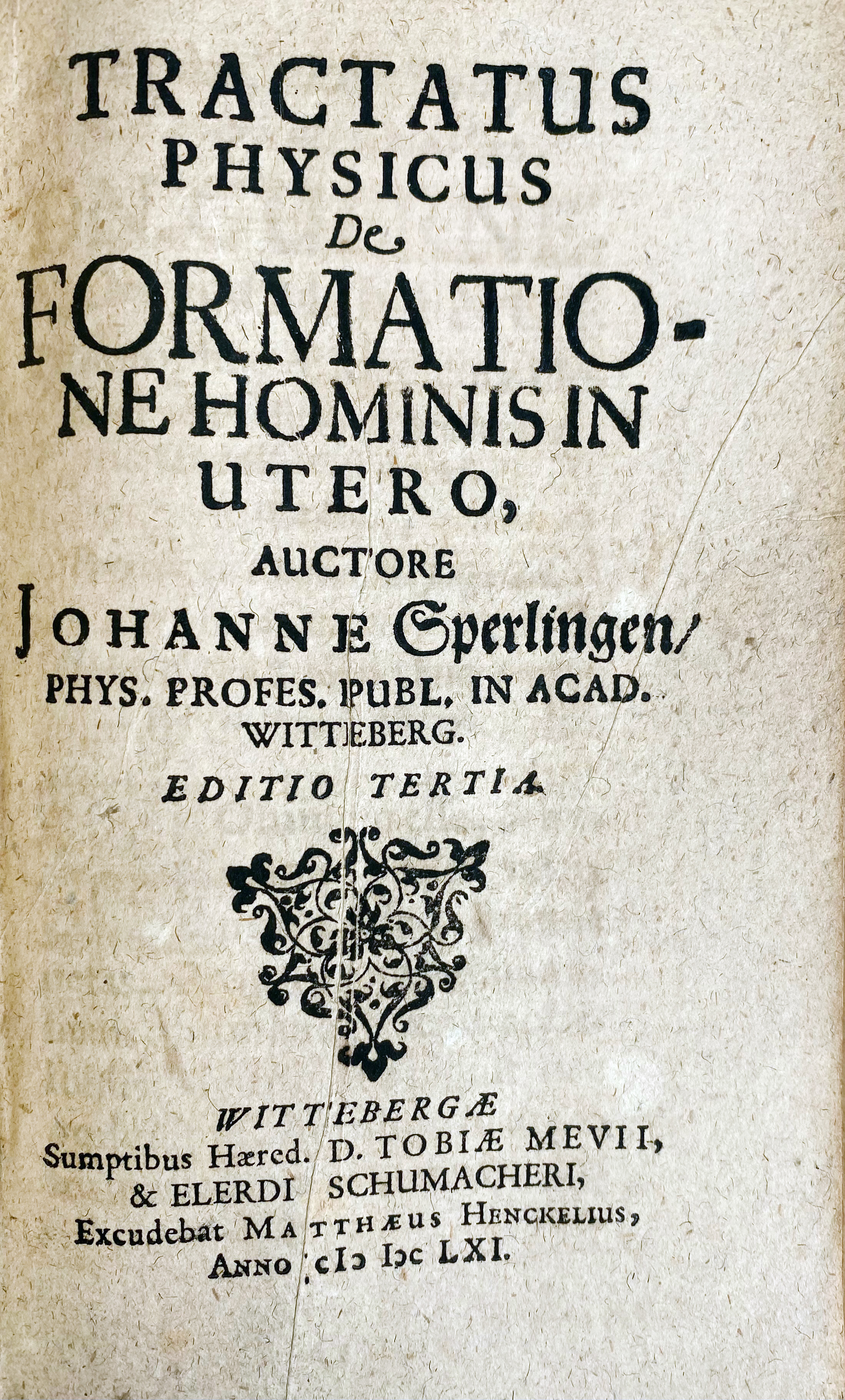 SPERLING, J. Institutiones physicae. Ed. 5a auctior & corr. Frankf./Wittenberg, J. Berger, 1667. (14), 1162, (22) pp. W. engr. ti. - Bound with: Id. Tractatus physicus de formatione hominis in utero. Ed. 3a. Wittenberg, 1661. (6), 220 pp. - 2 in 1 vol. Cont. vellum w. overl. sides. (A bit browned in places).