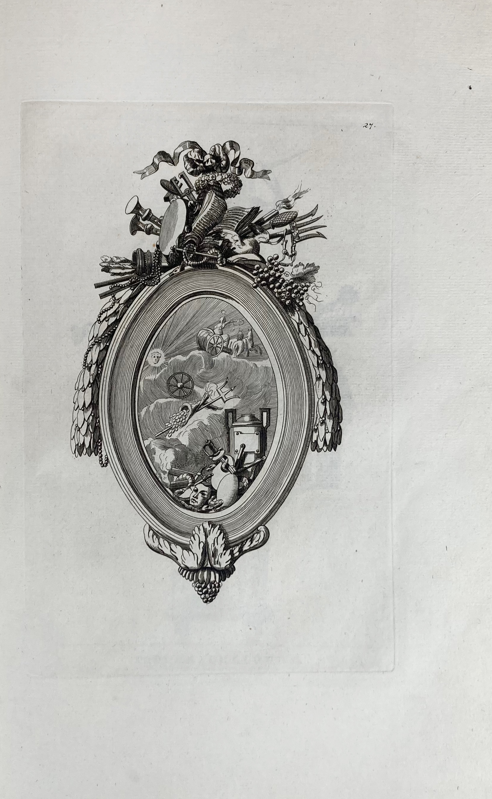 The two section titles in French read : 1. Receuil des fontaines, frontispices, pyramides, cartouches, dessus-de-portes, bordures, medaillions, trophées, vases, frises, lutrins, tombeaux, pendules, etc.; 2. Receuil des portes, cheminées, pyramides, cartouches, monumens, bordures, vases, tables, pendules, girandoles, chandeliers, trophées, etc. - Kunst op schrift 1374; Cf. Kat. Ornamentstichsamml. 465 & NBG 28, 806-08 (extensively).