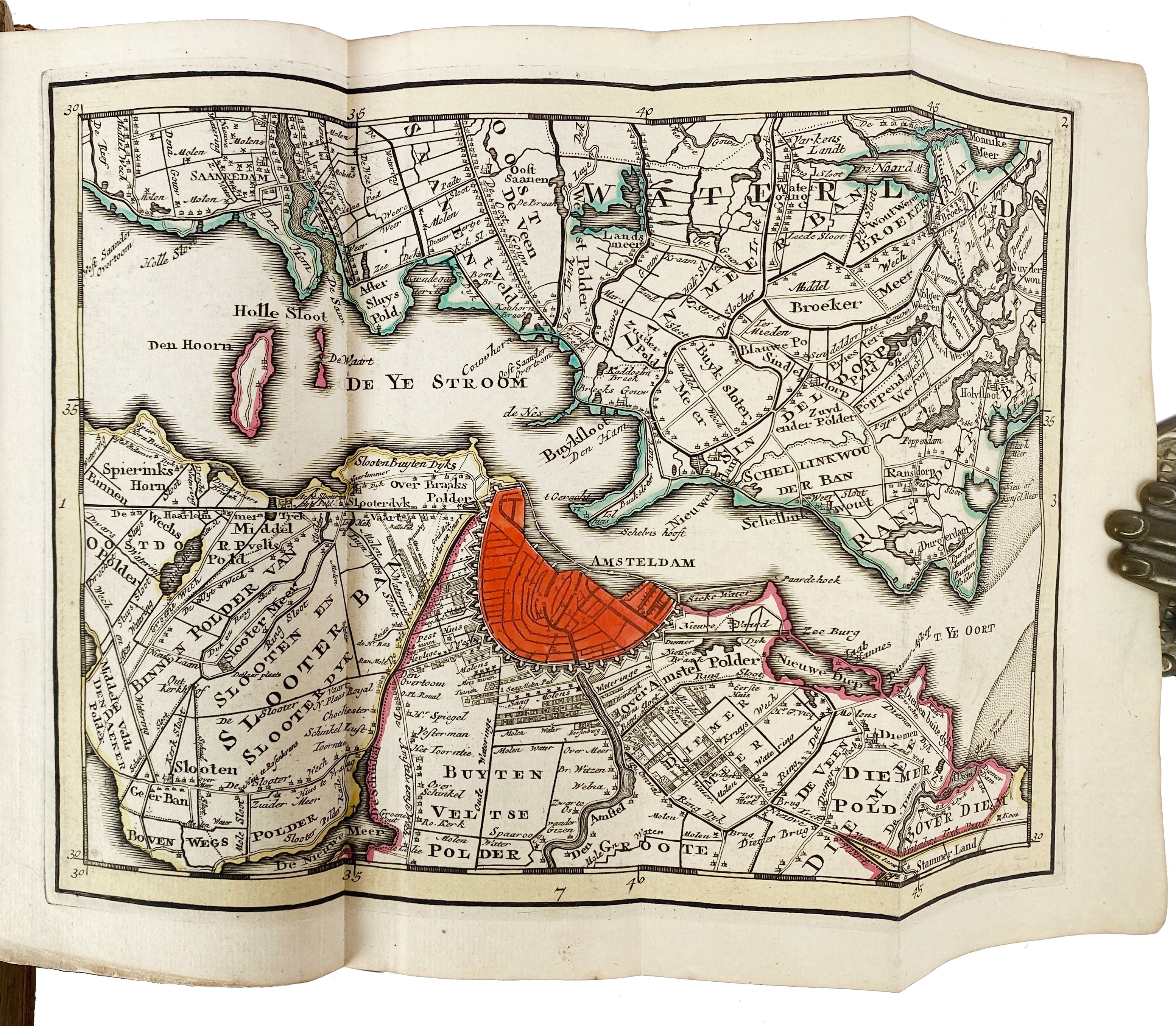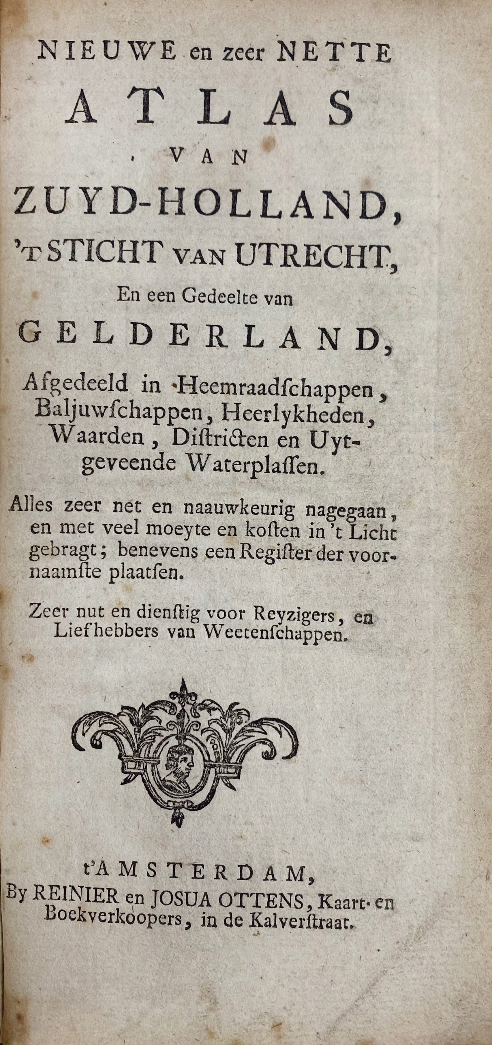 ATLASES -- NIEUWE EN ZEER NETTE ATLAS van Zuyd-Holland, 't Sticht van Utrecht, En een Gedeelte van Gelderland, Afgedeeld in Heemraadschappen, Baljuwschappen, Heerlykheden, Waarden, Districten en Uytgeveende Waterplassen. Amst., R. & J. Ottens, (n.d., c. 1750). (22) pp. W. 45 fold. maps, all cold. by hand. Narrow-8°. Cont. hcf. w. raised bands. (Bind. skilfully restored, outer margins of some maps strengthened w. (almost invisible) strip of mending tape on v°, but in very good condition).