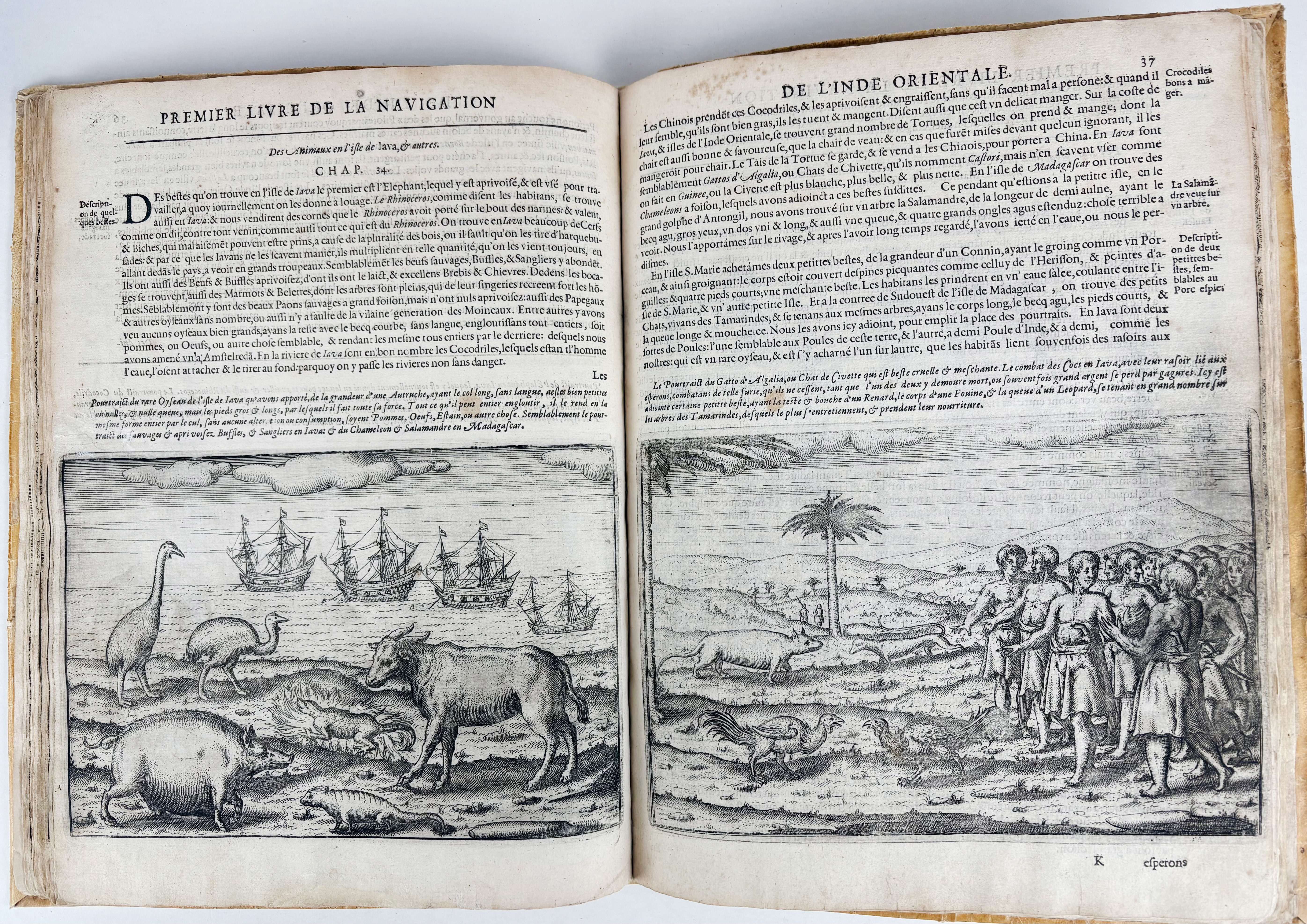 MARITIME HISTORY - TRAVELLING -- HOUTMAN -- L(ODEWIJCKSZOON), G. ('Willem') M.A.W. Premier livre de l'Histoire de la Navigation aux Indes Orientales par les Hollandois et des choses a eux advenues: ensemble les conditions, les meurs, et manieres de vivre des nations, par eux abordees. Amst., C. Nicolas, 1598. 54 lvs. W. 50 engr. maps and plates by/after Th. de Bry c.s. and woodcut profiles in text. Lge-4°. Cont. limp vellum bind. (Spine repaired, leaf G2 (with 1 woodcut plan on r°) very skilfully replaced in photostat, a bit thumbed, outer margins in some places cut close to/on outer plate edges, small inconspicuous repairs to margins in places, but a v.g. copy).