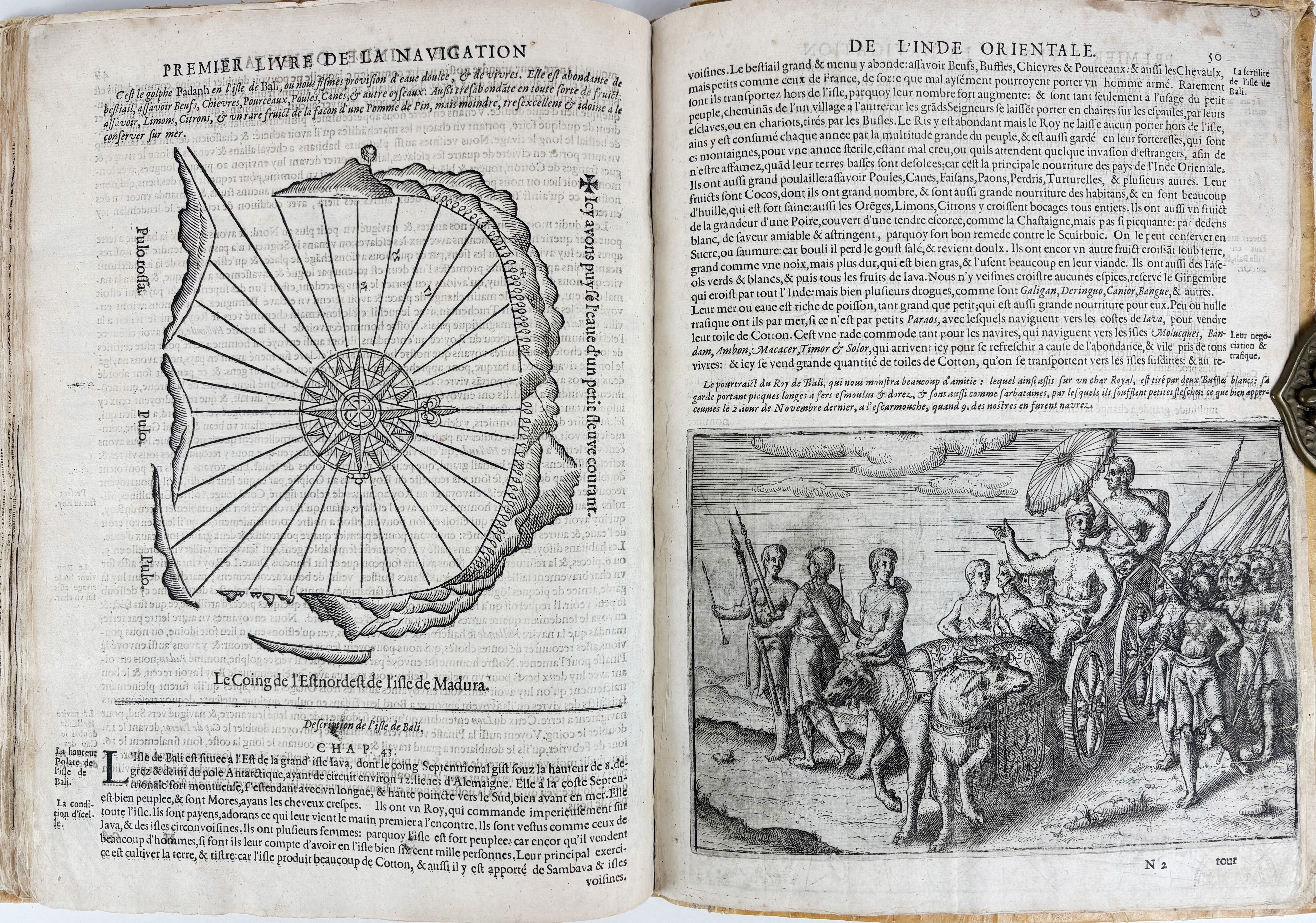 This work recounts the first Dutch expedition (1595-1597) to Java, commanded by Cornelis de Houtman. This pioneering account describes the voyage, local customs, the spice trade, and includes the first European description (and map!) of Bali, thus breaking the Portuguese monopoly. This voyage was harsh and difficult: only one ship of the four that sailed , returned safely home after losing 80 percent of its crew. The book was printed in Dutch, French and Latin in its first year of printing. All of these original editions are rare. - Tiele, Mémoires, 113; Tiele 511; Suarez 1999.€ 5000