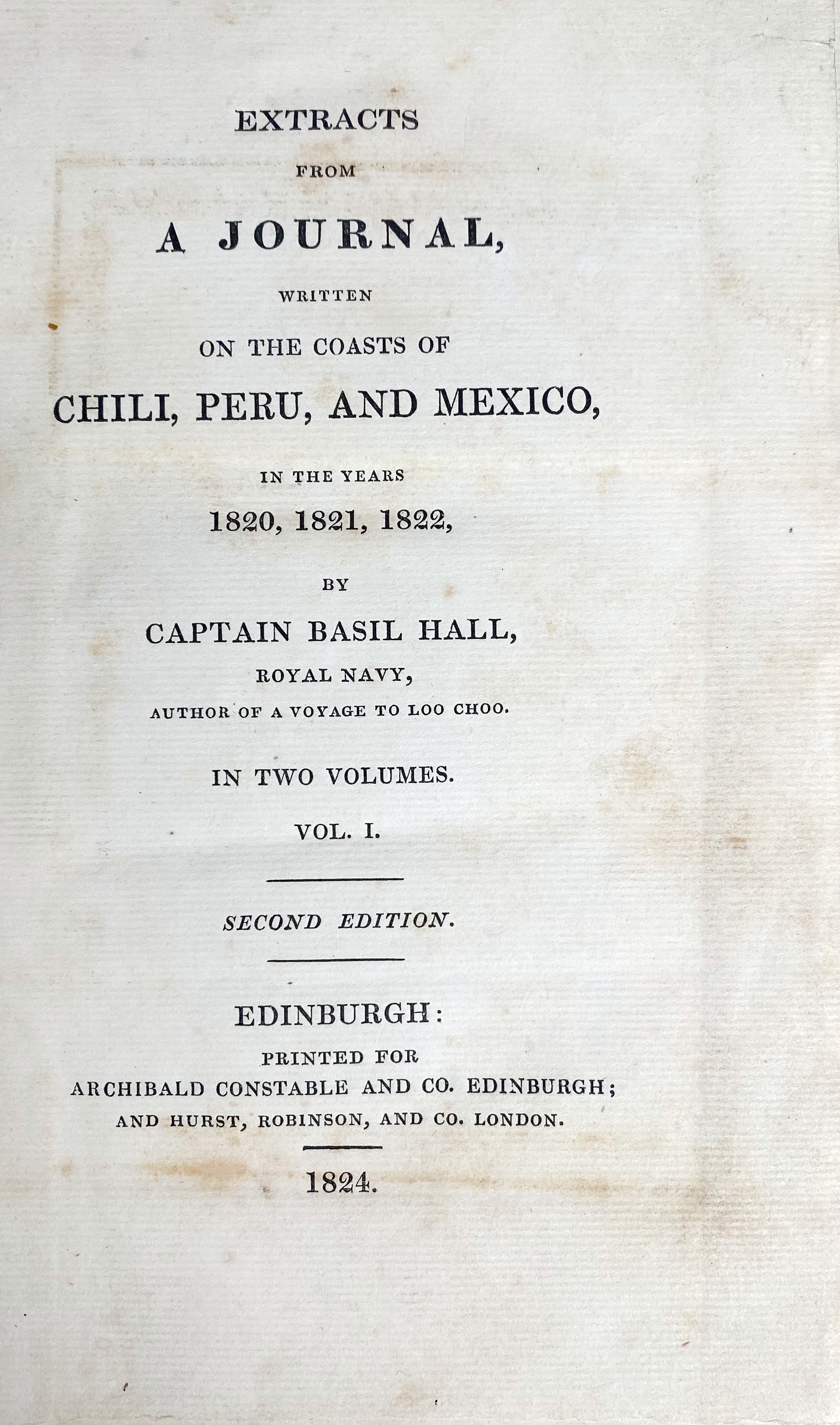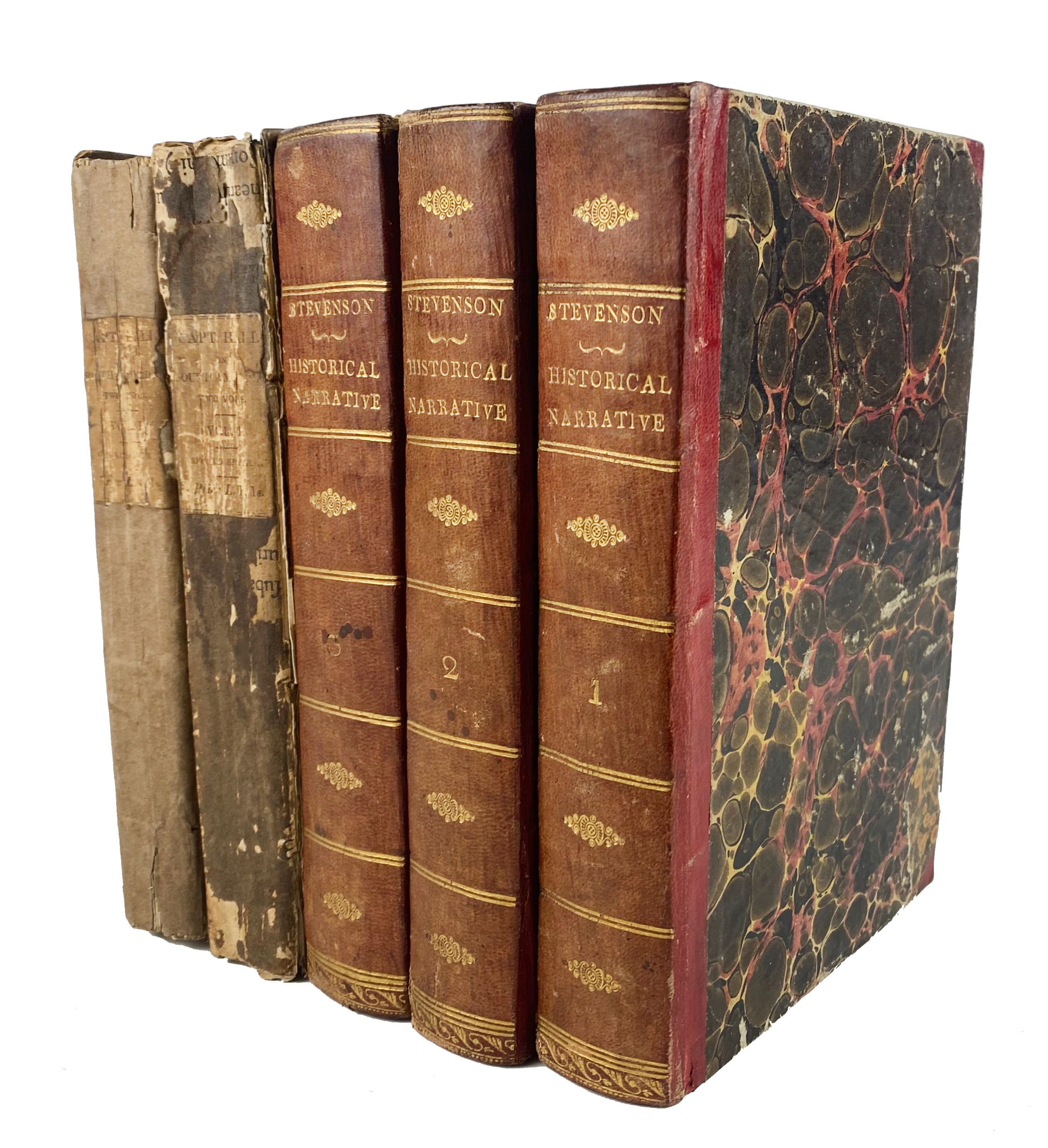 MARITIME HISTORY - TRAVELLING -- STEVENSON, W.B. A Historical and Descriptive Narrative of Twenty Years' Residence in South America. Lond., Hurst, Robinson, and Co., 1825. 3 vols. xii, 439; viii, 434; viii, 467 pp. W. 7 engr. plates (1 fold.). Cont. red hcf. w. dec. gilt backs. (2 plates rep., vol. 1 w. some rep. wormholes at the beginning, some faint stains in places). -- Added: B. HALL. Extracts from a journal written on the coasts of Chili, Peru, and Mexico, in the years 1820, 1821, 1822. 2nd ed. Edinb./Lond., 1824. 3 parts in 2 vols. xviii, 372; xi, (1), 288, 65 pp. W. fold. engr. map. Old (worn) brds., uncut. (Brds. a bit dam./stained, vol. 1 a bit wormholed at the beginning). -- (5).