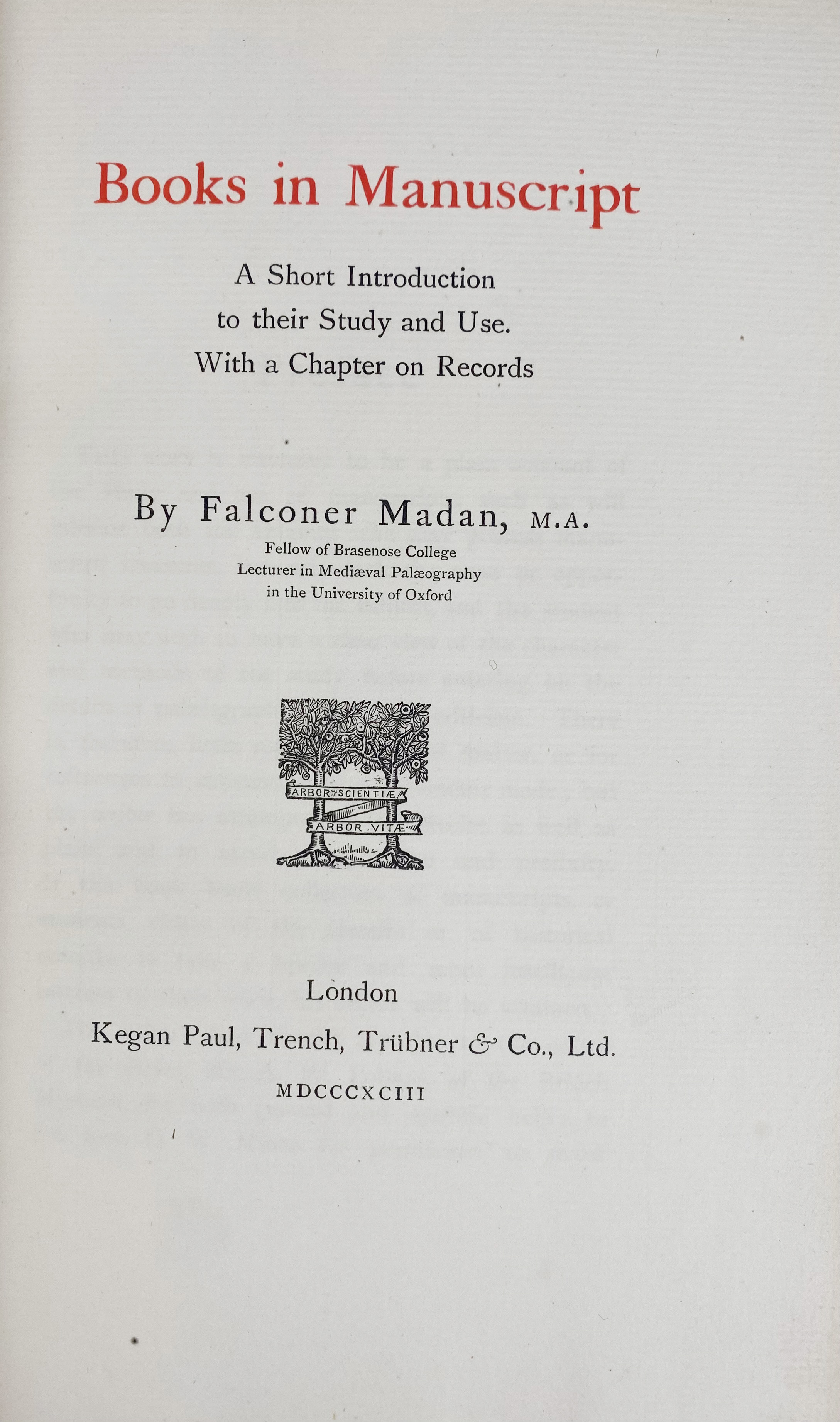 MADAN, F. Books in manuscript. Lond., 1893. Beautifully bound in full dark blue mor. w. raised bands, gilt lettering & t.e.g., uncut. Printed on handmade paper in a limited edition of 150 copies. -- M. WILSON. Education in the earliest schools. Cuneiform manuscripts in the Cotsen Collection. 2008. 4°. Ocl. w. dust-j. -- C. DEKKER, (e.a.). Album palaeographicum XVII provinciarum. Paleografisch album van Ned., België, Luxemburg & N.-Frankrijk. (1992). W. 313 facs. Fol. Ocl. w. dust-j. (Dutch-French text). -- S. BUCKING. Practice makes perfect. P. Cotsen-Princeton 1 and the training of scribes in Byzantine Egypt. 2011. Or. bind. In or. slipcase. -- And 5 o. (9).