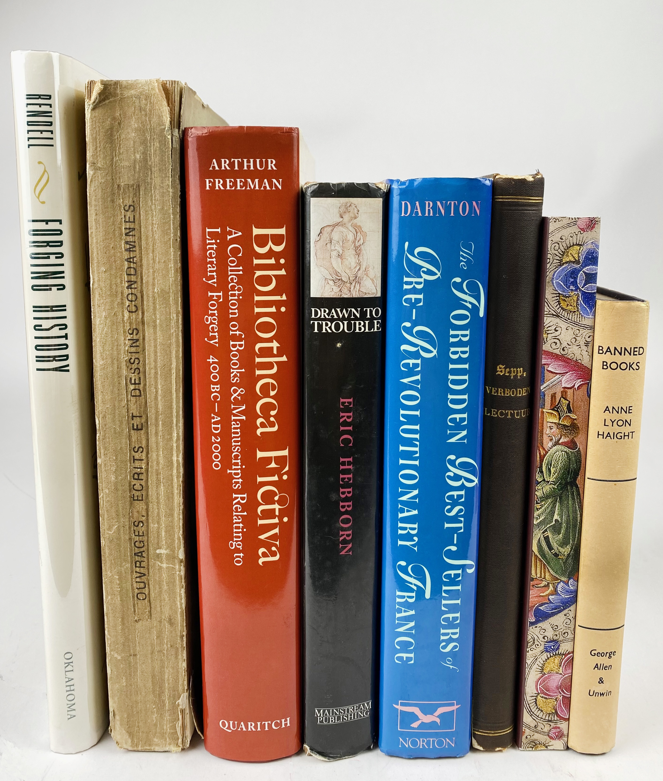 (ASHBEE, H.S., 'Pisanus Fraxi'). Index librorum prohibitorum: Being notes bio- biblio- icono-graphical and critical, on curious and uncommon books. 1877. W. etched front. Sm-4°. Cont. red h. mor. Printed in 250 copies only. -- F. DRUJON. Catalogue des ouvrages, écrits et dessins de toute nature poursuivis, supprimés ou condamnés depuis le 21 oct. 1814 jusqu'au 31 juillet 1877. 1878. Lge-8°. Owrps., uncut. (Spine ends a bit dam.). -- C. SEPP. Verboden lectuur. Een drietal Indices Librorum Prohibitorum toegelicht. 1889. Hcl. (Spine loosening). -- Added: A. FREEMAN. Bibliotheca fictiva. A collection of books & manuscripts relating to literary forgery 400 BC - AD 2000. 2014 Or. bind. w. dust-j. -- W.M. VOELKLE. Holy hoaxes: A beautiful deception. (2018). Owrps. -- And 4 o. (9).