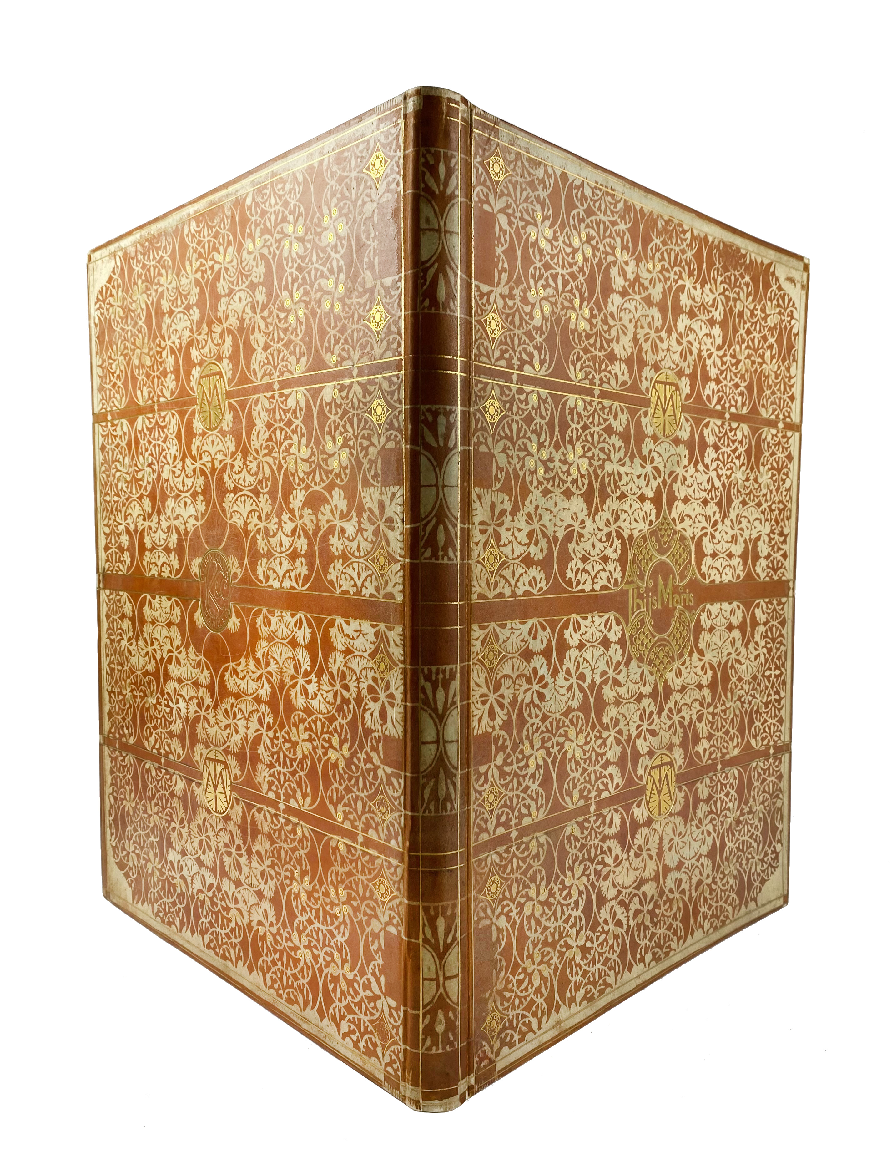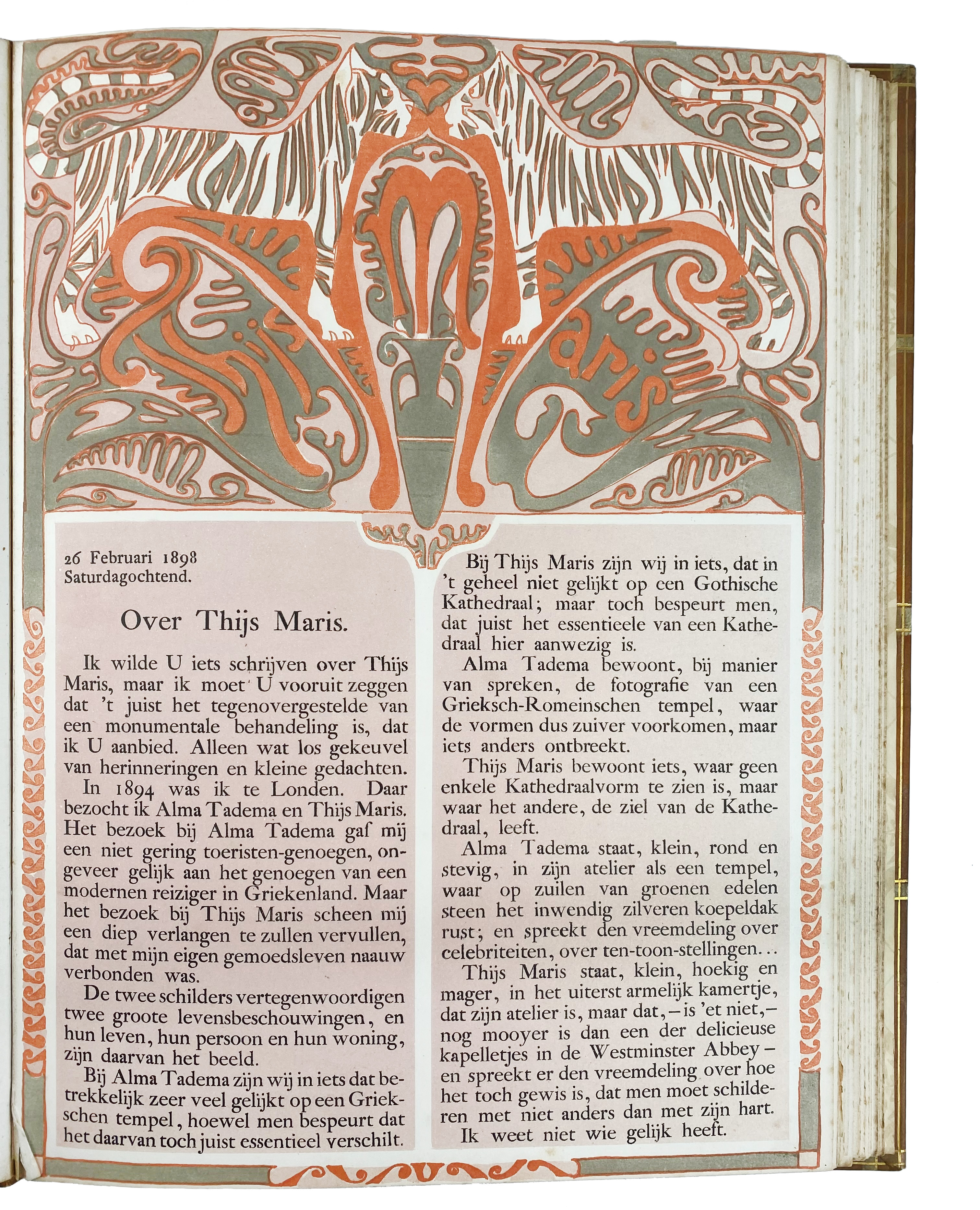 BINDINGS -- ALBUM THIJS MARIS. (M. voorw. d. L. v. Deyssel). (Haarl., H. Kleinmann & Co., 1900). (26 lvs.). W. 18 tipped in plates printed on Japanese paper after works by M. Maris. Preliminary leaves printed within tinted lithogr. borders, bookdecoration, as well as decoration on binding by C.A. Lion Cachet. Fol. Or. vellum batiked in ochre, both sides lettered and tooled in gilt. (W. 2 large owner's dedications in pen/ballpoint on first free endpaper, occas. sl. foxed, but else a fine copy).