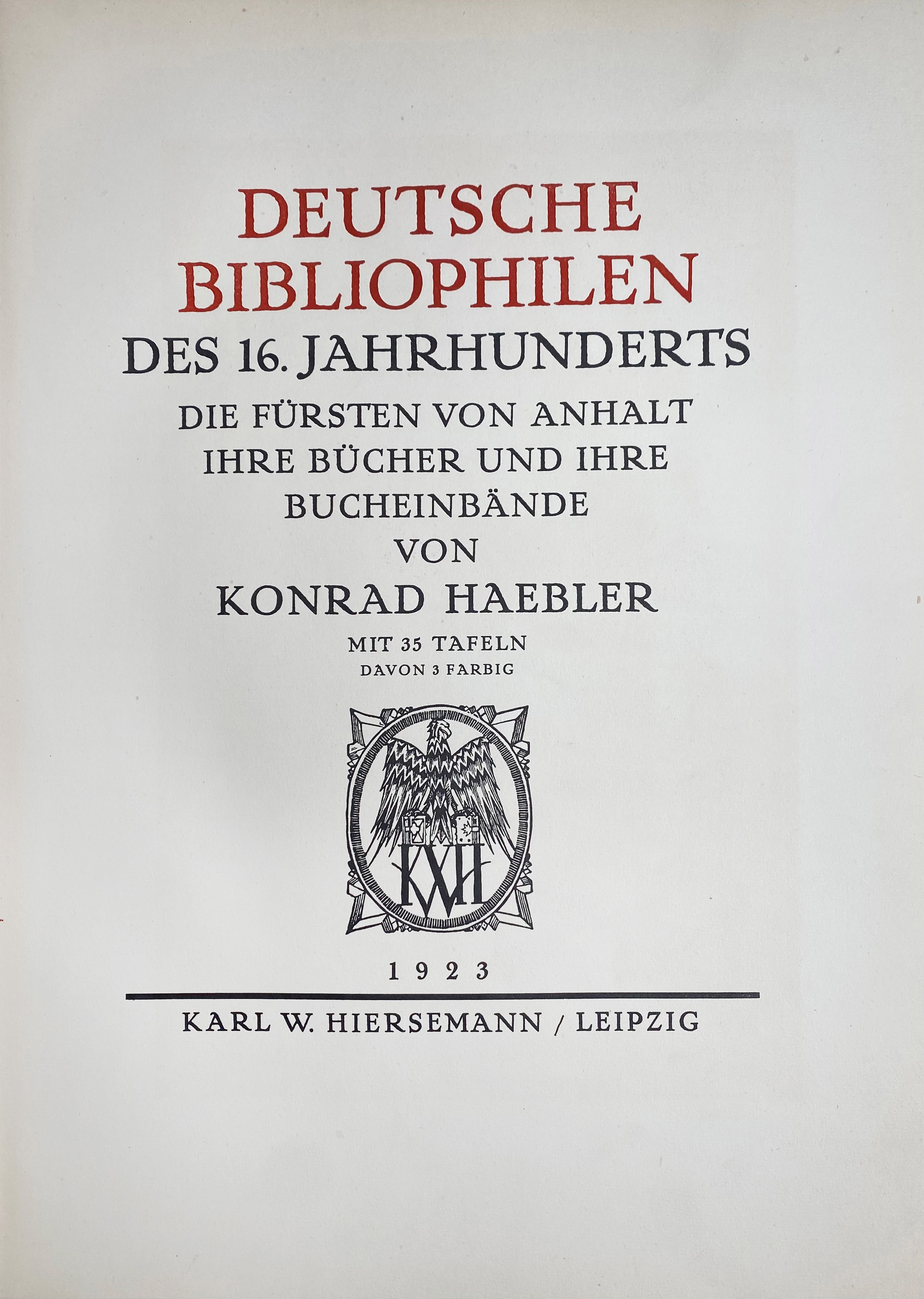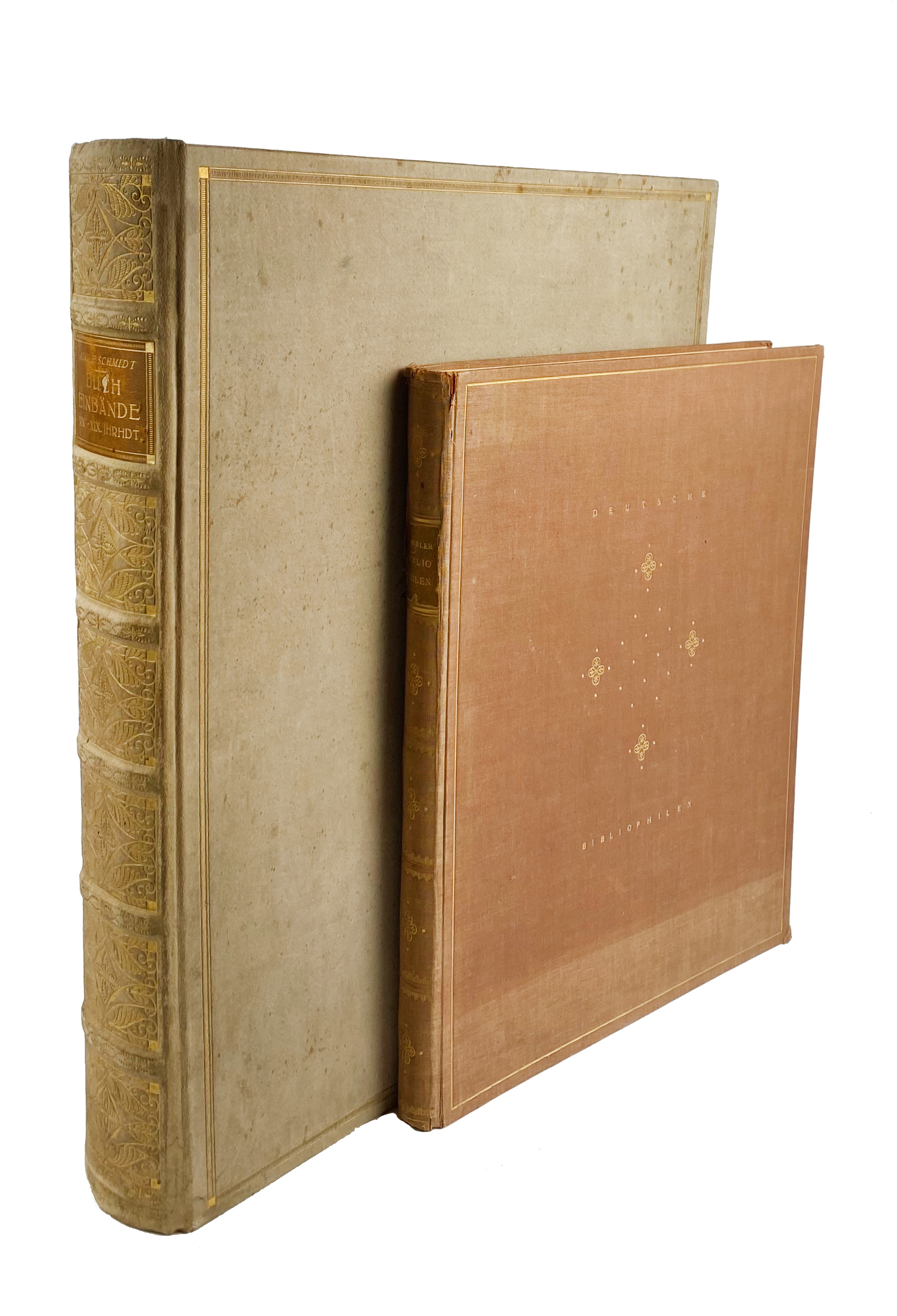 BINDINGS -- SCHMIDT, A. Bucheinbände aus dem XIV.-XIX. Jh. in der Landesbibliothek Darmstadt. Lpz., 1921. W. 100 (cold.) plates. Fol. Ocl. (Stain on front side, bind. a bit soiled/foxed). -- Added: K. HAEBLER. Deutsche Bibliophilen des 16. Jh. Die Fürsten von Anhalt, ihre Bücher und ihre Bücheinbände. Lpz., 1923. W. 35 plates (incl. 3 cold). 4°. Ocl. (Bind. a bit faded, spine ends sl. dam.). -- (2).