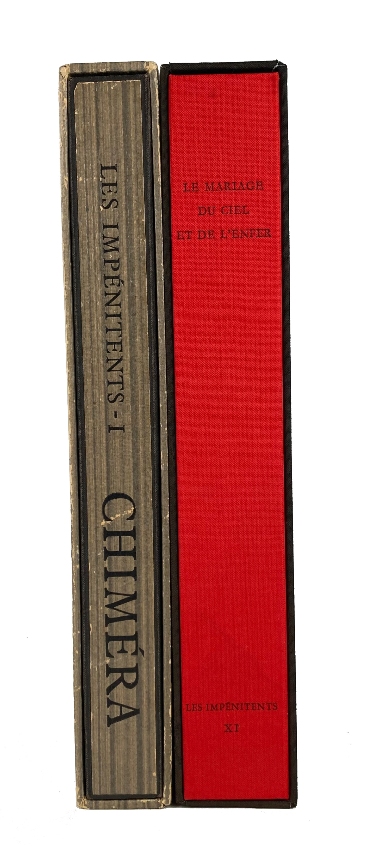 IMPÉNITENTS -- CARROLL, L. Chiméra. 1955. W. front. by. E. Goerg & plates by M. Avati. Fol. Owrps. in cl. portfol. in or. slipcase. (Slipcase w. some wear to extremities, portfolio w. some wear to joints). (L'Impénitents, I). -- W. BLAKE. Le Mariage du ciel et de l'enfer. (1965). W. front. by C. Weisbuch & plates by Y. Chanay. Fol. Owrps. in cl. portfol. in or. slipcase. (L'Impénitents, XI). -- (2).