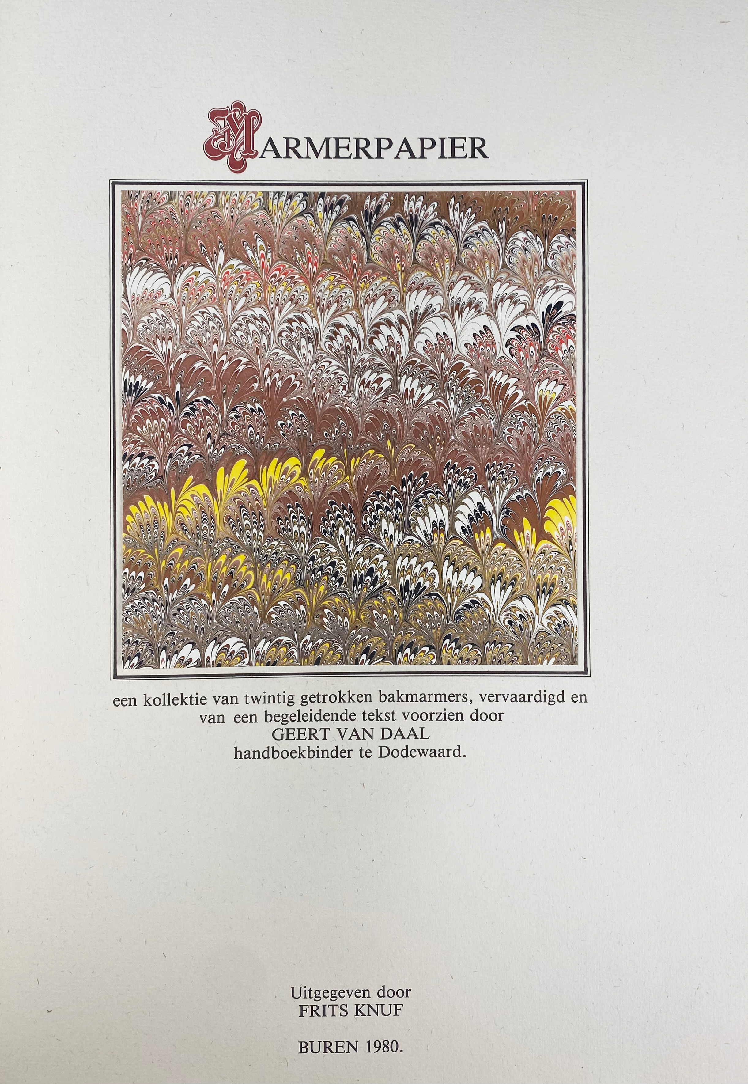 PAPER -- DAAL, G. v. Marmerpapier. Een kollektie van twintig getrokken bakmarmers, vervaardigd en van een begeleidende tekst voorzien. Buren, F. Knuf, 1980. 29 text-pp. & 20 tipped in marbled papersamples. Fol. Ocl. w. marbled paper 'banderole' & slipcase. Printed in a limited & numb. edition of 55 copies, signed by the artist/author. Our copy nr. "twaalf". -- Added: A. HAEMMERLE & O. HIRSCH. Buntpapier. Herkommen, Geschichte, Techniken, Beziehungen zur Kunst. (2. Aufl. 1977). W. 18 tipped in cold. samples & many text-ill. 4°. Obrds. w. dust-j. -- And 2 o. (4).