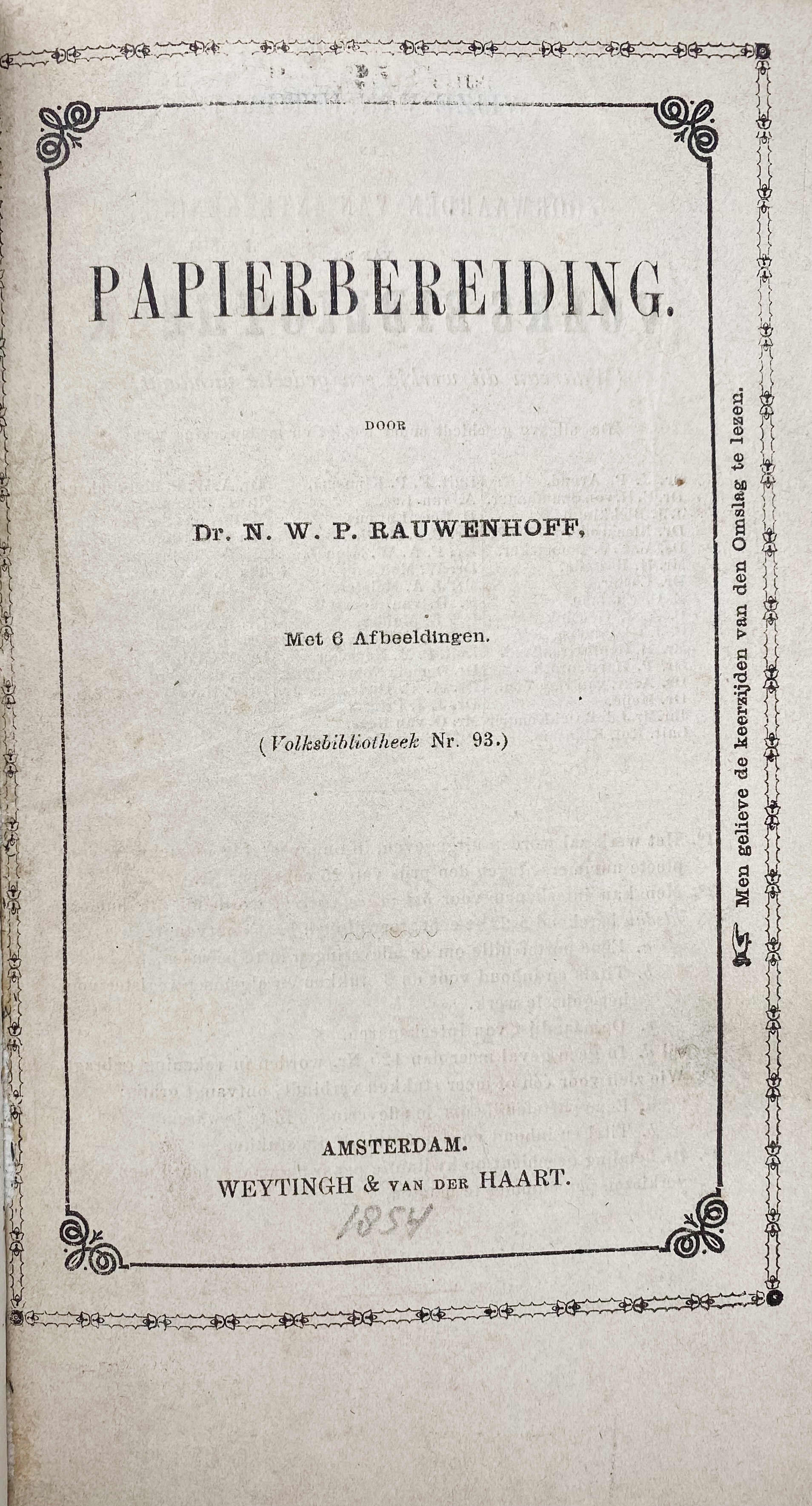 PAPER -- RAUWENHOFF, N.W.P. Papierbereiding. Amst., 1854. W. 6 ills. Beautiful full red mor. w. gilt dec. Rare. -- Th. ROUTLEDGE. Bamboe en ampas als grondstoffen voor papierbereiding. Vert. d. A.S. v. Westrum. 1876. Cl. -- J.H. v. ZELM v. ELDIK. Het onderzoek van papier. 1919. Ohcl. -- W. HESS. Die Papier-Prägetechnik. Praktisches Handbuch für die gesamte Papier-Prägetechnik. 1911. Ohcl. -- K. TROBAS. Papierrestaurierung in Archiven, Bibliotheken und Sammlungen. Probleme und Methdoen. 1980. Ocl. w. dust-j. -- And 1 o. (5).