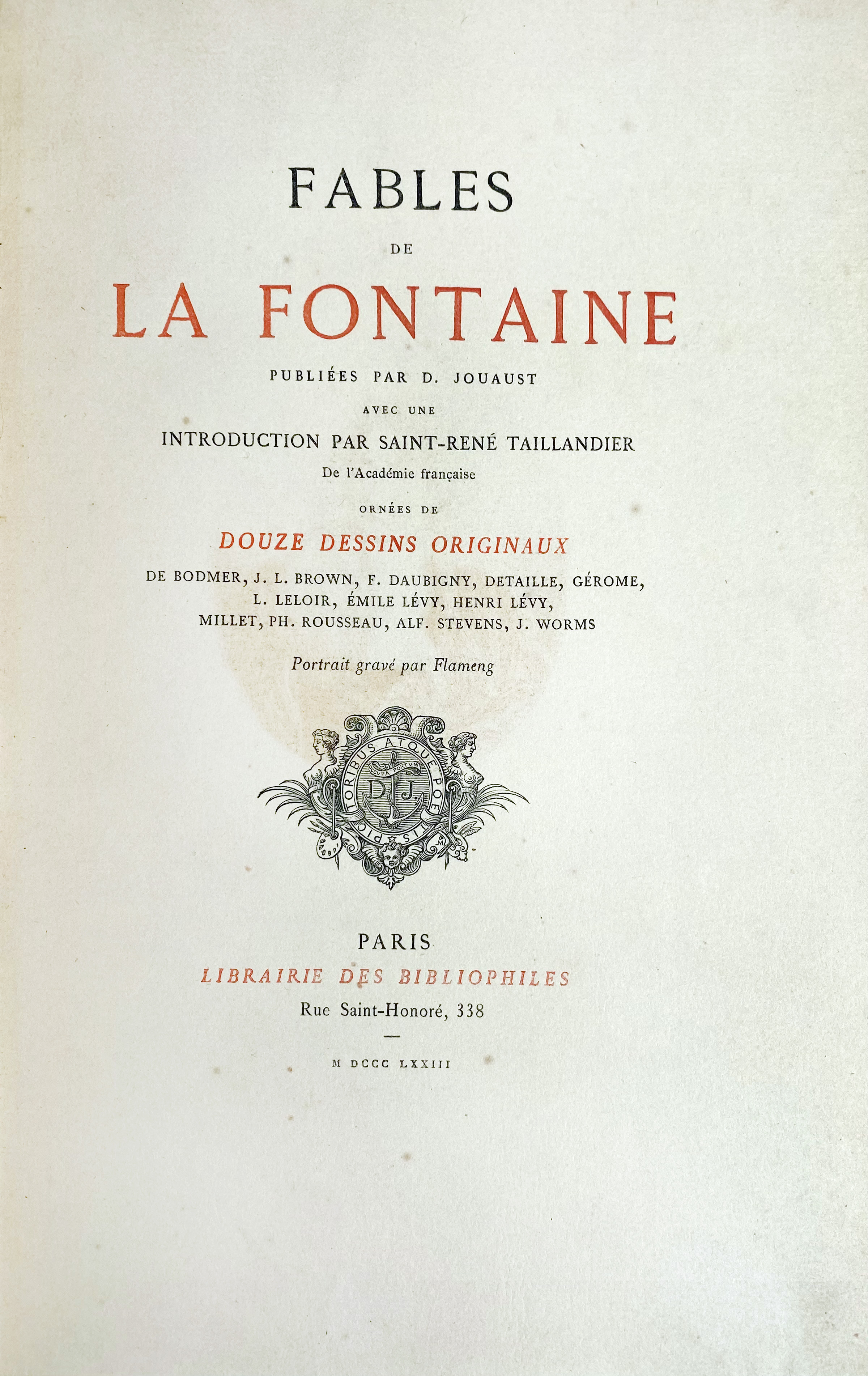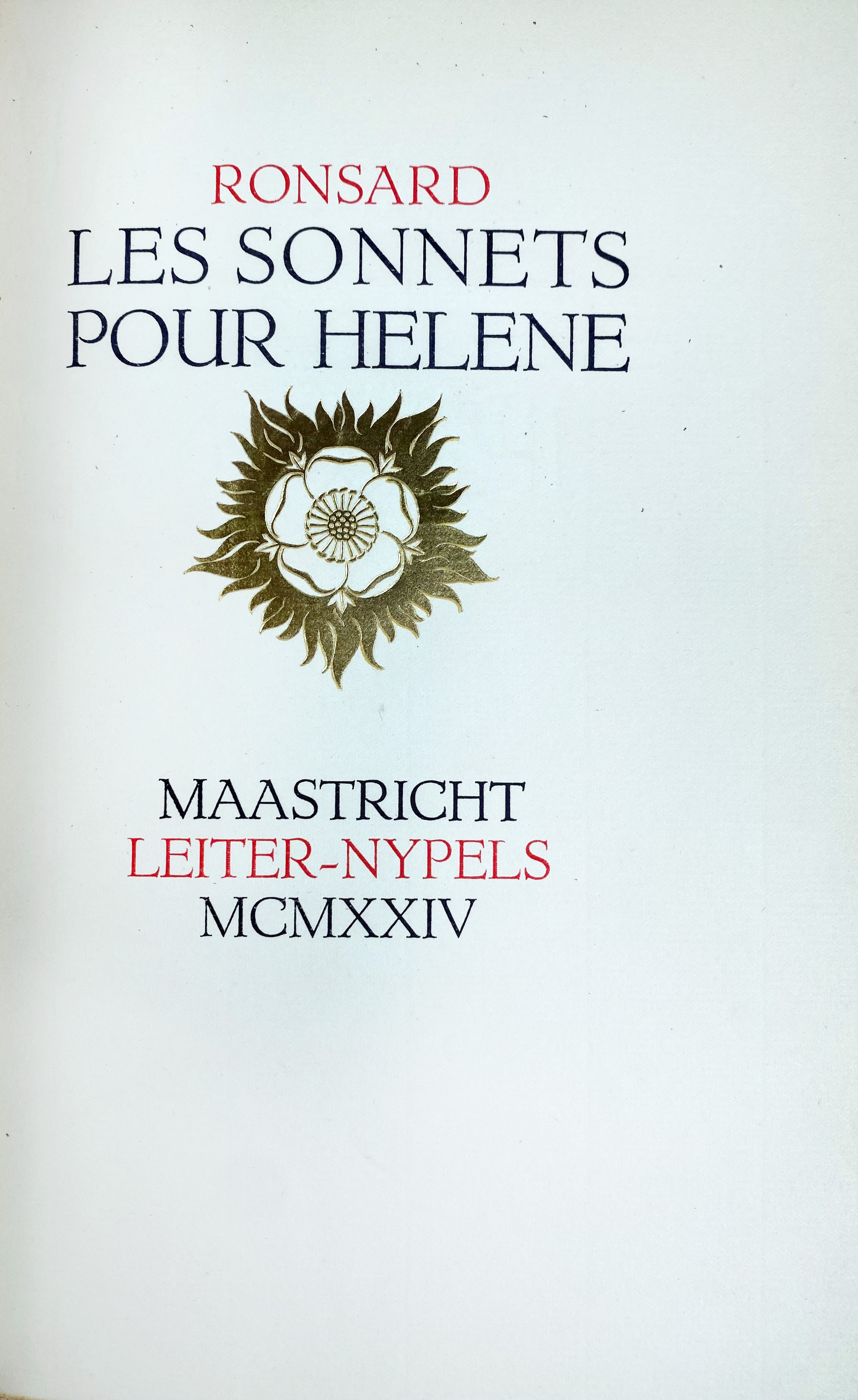 RONSARD, P. de. Les sonnets pour Hélène. Maastr., Leiter-Nypels, 1924. Cont. brown h. mor extra, w. raised bands, t.e.g., uncut. Printed in a lim., numb. ed. of 380 copies on Dutch handmade paper in blue, red & black; ti. in red & black w. large gilt vignette. - Charles Nypels 11. -- Added: J. de LA FONTAINE. Fables. Publ. p. D. Jouaust avec une introd. p. S.-R. Taillandier. Par., Libr. des Bibliophiles, 1873. 2 vols. W. engr. front. portr., 12 fine full-p. engr. by Bodmer, Brown, Daubigny, Detaille, Gérome, etc. and various head- and tailpieces in the text. Lge-8°. Cont. h. mor. w. raised bands, green labels, t.e.g., fine marbled endpapers, owrps. bound up. -- (3).