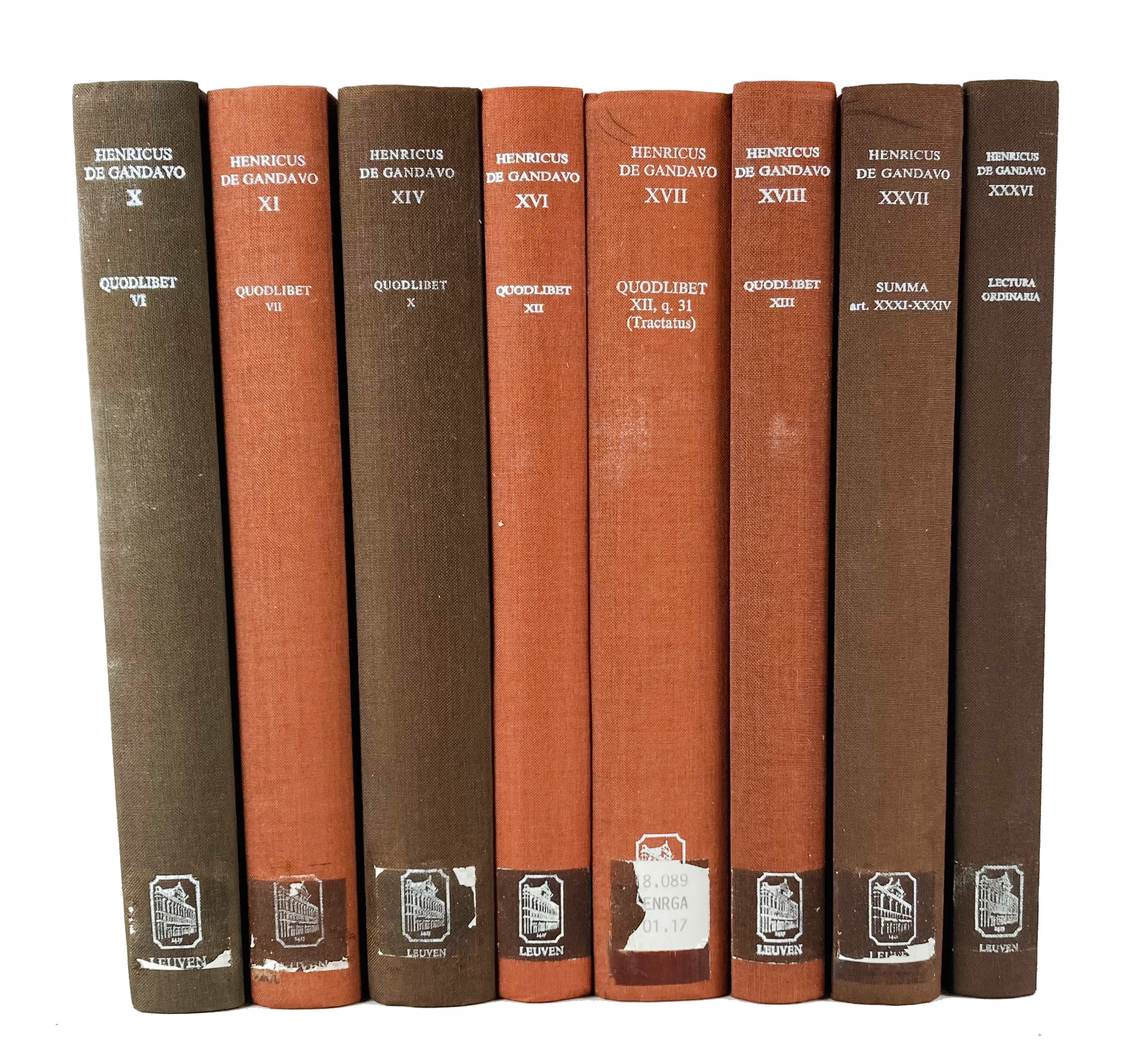 GANDAVO, H. de. Opera omnia. Vols. X, XI, XIV, XVI, XVII, XVIII, XXVII, XXXVI. Leuven, 1980-91. 8 vols of the series. Ocl. (Neat ex library set w. remnants of tickets on spine & the usual stamps, several spines sunned, insides clean).