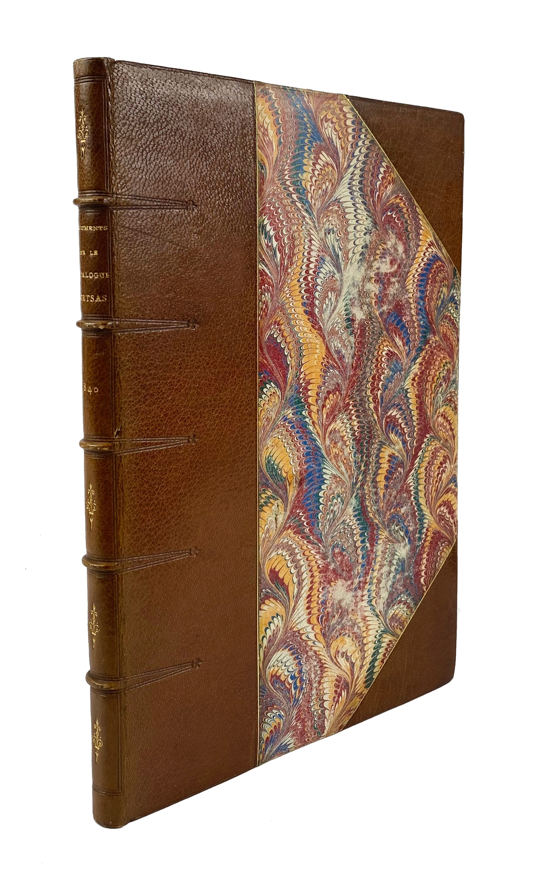 SALE CATALOGUES -- FORTSAS SALE -- DOCUMENTS et particularités historiques sur le catalogue du comte de Fortsas. Mons, E. Hoyois, (1857). (4), 222 pp. W. wood-engr. ti-vign. & num. wood-engr. ills. Printed on yellow paper. Bound by Bosquet in beautiful h. brown mor. extra w. raised bands, dec. gilt back, marbled paper on sides & t.e.g.