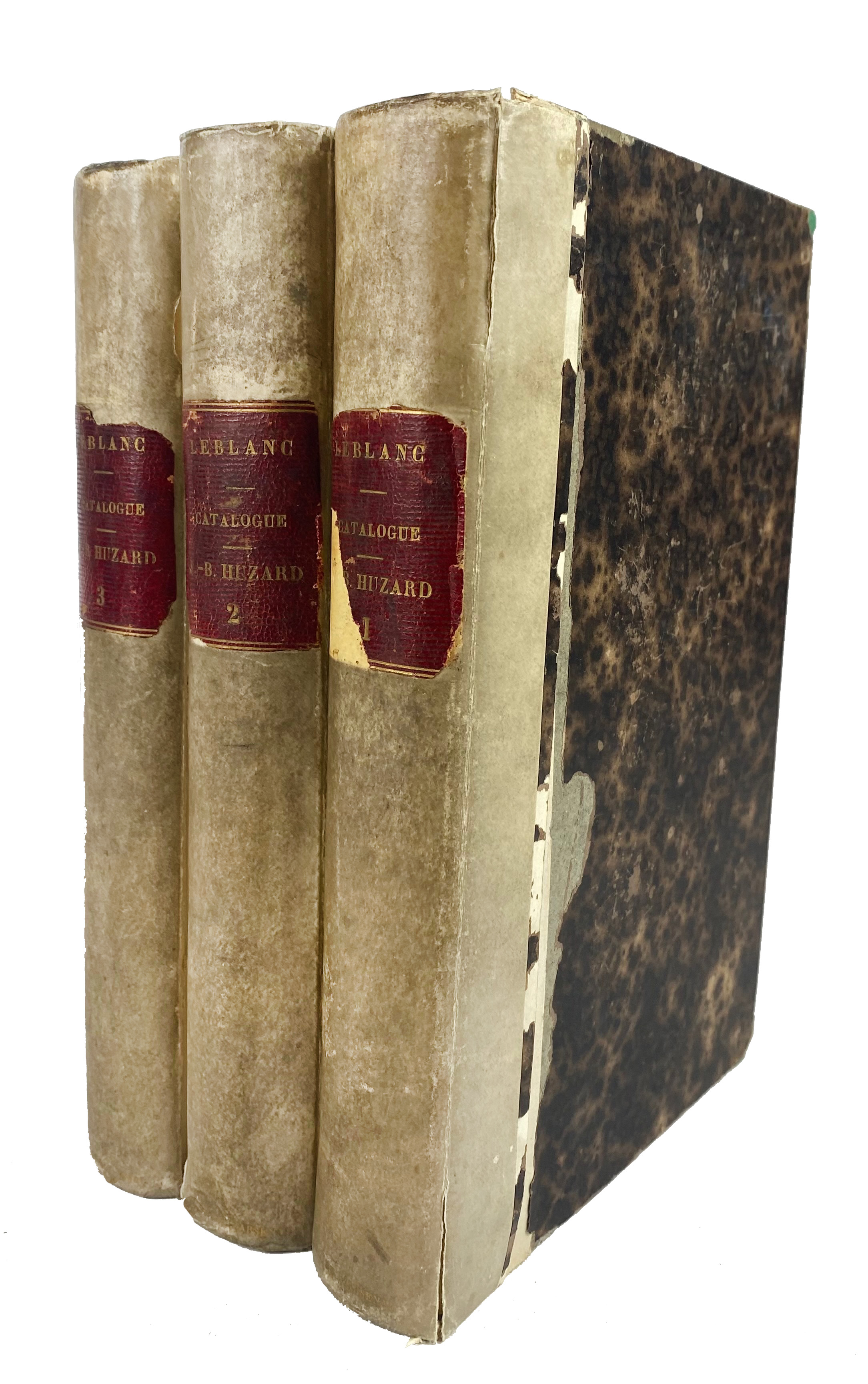 SALE CATALOGUES -- LEBLANC, P. Catalogue des Livres, Dessins et Estampes de la Bibliothèque de feu M. J.-B. Huzard. Pt. 1-3. Paris, Wid. Bouchard-Huzard, 1842-43. 3 vols. lvi, 592; xii, 554; xvi, 555, (1), 16, 8, 8, 8 pp. Cont. h. vellum w. red labels. (Front side vol. 1 loose, part of label vol. 1 gone, spines loosening/a bit torn).