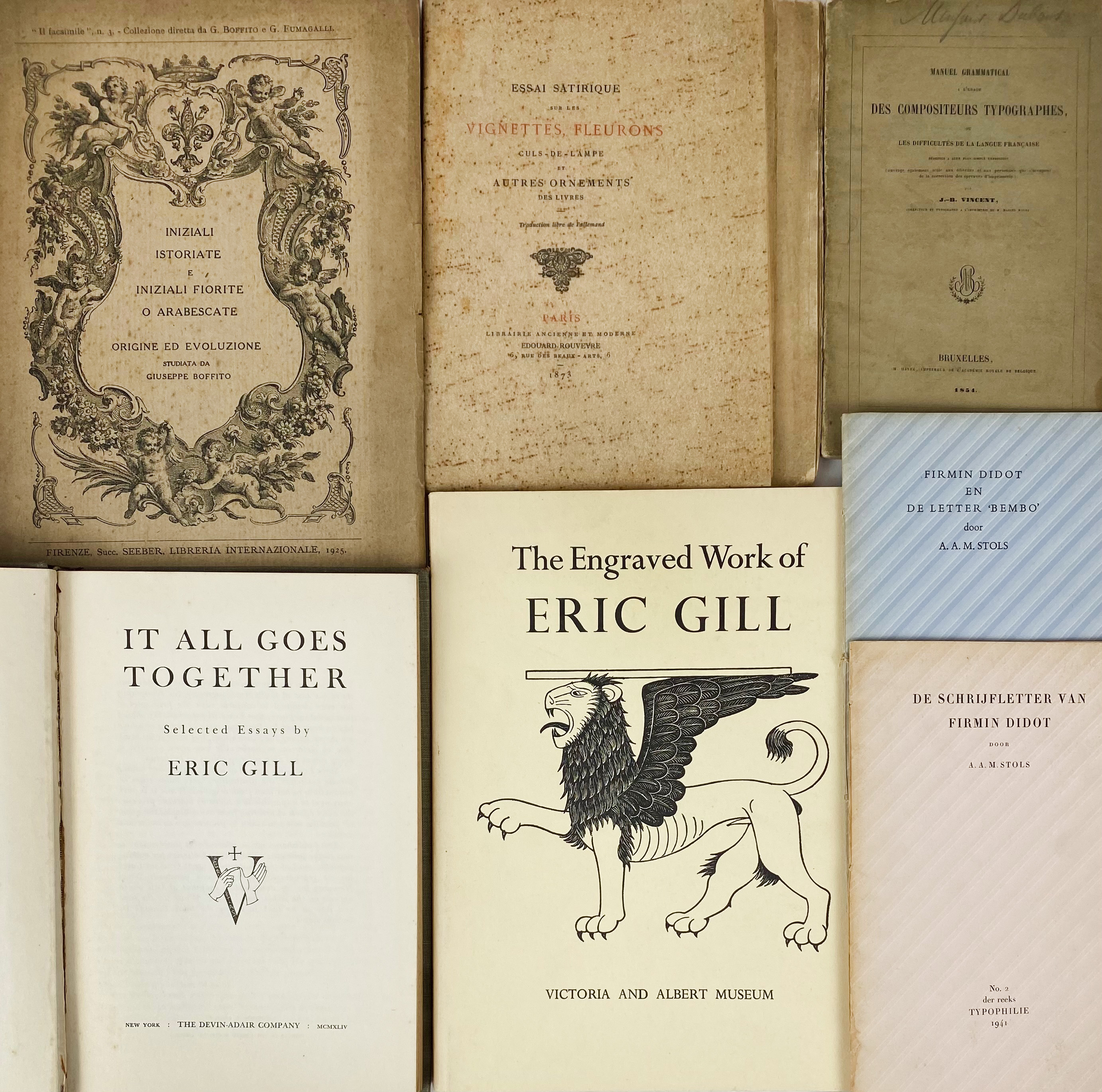 VERVLIET, H.D.L. 16th-c. printing types of the Low Countries. (1968). Prof. ill. 4°. Ocl. w. dust-j. -- R. JIMENES. Claude Garamont, typographe de l'humanisme. (2022). Owrps. -- A.F. JOHNSON. Selected essays on books and printing. Ed. by P. Muir. 1970. W. ill. 4°. Ocl. w. dust-j. -- C. BURKE. Gerard Unger, life in letters. 2021. 4°. Ocl. -- M. LOMMEN Bram de Does. Letterontwerper & typograaf. Typographer & type designer. (2003). Obrds. -- And 4 o. (9).