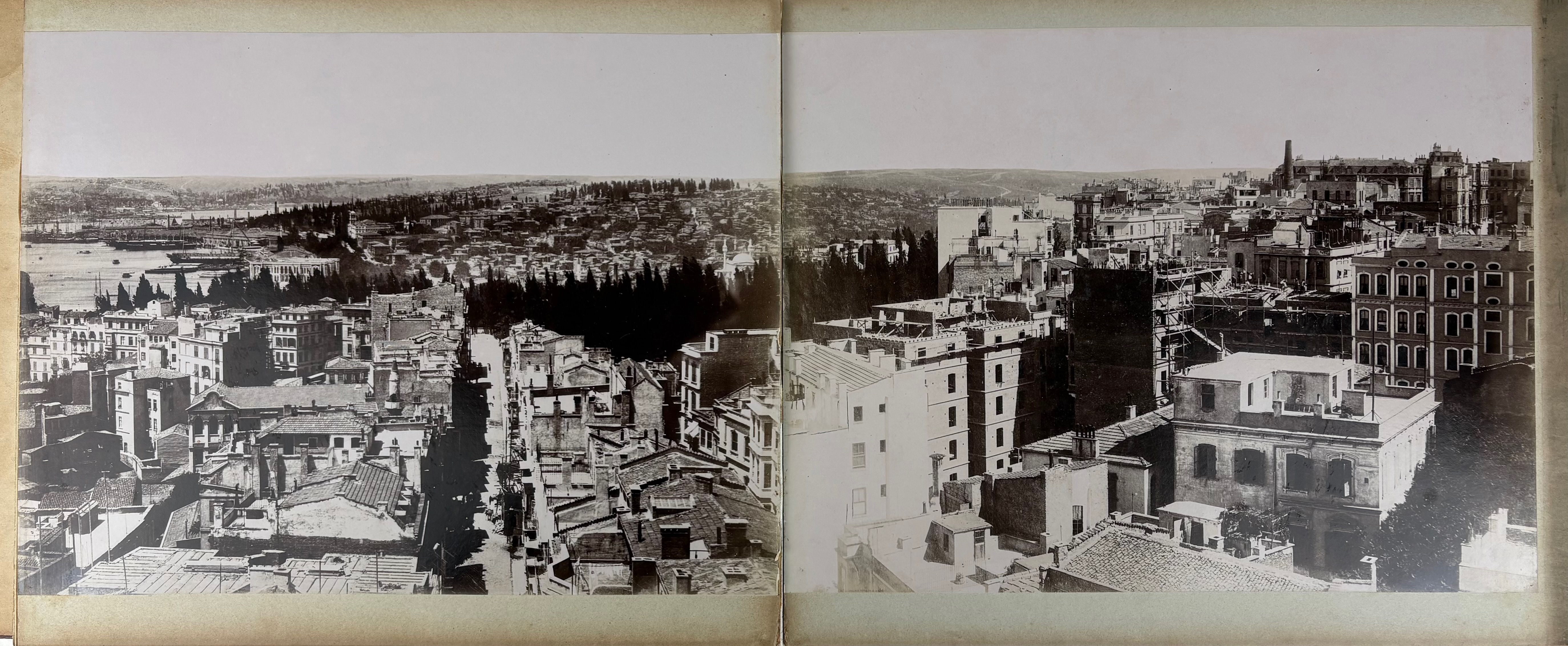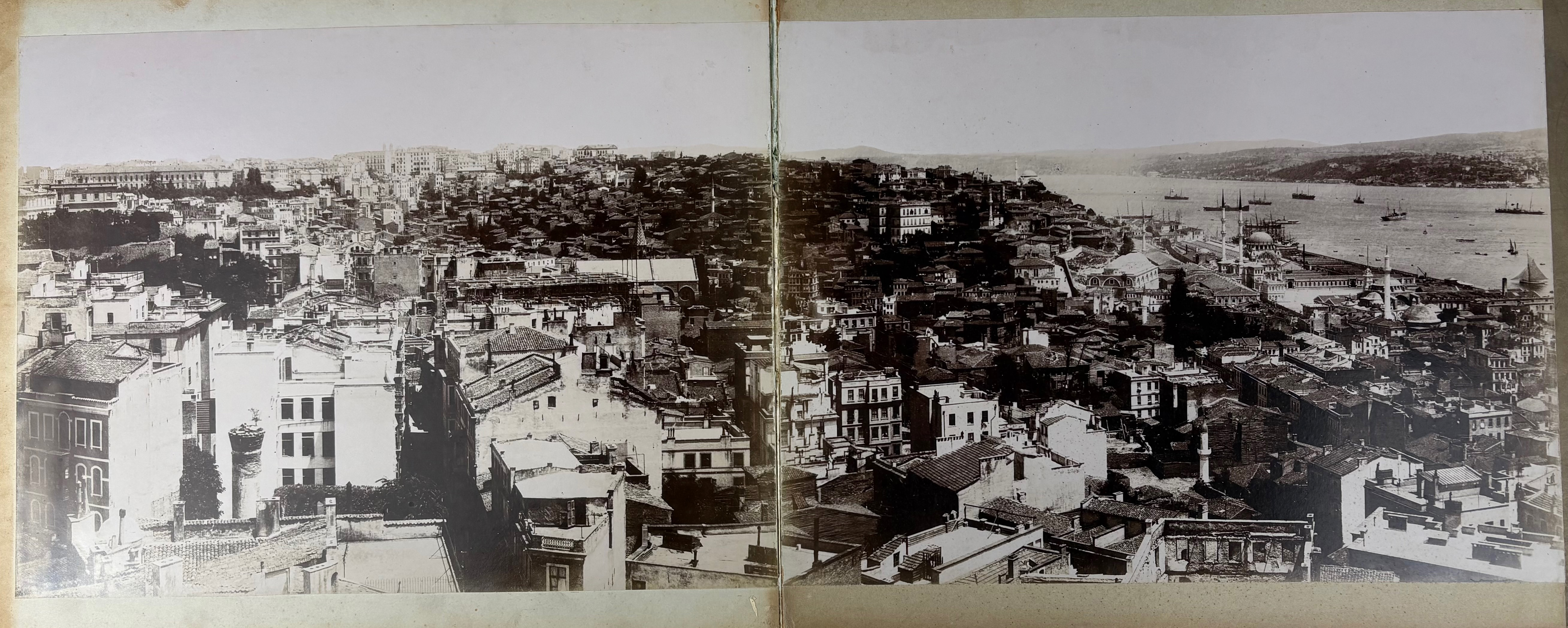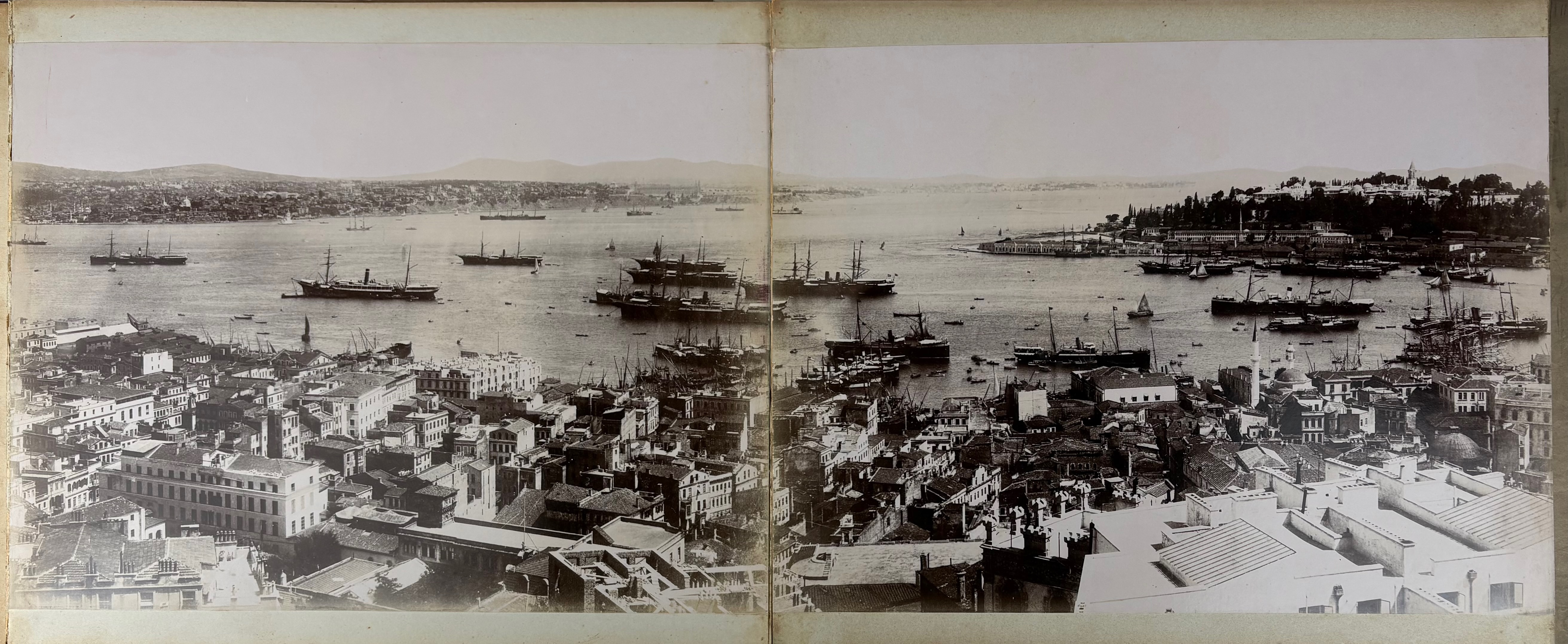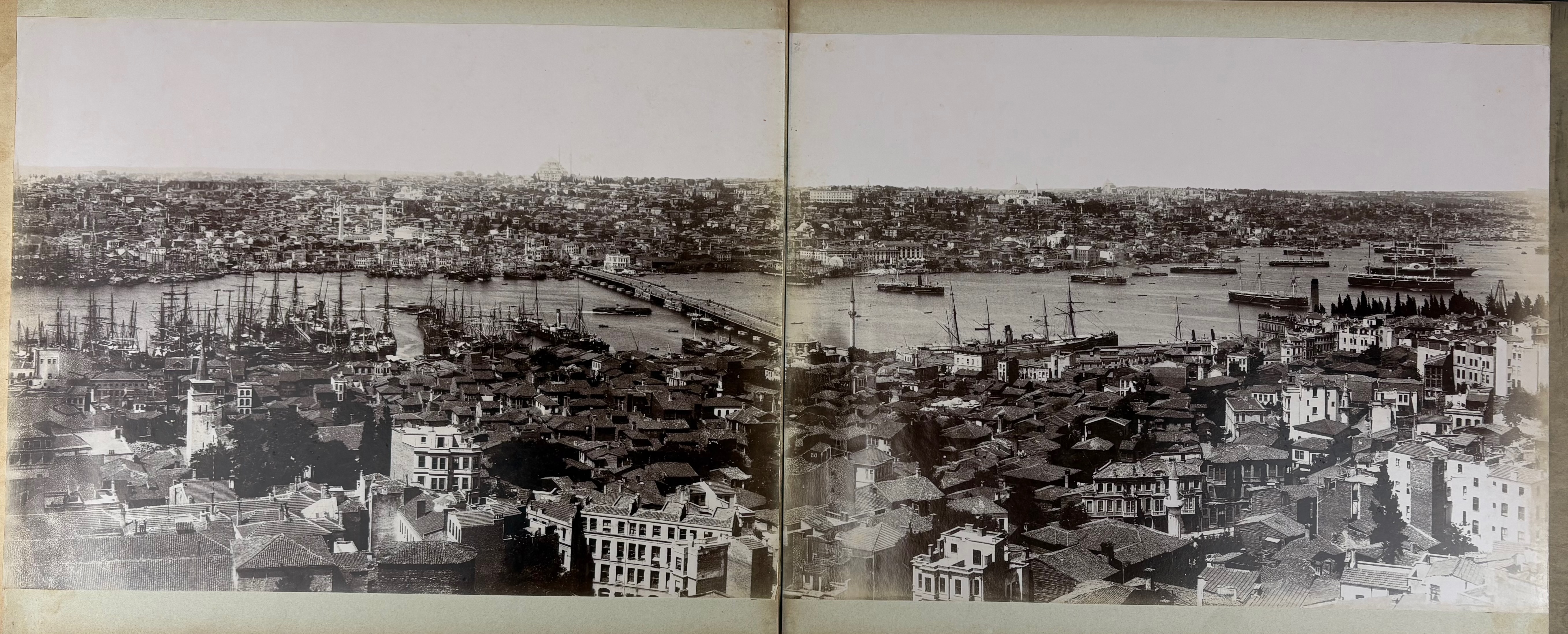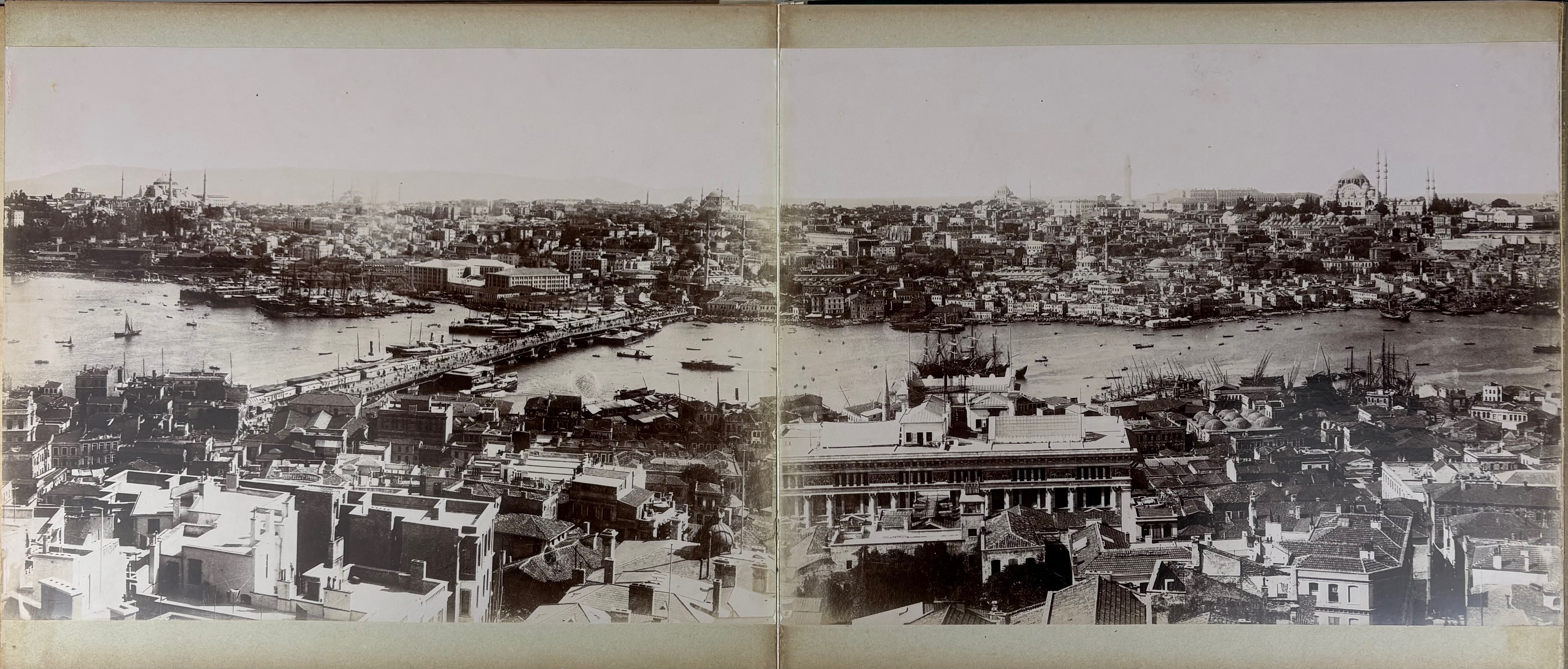 TURKEY -- CONSTANTINOPLE/ISTANBUL -- PANORAMA OF CONSTANTINOPLE. (Constantinople, P. Sebah & P. Joaillier), n.d. (c. 1890). 10 albumen prints, leporello-style, mounted on heavy cardboard forming a panoramic view of Constantinople. Each individual photo measures 244 x 330 mm; total length of the panorama c. 235 cm. The individual sheets are connected with white linen. In richly gilt dec. marbled cf. bind. of the period, front cover w. sunken central relief plaque which is gilt lettered "Constantinopel 1899". In mod. slipcase.