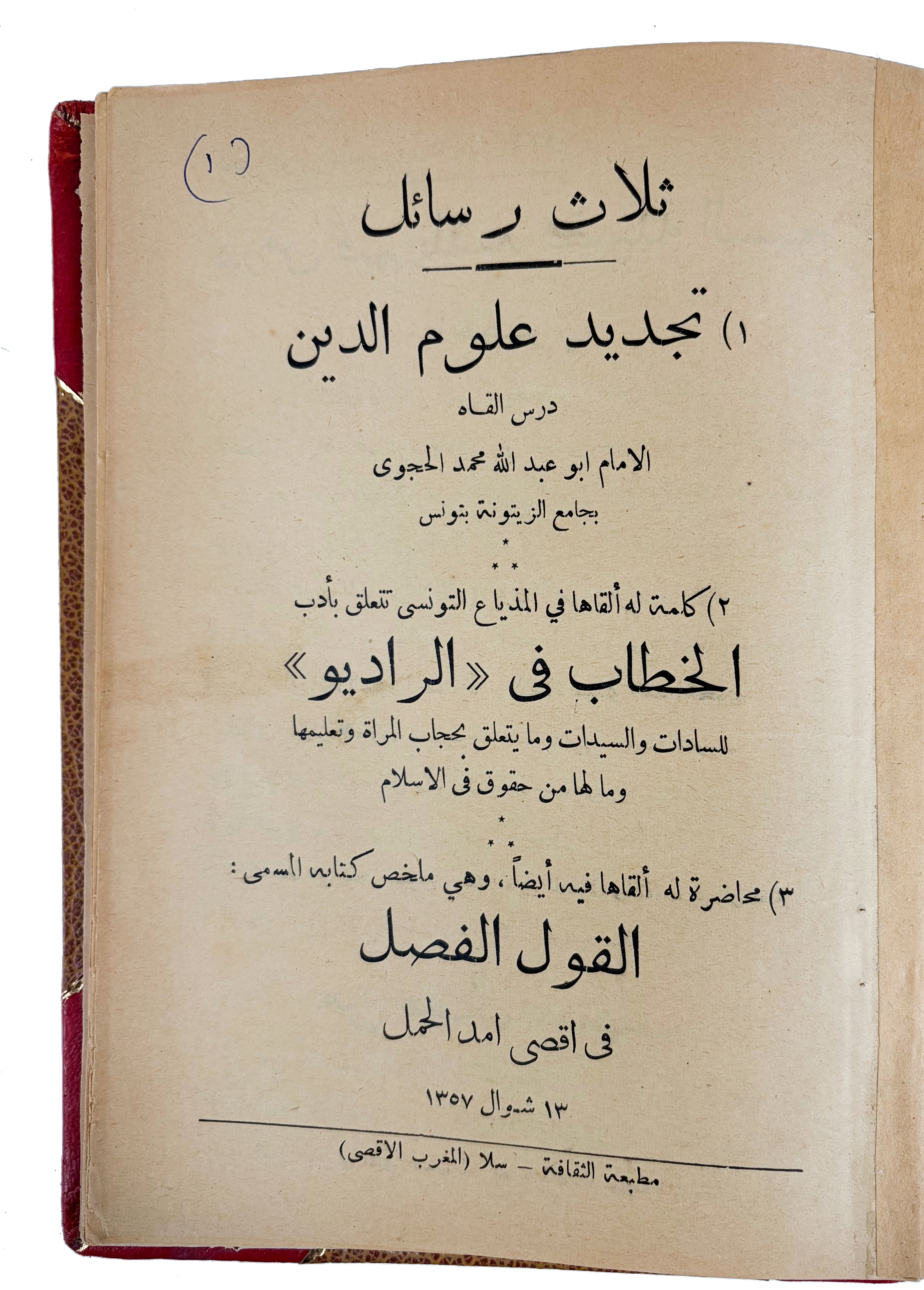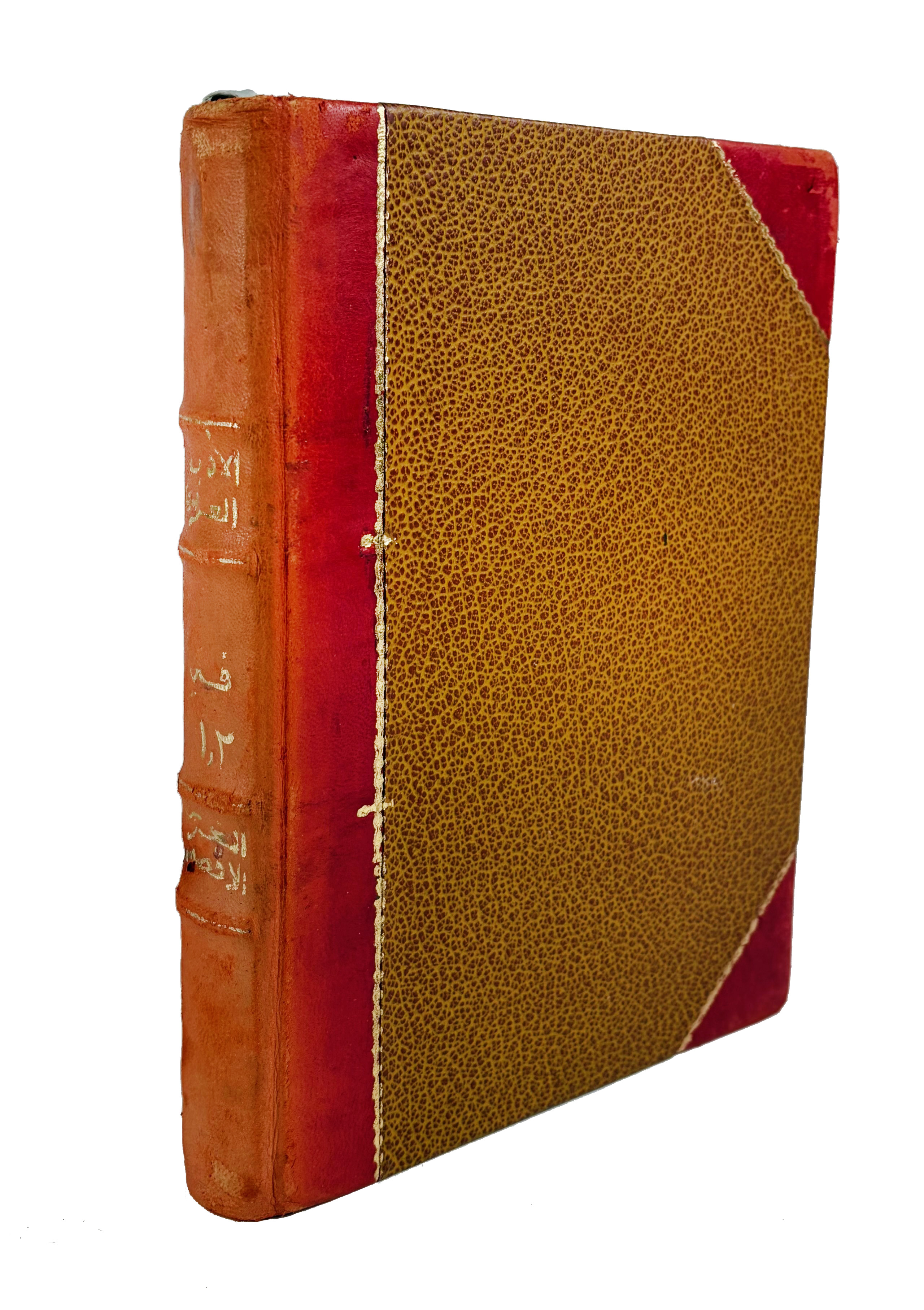 AL-QABBÂJ, Muhammad ibn al-῾Abbâs. Al-Adab al-'arabî fî al-Maghrib al-Aqsâ. Rabat, Al-Matba'a al-Wataniya, 1929. 2 in 1 vol. - Bound with: Muhammad ibn al-Hasan AL-HAJWI. Thalath Rasa'il. Salé, Matba'at al-Thaqafa, 1938. Tog. 3 in 1 vol. Cont. red hcf. extra. (Spine a bit discold., stamps on ti-pp., paper last work a bit browned).