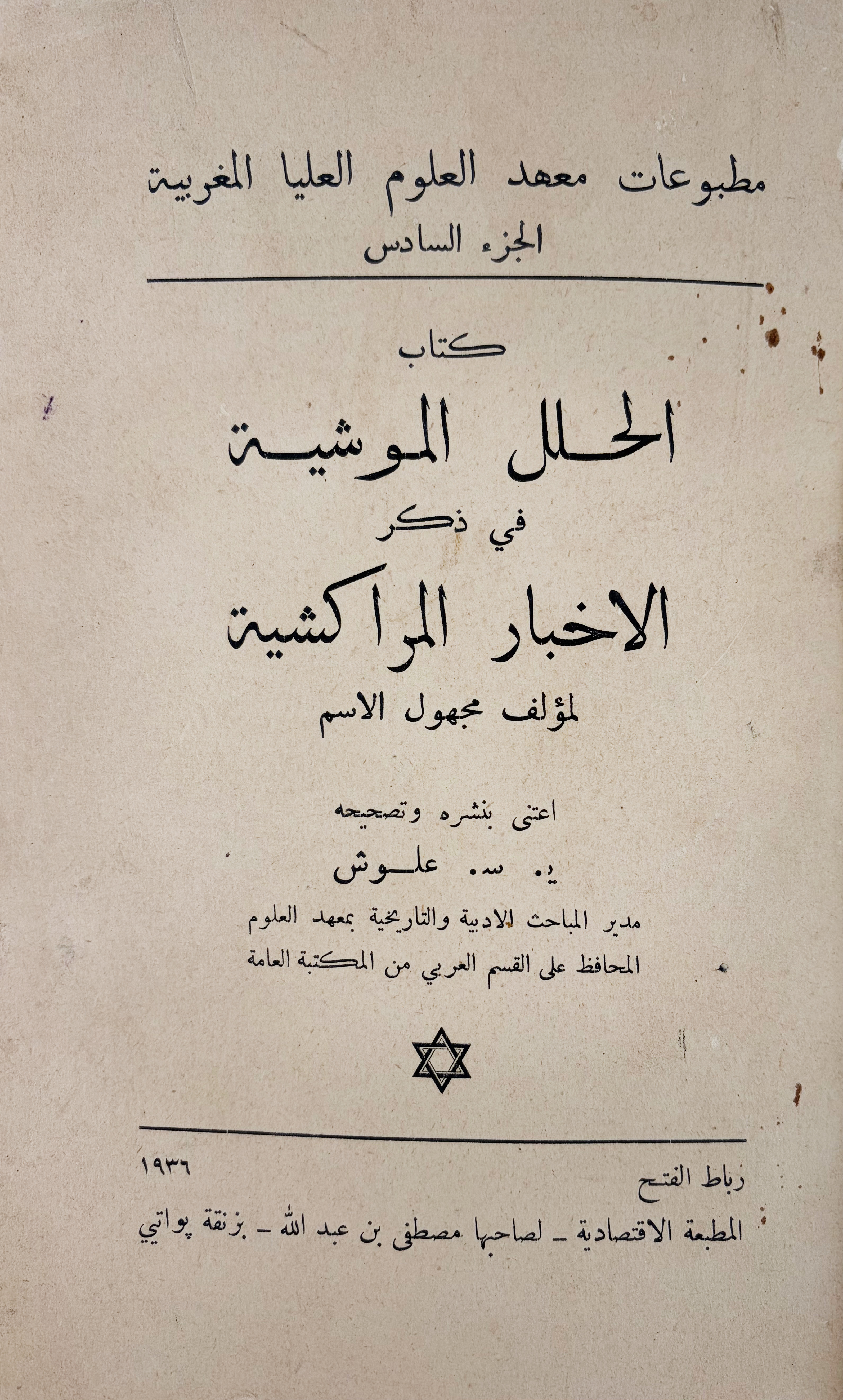 ALMOHADS - ALMORAVIDS -- AL-HULAL al-Mawchiyya. Chronique anonyme des dynasties Almoravide et Almohade. Texte arabe publ. d'après de nouveaux mss. p. I.S. Allouche. Rabat, 1936. (2), iii, 178 pp. Mod. cl. (Sl. age-toned). - Rare.