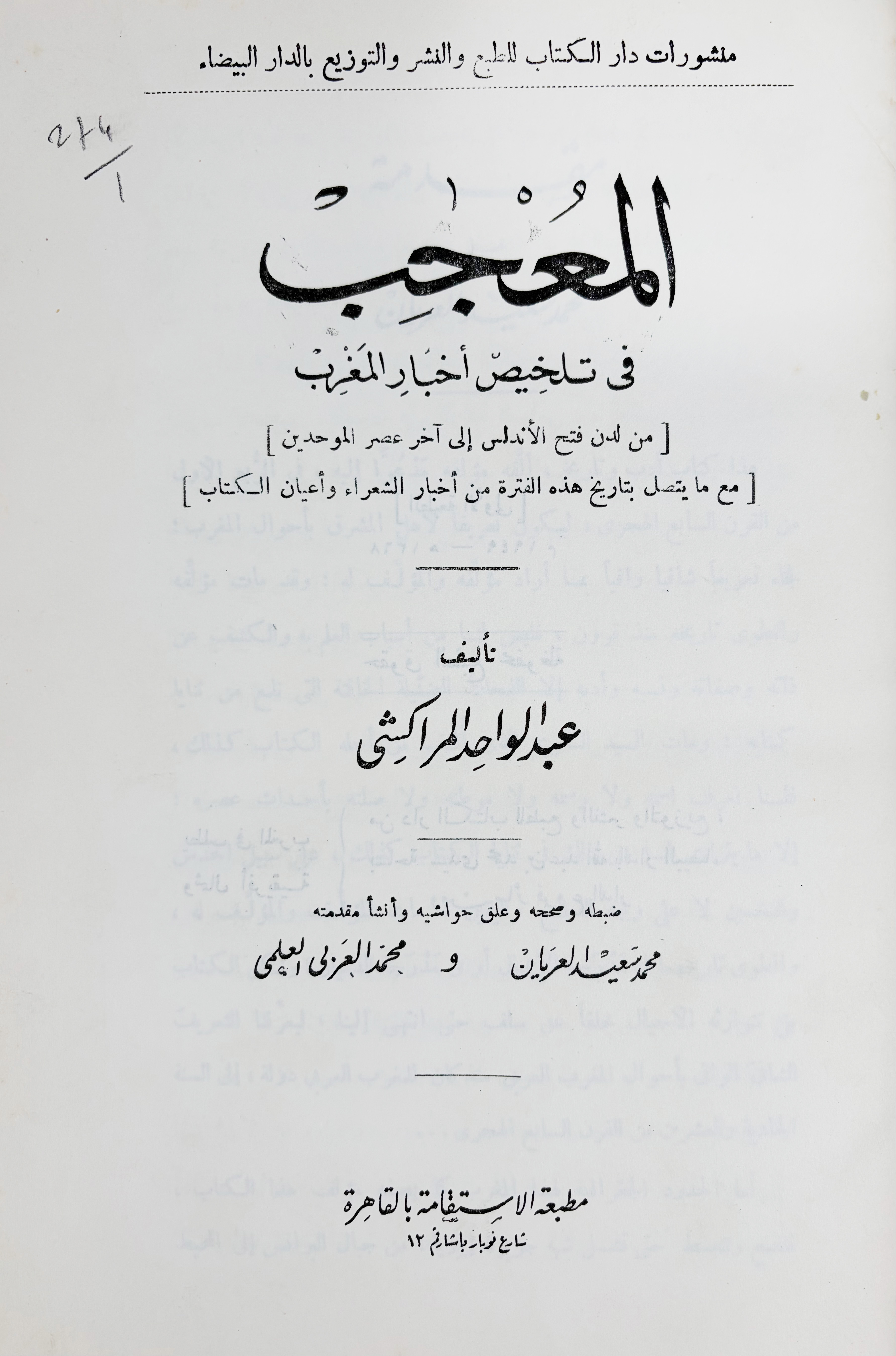 ALMOHADS - ALMORAVIDS -- AL-MURRAKSHI, Abd al-Wahid. Al-Mujib fi talkhis akhbar al-Maghrib. Ed. Al-Arayan, al-Alami. Cairo, 1949. Arabic text. Cont. h. mor. -- G. CODERA Y ZAIDÍN. Ocl. w. dust-j. -- J. BOSCH VILÁ. Los Almorávides. Ed. facs. Estudio preliminar p. E.M. López. 1995. Owrps. -- V. LAGARDERE. Le vendredi de Zallâqa 23 Oct. 1086. Owrps. -- Id. Les Almoravides jusqu'au règne de Yûsuf B. Tâsfîn (1039-1106). (1989). Owrps. -- And 1 o. (6).