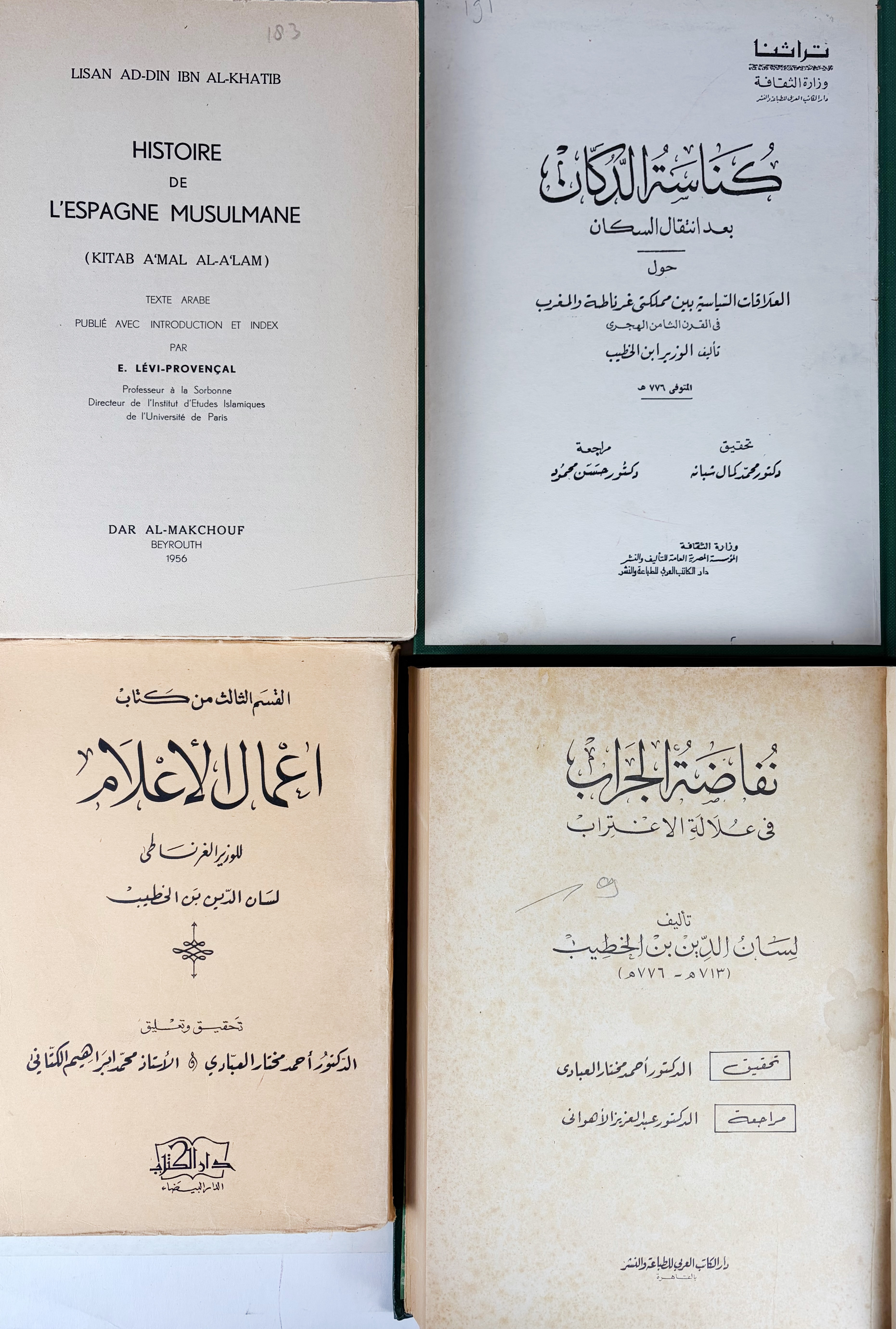 ANDALUSIA -- IBN AL-KHATIB. Kitab miyar al-ikhtiyar fi dhikr al-maahid wa-al-diyar. Fez, 1325/1907. Wrps. w. staple. (Wrps. a bit worn). -- Id. Histoire de l’Espagne musulmane. (Kitab a'mal al-a'lam). Texte arabe publie avec introd. p. E. Lévi-Provençal. Beyrouth, 1956. Lge-8°. Owrps., uncut. -- Id. Nufadat aljarab fi ulalat al-ightirab. Ed. Ahmad Mukhtar al-Abbadi; murajaat Abd al-Aziz al-Ahwani. Vol. 2 (being the only extant part of this work; the first and third volumes are no longer known to exist). Cairo, (c. 1968). Lge-8°. Mod. h. mor. -- And 2 o. by the same. (5).