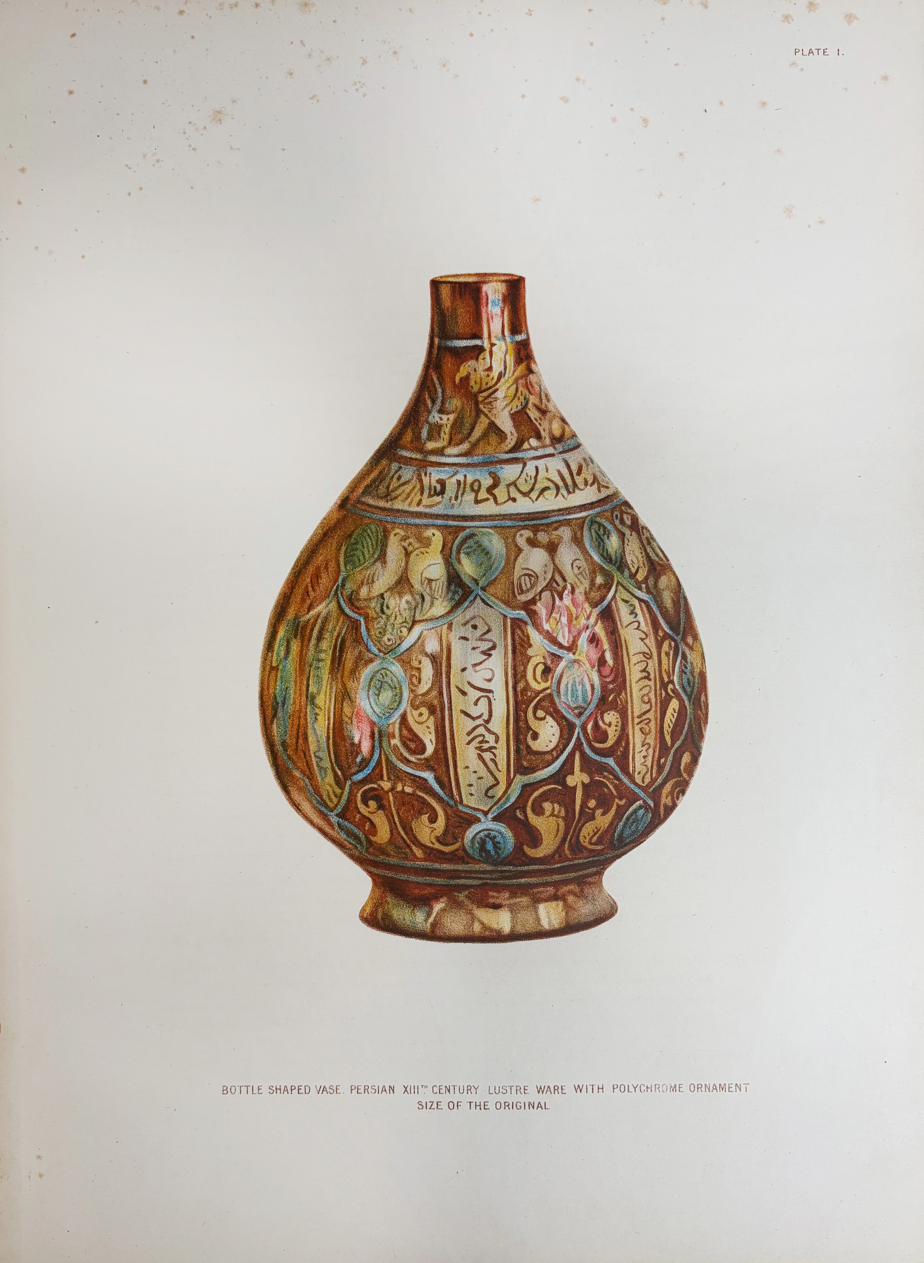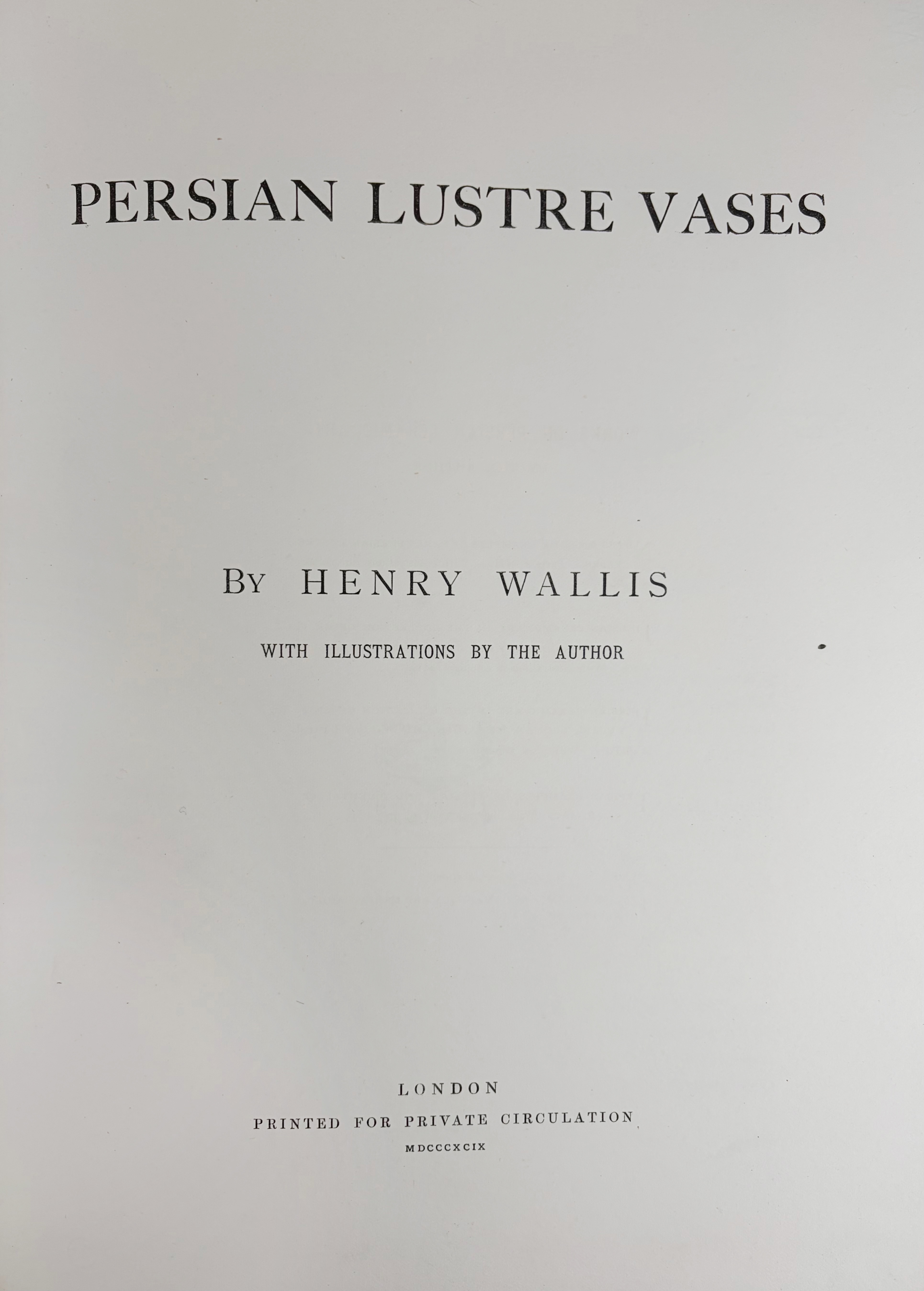 APPLIED ART -- WALLIS, H. Persian lustre vases. Lond., Printed for private circulation, 1899. (4), 18 pp. W. 25 tinted illustr. & 4 chromolithogr. plates. Fol. Or. printed brds. (Spine gone, some foxing). - Printed in a limited edition of 200 copies.