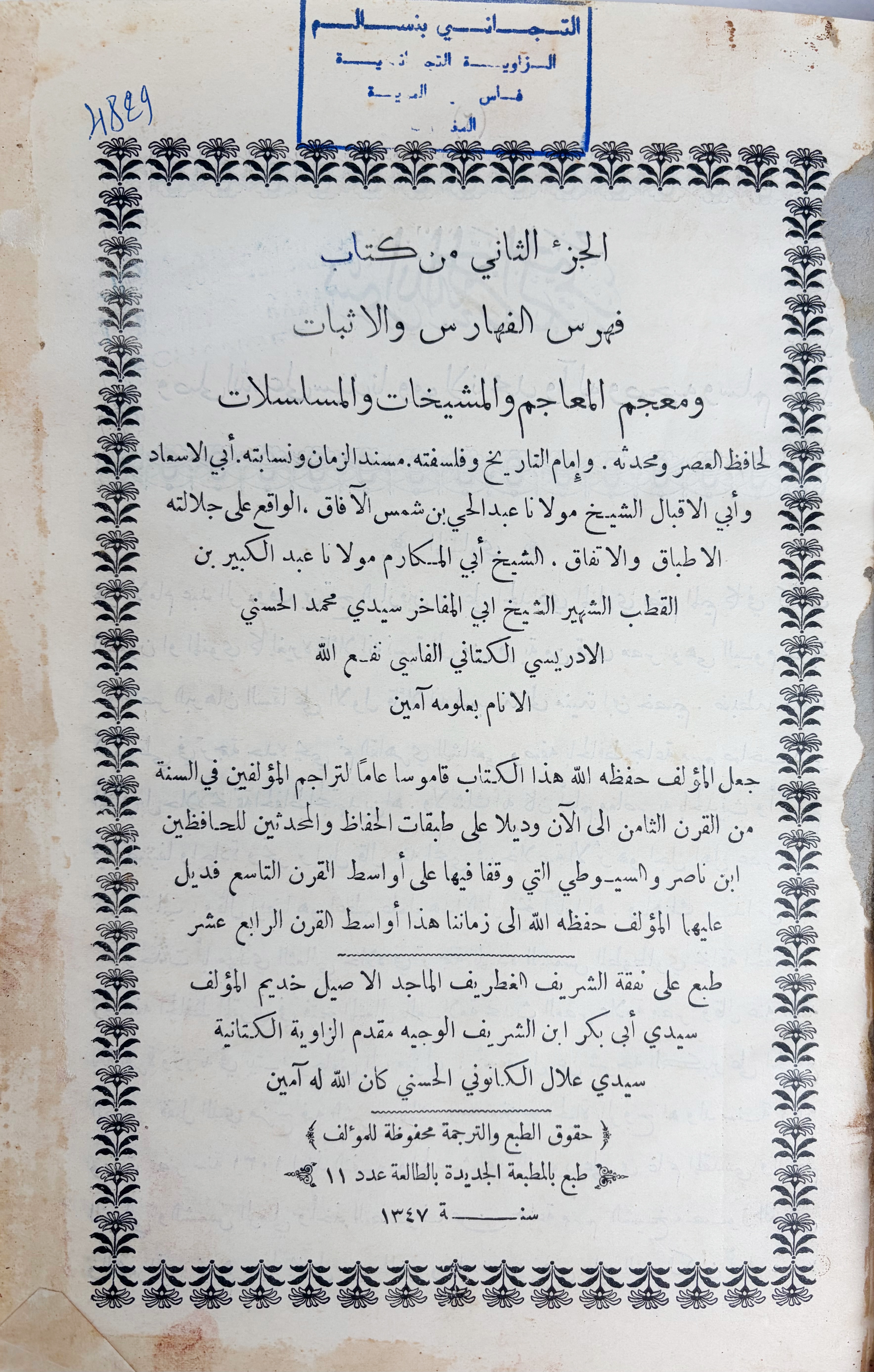 BIBLIOGRAPHY-- AL-KATTANI, Muhammad 'Abd al-Hayy. Fihris al-faharis wa-al-athbat wa-mu'jam al-ma'ajim wa-al-mashyakhat wa-al-musalsalat. Fez, Al-Matba'a al-Jadida, 1346-47/1927-28. 2 vols. 32, 437; 476 pp. Lge-8°. Cont. hcf. (Spines a bit chafed, weak hinges to vol. 1, last leaf vol. 2 rep., w. stamps of Zawiya al-Kattaniyya (?)). - First edition.