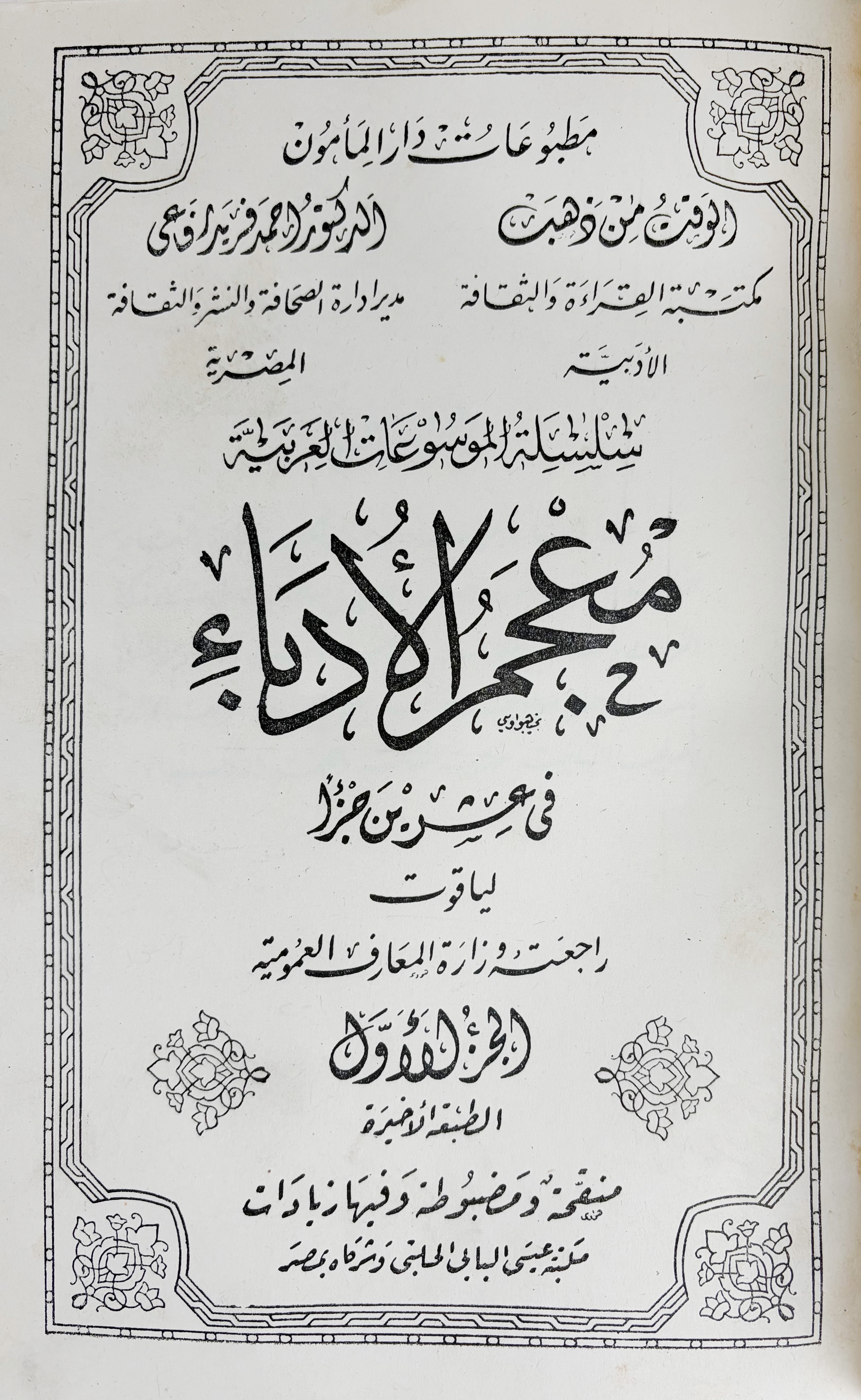 DICTIONARIES - REFERENCE WORKS -- AL-RÛMÎ, YÂQÛT. Mu'jam al-Udaba. [Dictionary of Learned Men]. Cairo, 1936-38. 20 parts in 10 vols. Cont. black h. mor. w. gilt lettering.